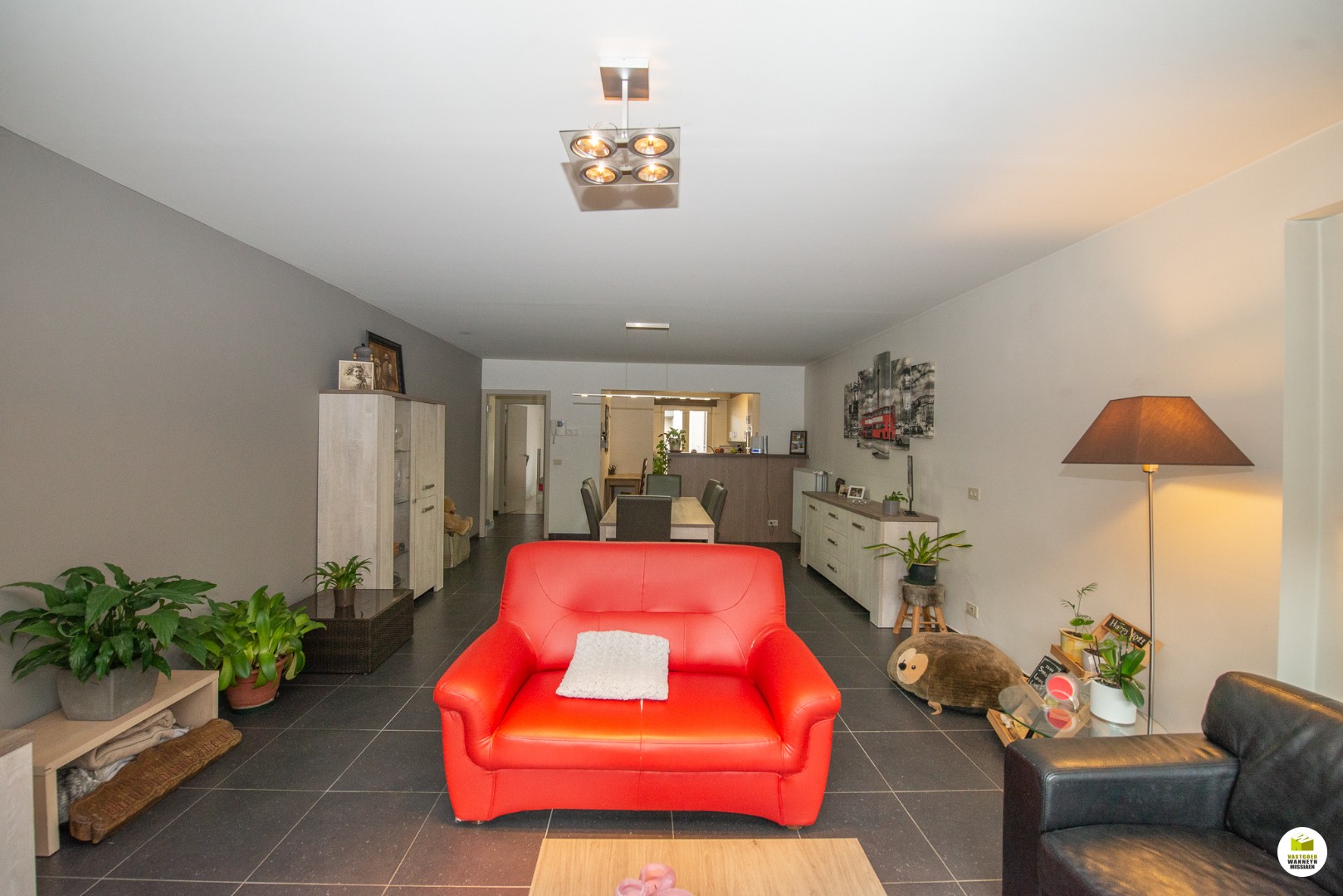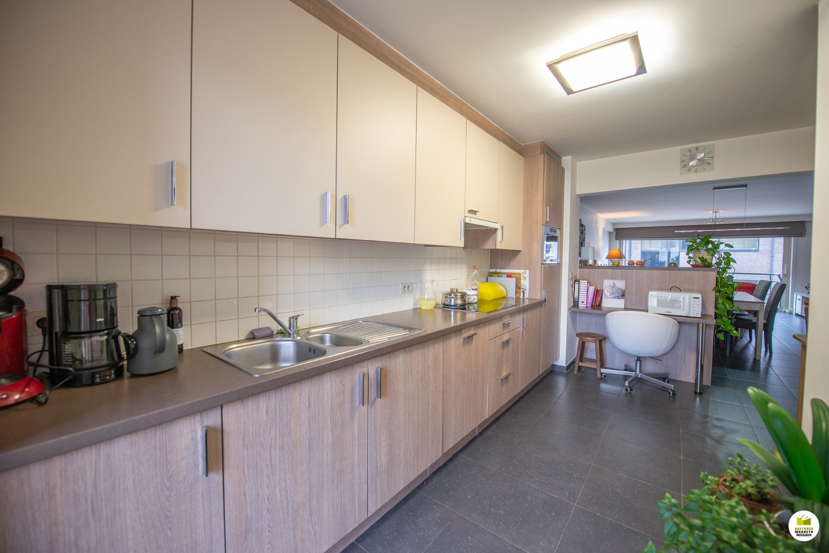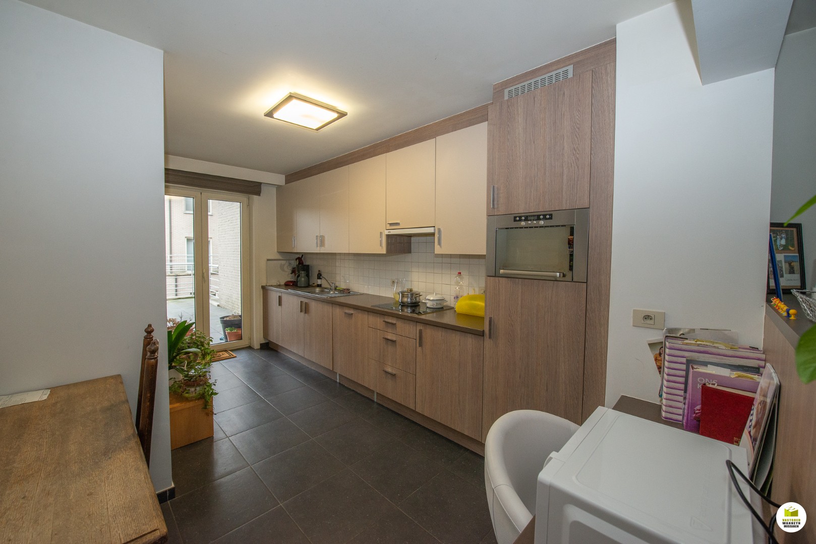 Vooraan de woonkamer heeft u toegang tot het voorste, kleinere terras en de achterkant van de woonkamer sluit mooi aan met de moderne, uitgeruste keuken (oven, vaatwasser, kookplaat, frigo).