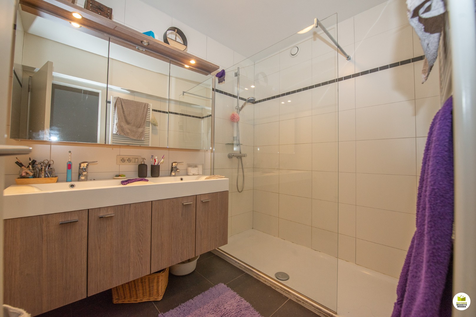 In de badkamer bevinden zich de inloopdouche en de wastafel met 2 lavabo's.