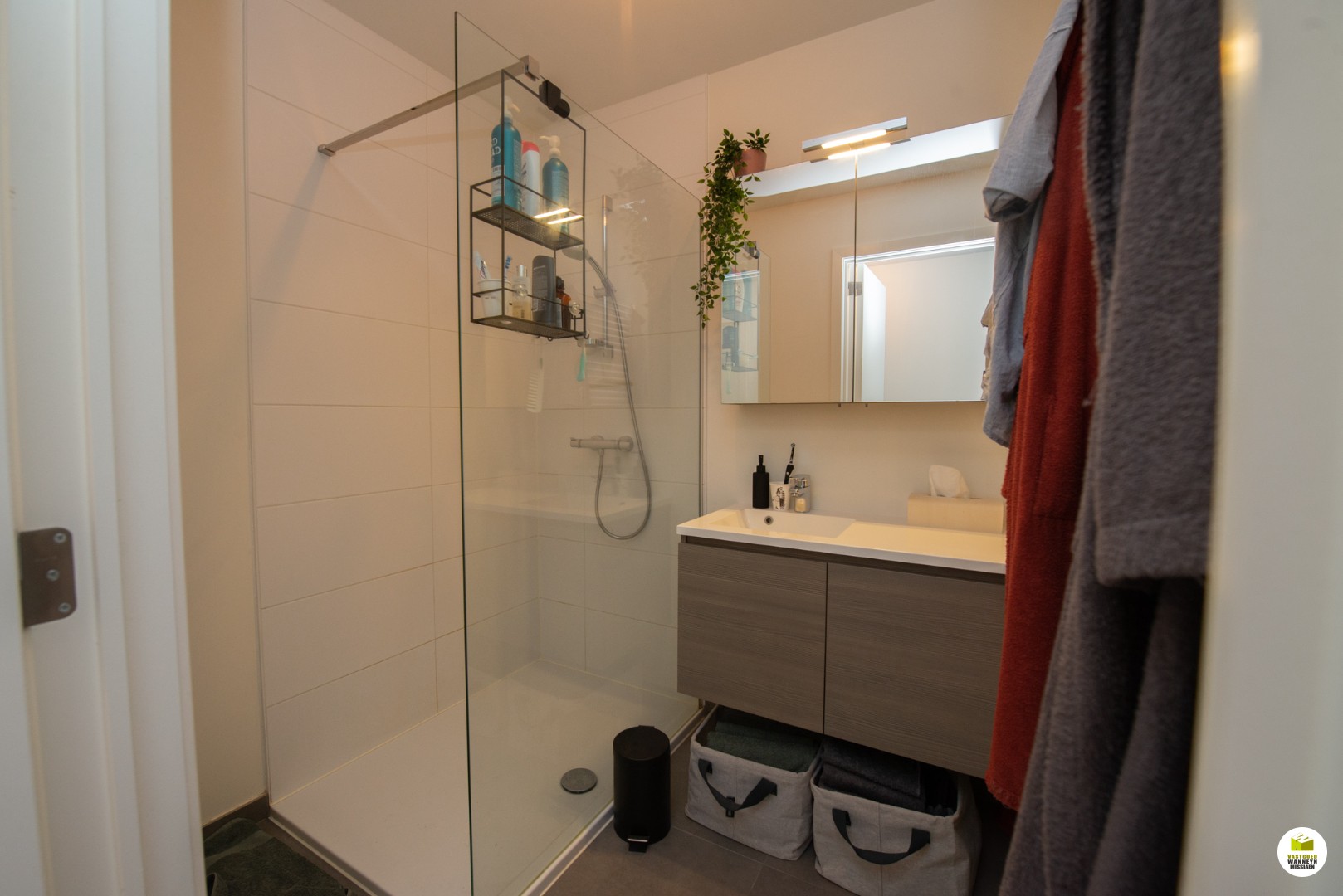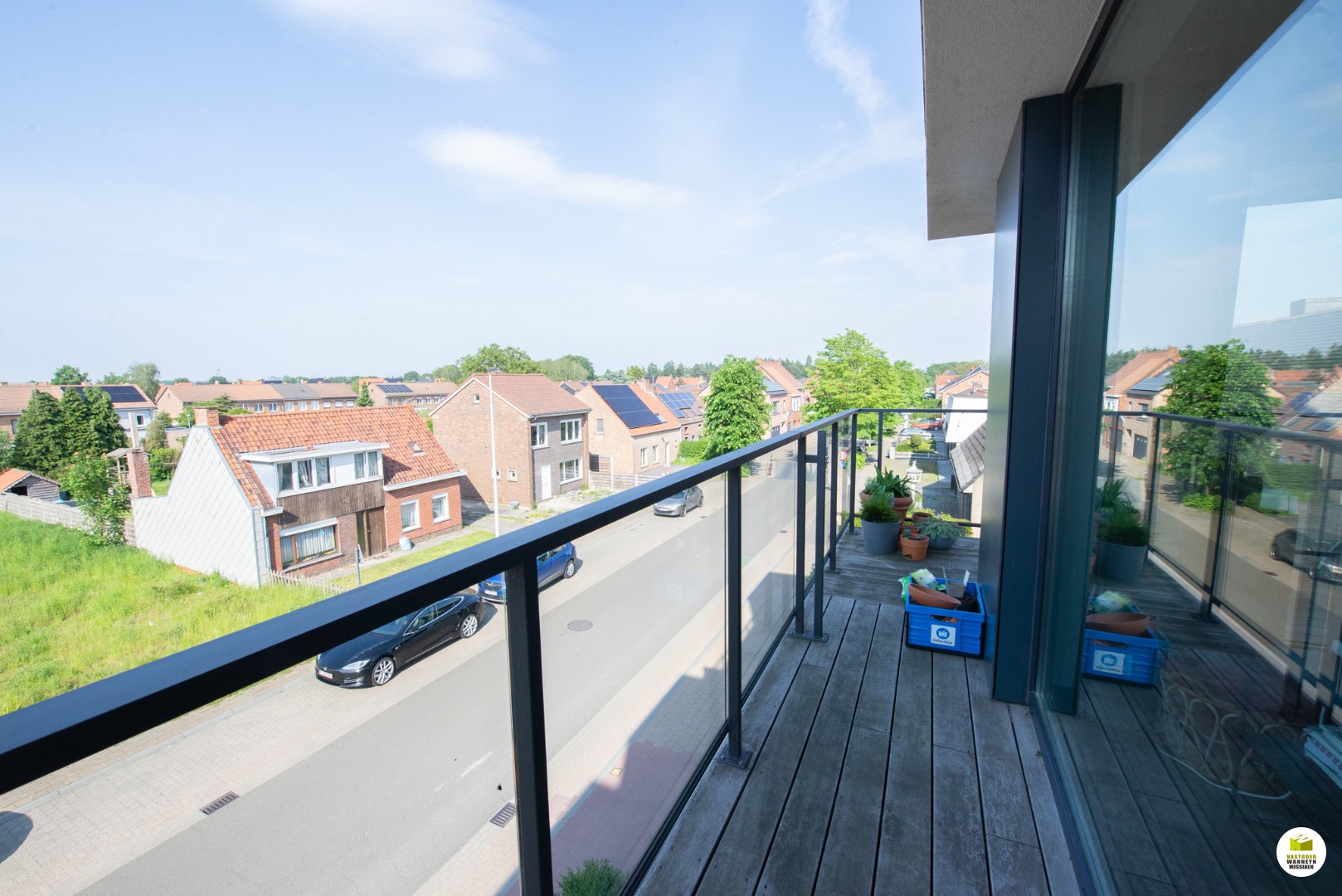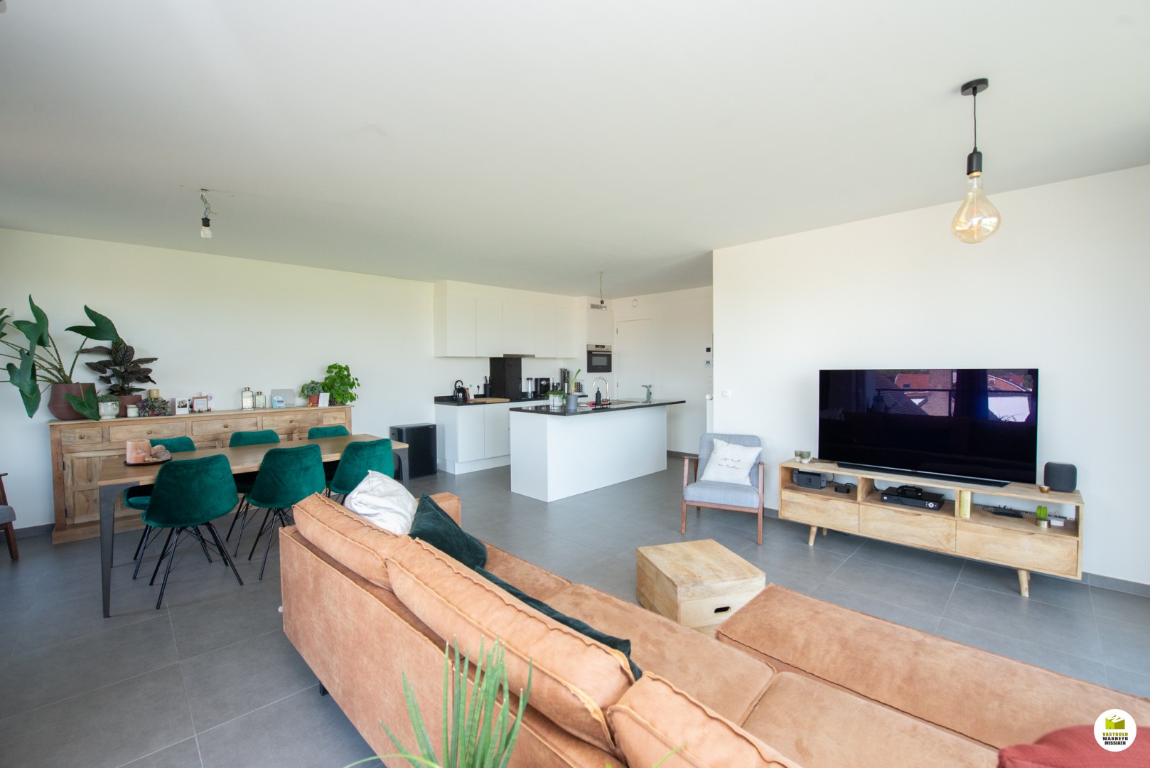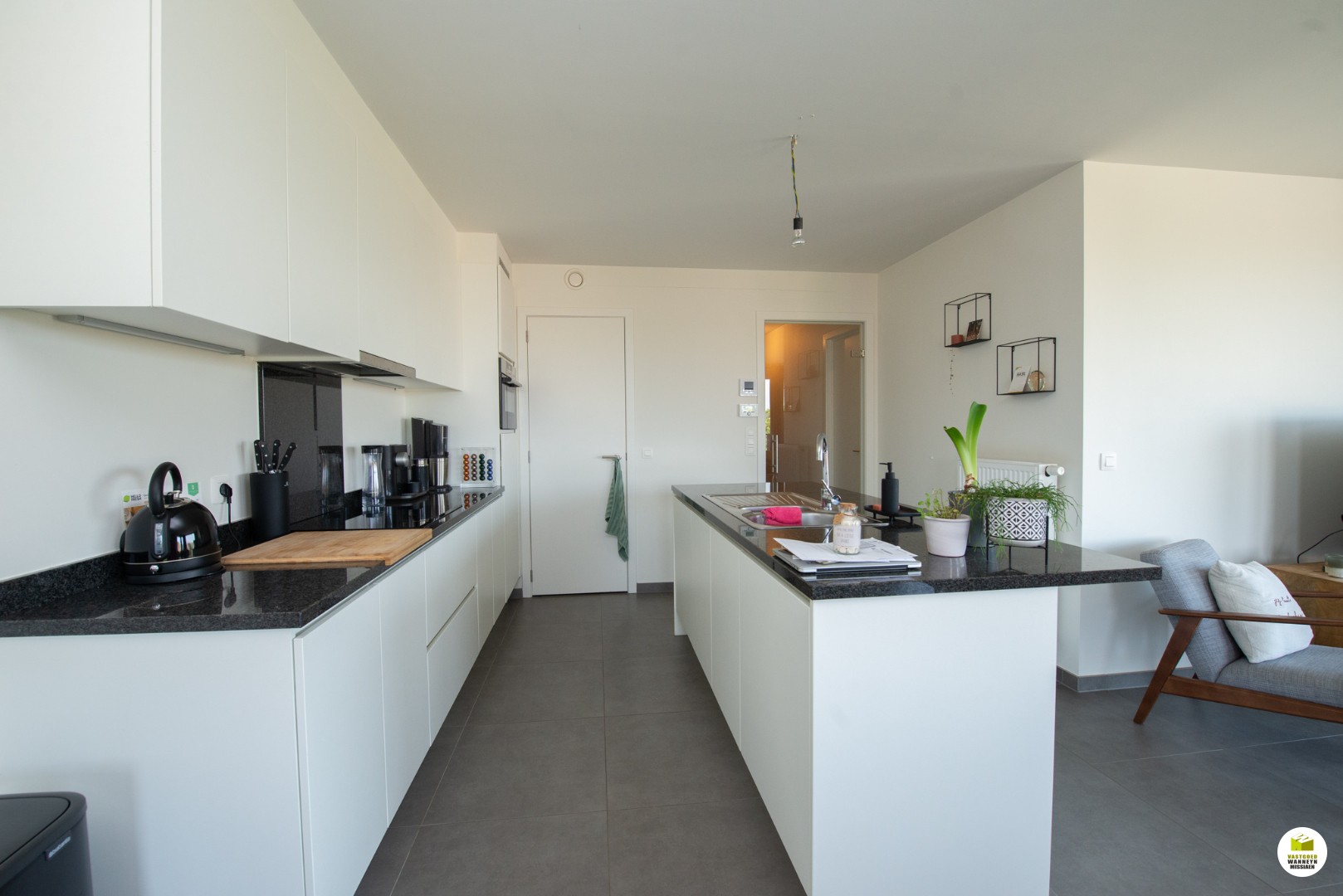 Ruime lichtrijke living met open keuken (uitgerust met vaatwas, frigo & combi-oven) en granieten werkblad, palend aan de living heeft u een ruim terras. Naast de keuken is er nog een berging/wasplaats voorzien. Er zijn 2 slaapkamers (12,5m2 & 12m2), een badkamer met inloopdouche en wastafel met lavabo, apart toilet.