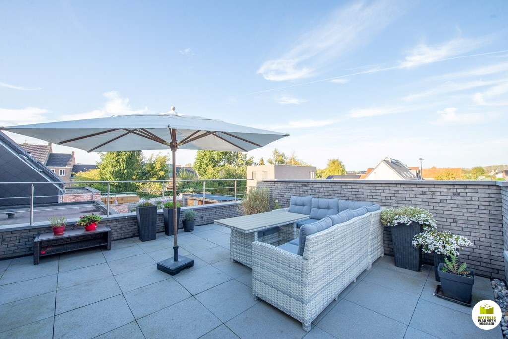 Garage met sectionale poort, trap naar boven, ruim terras (36m2) waar het gezellig vertoeven is, inkomhal, via de glazen schuifdeur komt u in de gezellige leefruimte met open keuken volledig uitgerust met vaatwas, frigo, microgolf & oven, berging/wasplaats, 2 slaapkamers (13m2 en 9m2), apart toilet, badkamer met inloopdouche en dubbele lavabo. Opbergzolder.