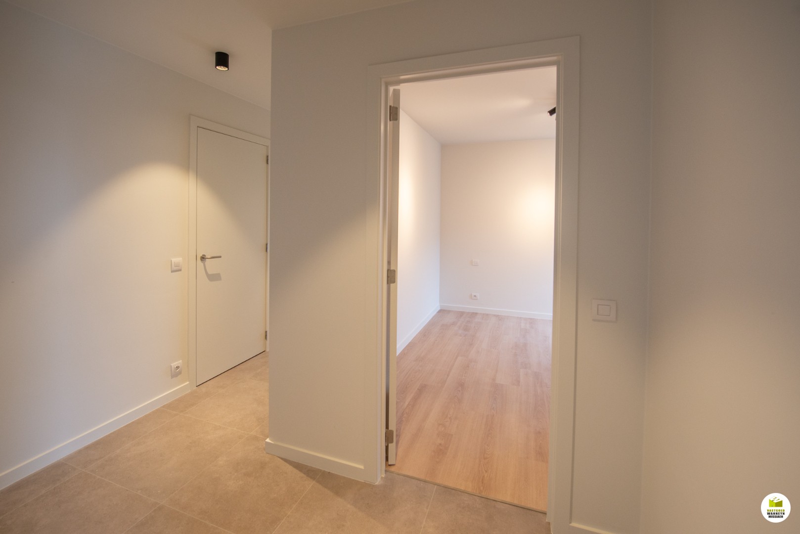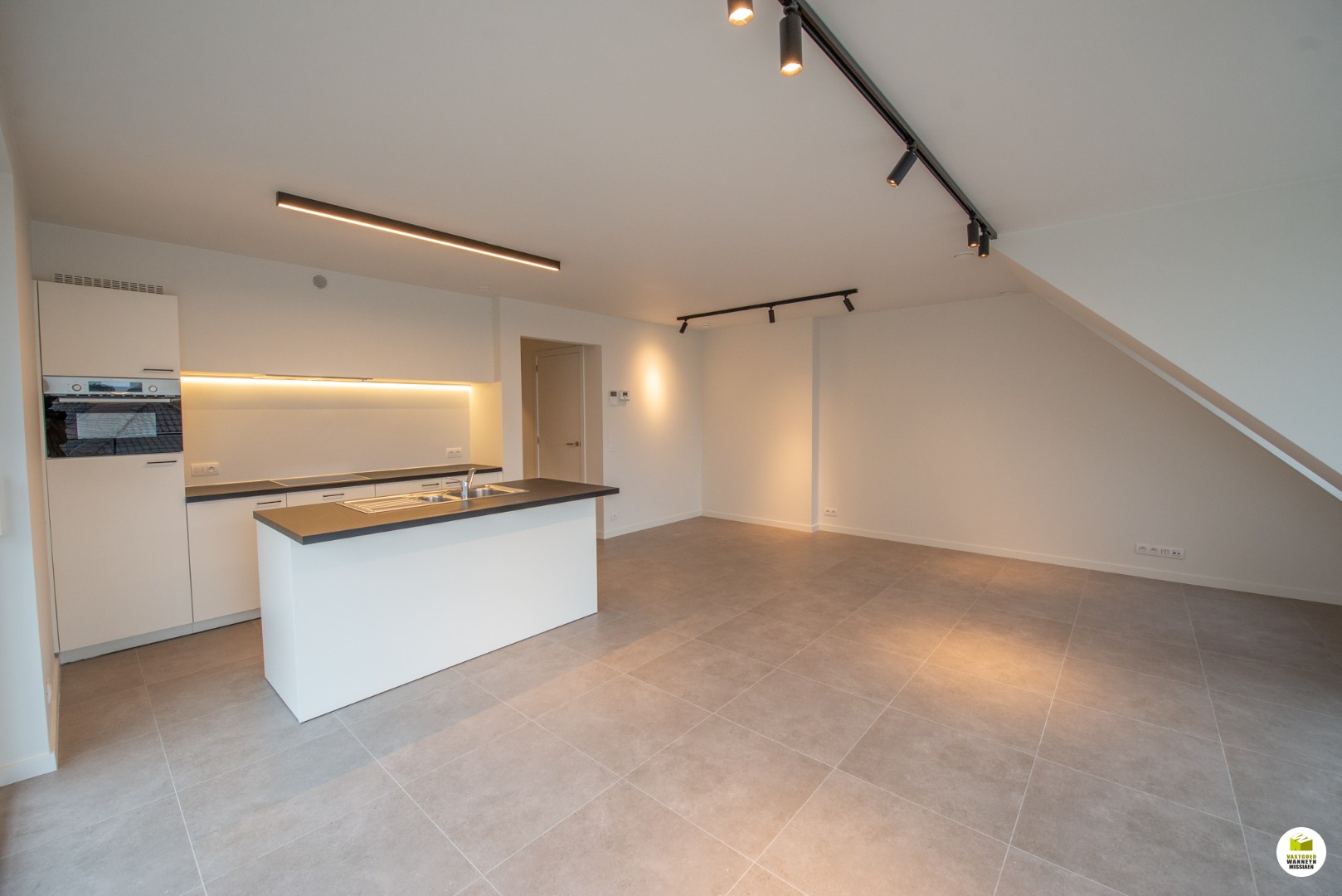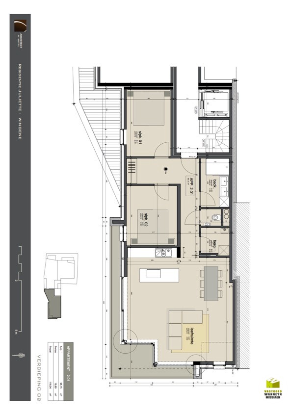 U komt binnen in de inkomhal met links en rechts een slaapkamer. Aan 1 slaapkamer grenst er een terras van +/- 4m2. Aansluitend vinden we de badkamer, ingericht met een inloopdouche en een lavabo met meubel. Er is een gastentoilet en een aparte wasplaats/technische berging. De woonkamer is bijzonder lichtrijk en ruim door alle raampartijen, er is een groot zon gericht terras van +/- 15m2 rondom de woonkamer en de keuken. De keuken is open en volledig ingericht qua toestellen (combi oven, vaatwas, keramische kookplaat). Er is overal vloerverwarming.