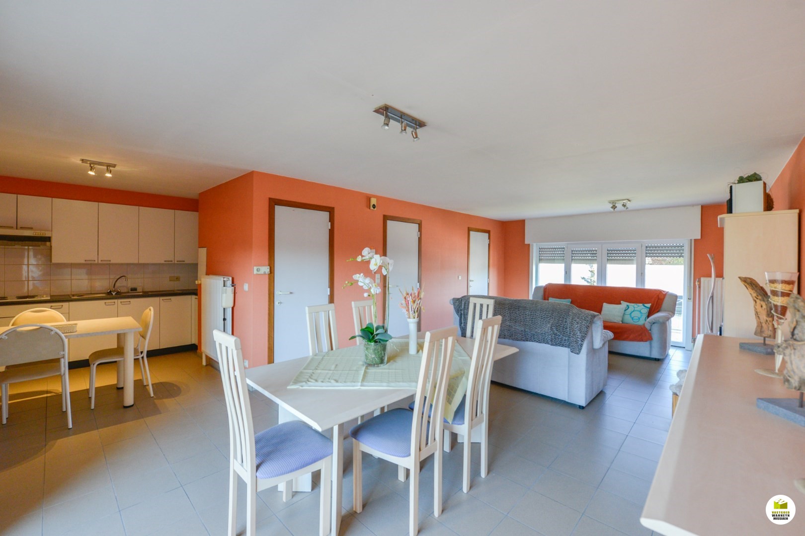 Lichtrijke leefruimte met eetplaats aansluitend op de open keuken (kookplaat, dampkamp, frigo , oven, dubbele spoelbak) en de eerste slaapkamer die momenteel gebruikt word als bergruimte.