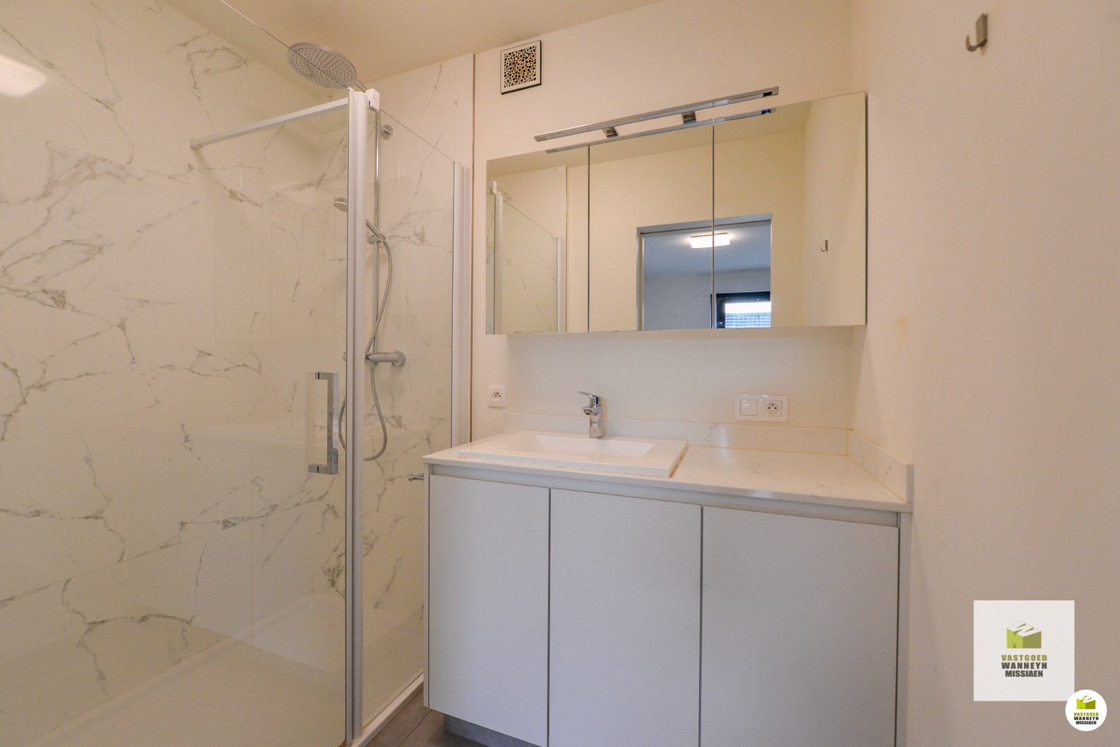 Indeling: Binnenkomen in de inkomhal met daar ook een ruime berging/wasplaats en toegang naar het apart gastentoilet. Verder de open geïnstalleerde keuken (vaatwas, frigo, kookplaat), living met ingebouwde kasten en met toegang naar het ruim overdekt zuidgericht terras en de slaapkamer met ingebouwde kasten met aanpalende badkamer met inloopdouche en lavabo.