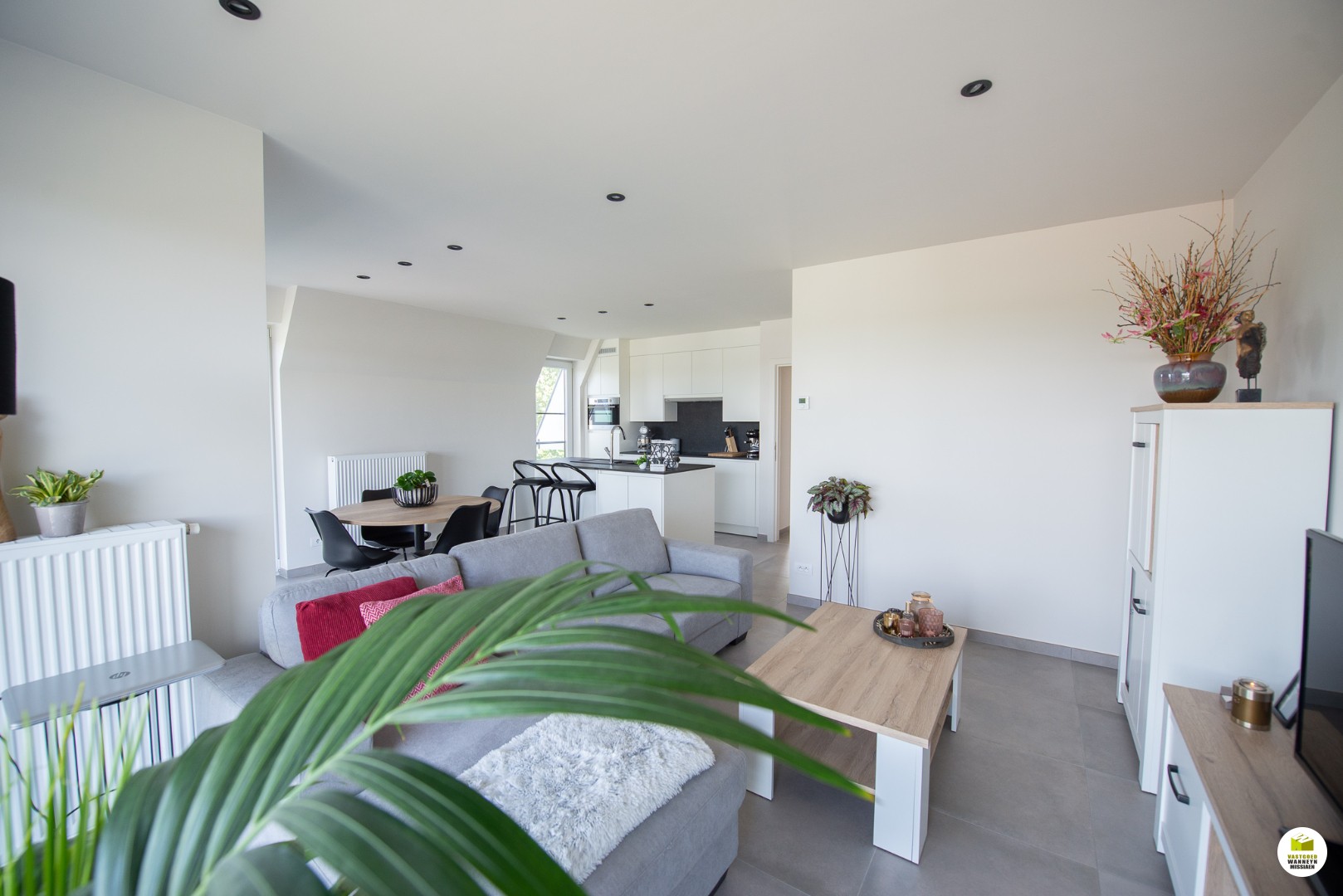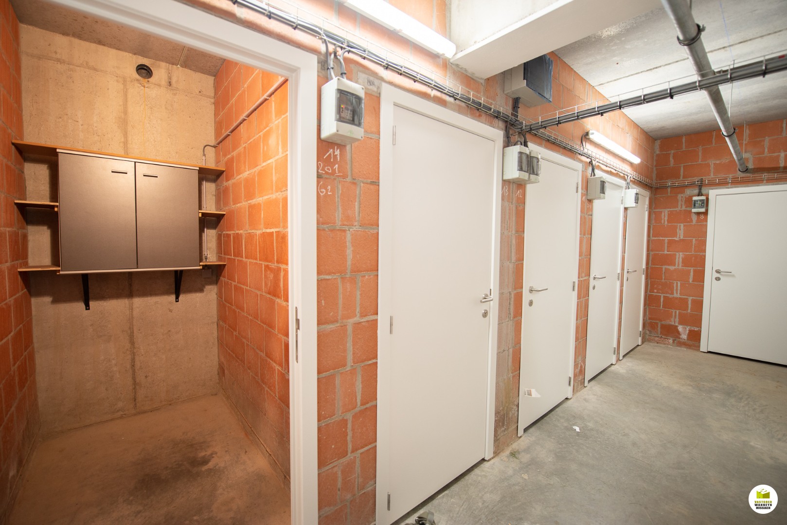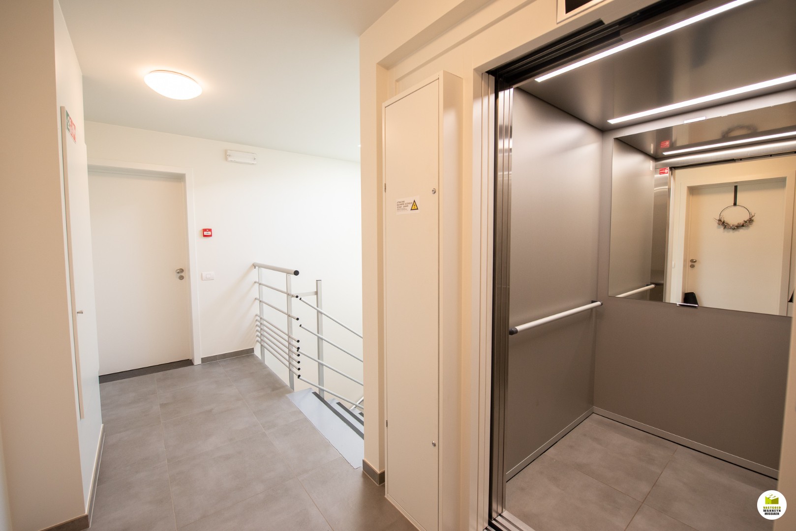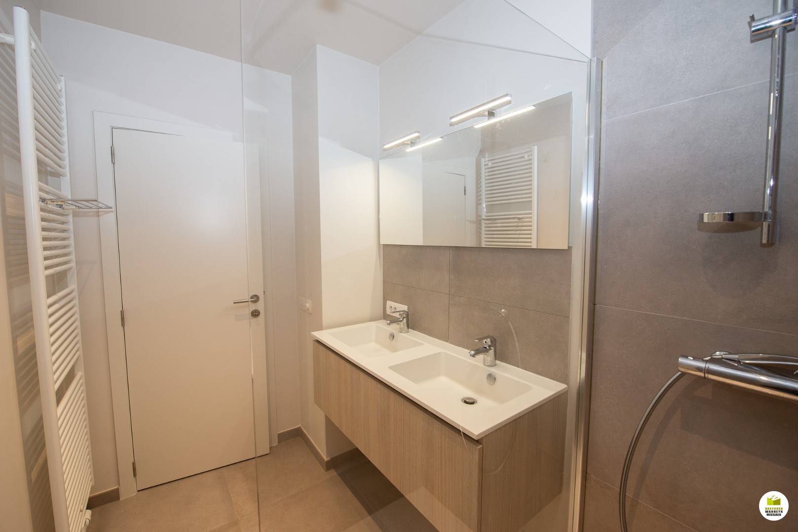 Indeling: Inkomhal met een gastentoilet en lavabo, een ingerichte moderne badkamer met een grote inloopdouche en een dubbele lavabo meubel. Er is een aparte was-/bergplaats grenzend aan de keuken. De keuken is open en lichtrijk, ingericht met een grote frigo met vriesvak, inductiekookplaat, oven en vaatwas, het werkblad is zwarte natuursteen. Via de keuken/woonkamer kan het je op het terras, de avondzon komt op dit terras en tot in de woonkamer. In de zomer is het een vrij koel appartement. Tevens beschikt dit appartementsgebouw ook over een gemeenschappelijke fietsberging en een - vuilnislokaal. Er is een ruime ondergrondse garagebox met automatische poort en individuele kelderberging.