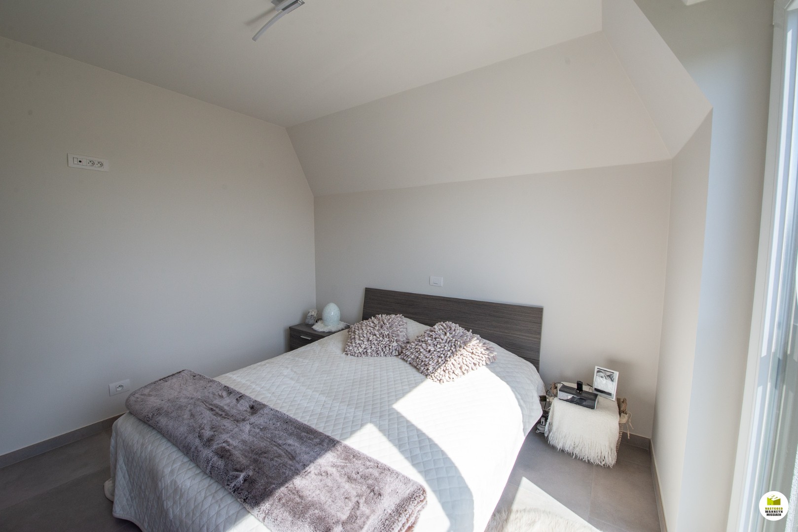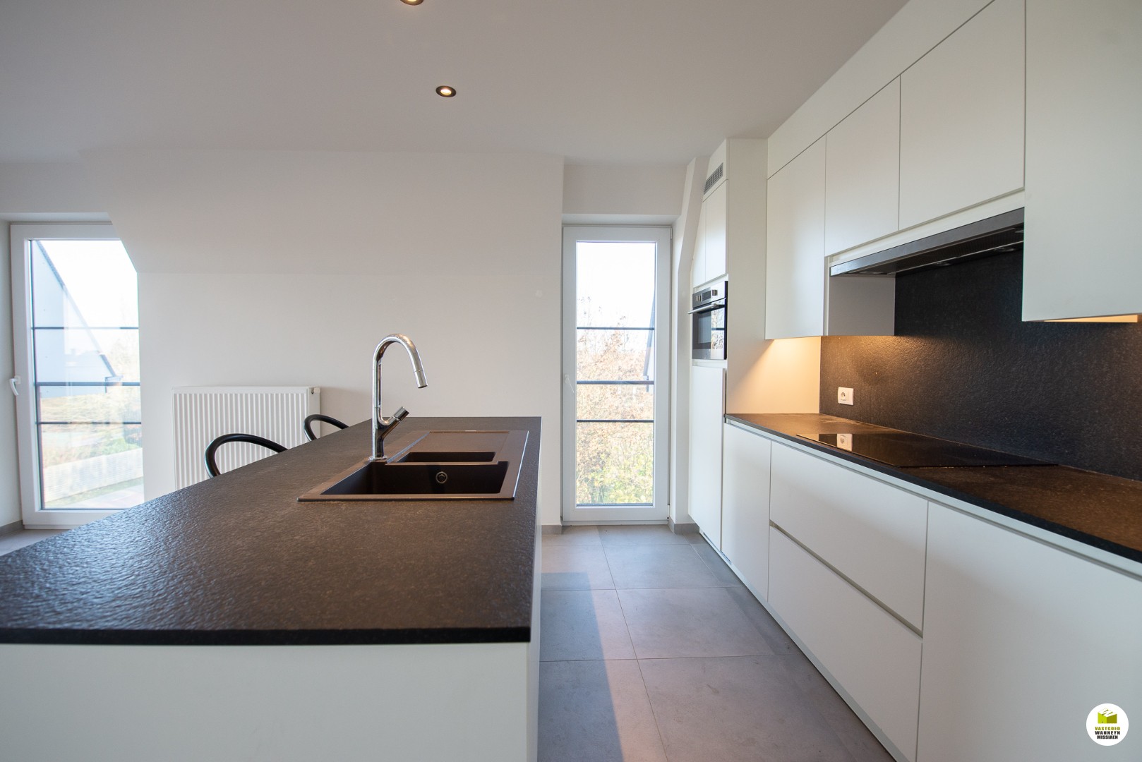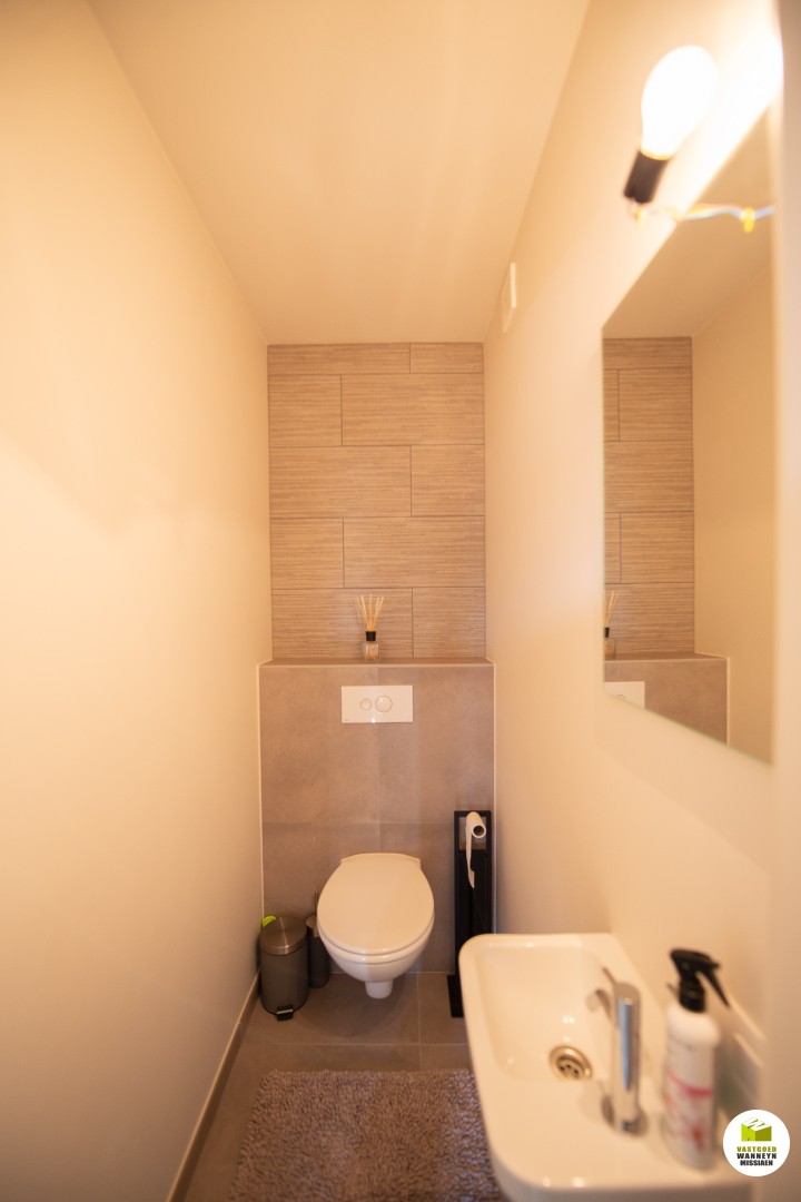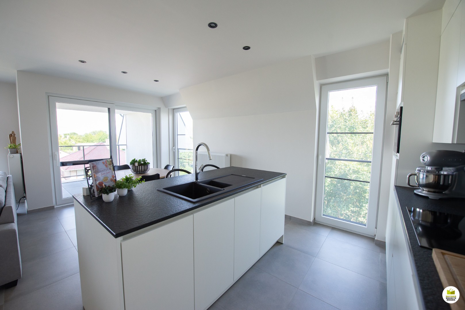 Indeling: Inkomhal met een gastentoilet en lavabo, een ingerichte moderne badkamer met een grote inloopdouche en een dubbele lavabo meubel. Er is een aparte was-/bergplaats grenzend aan de keuken. De keuken is open en lichtrijk, ingericht met een grote frigo met vriesvak, inductiekookplaat, oven en vaatwas, het werkblad is zwarte natuursteen. Via de keuken/woonkamer kan het je op het terras, de avondzon komt op dit terras en tot in de woonkamer. In de zomer is het een vrij koel appartement. Tevens beschikt dit appartementsgebouw ook over een gemeenschappelijke fietsberging en een - vuilnislokaal. Er is een ruime ondergrondse garagebox met automatische poort en individuele kelderberging.