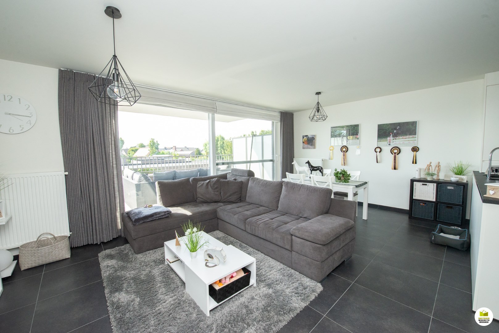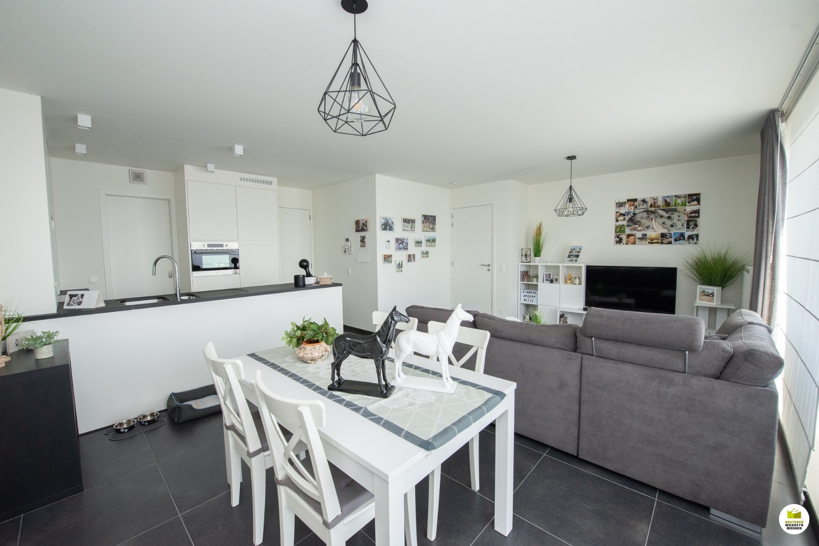 U komt binnen in de lichtrijke leefruimte met schuifraam naar het ruime zonnige terras (20m2) aan de achterzijde. Er is een open geïnstalleerde keuken (combi oven/microgolf, frigo, vaatwas). Naast de keuken is er een berging/wasplaats met een waterontkalker.