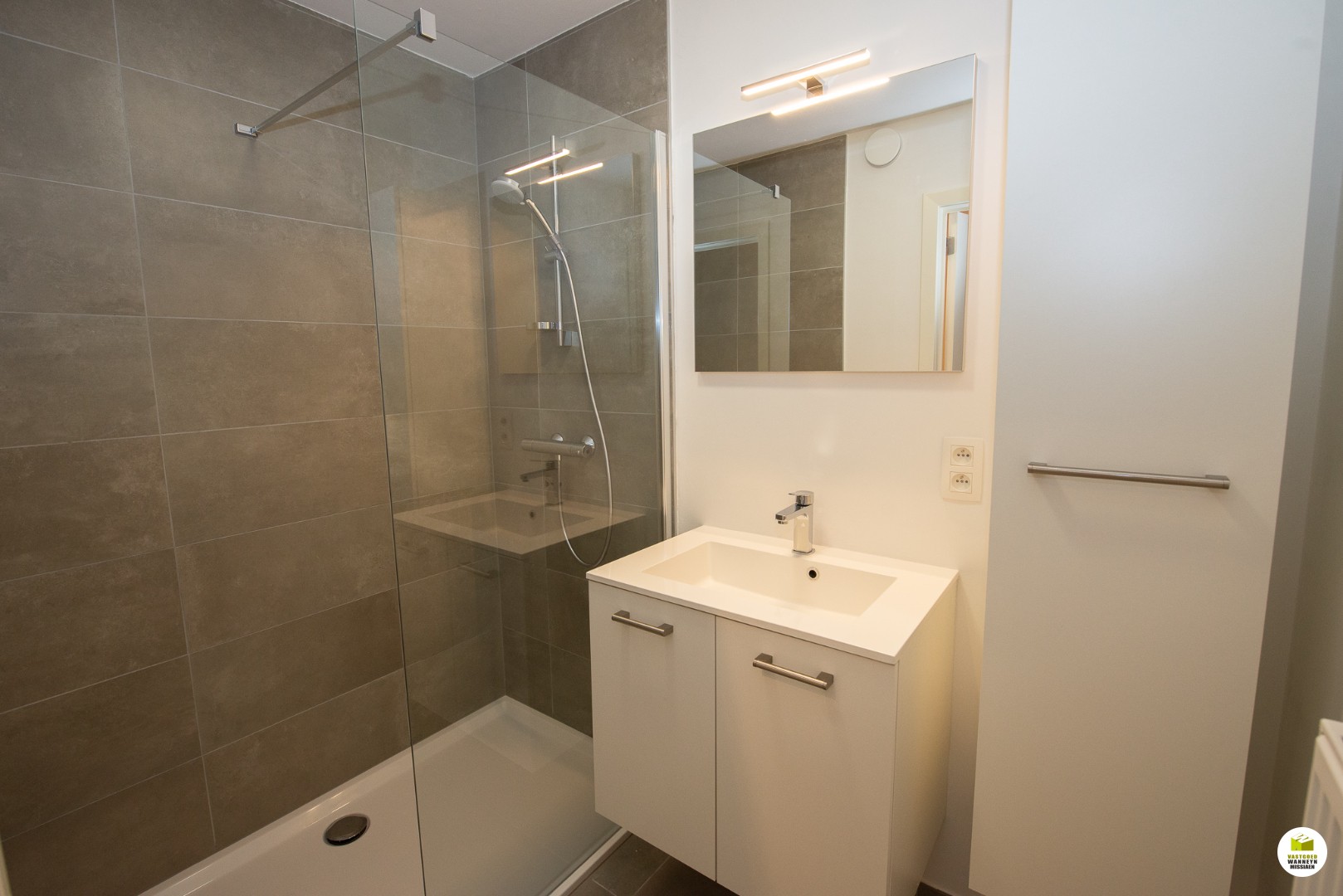 De badkamer is ingericht met een inloopdouche, lavabo en kasten. In de slaapkamer is er een nis waarin kleerkasten zijn ingemaakt, indien gewenst kan men de gordijnen ook gebruiken, hier is er ook een aansluiting voor UTP en COAX.