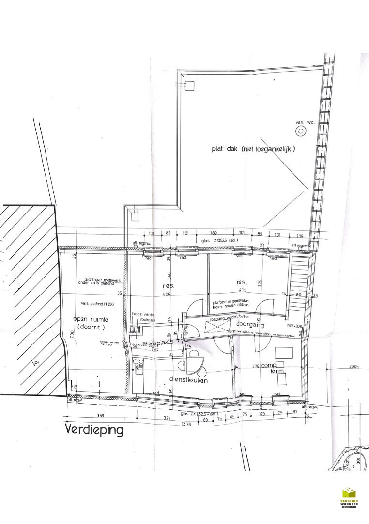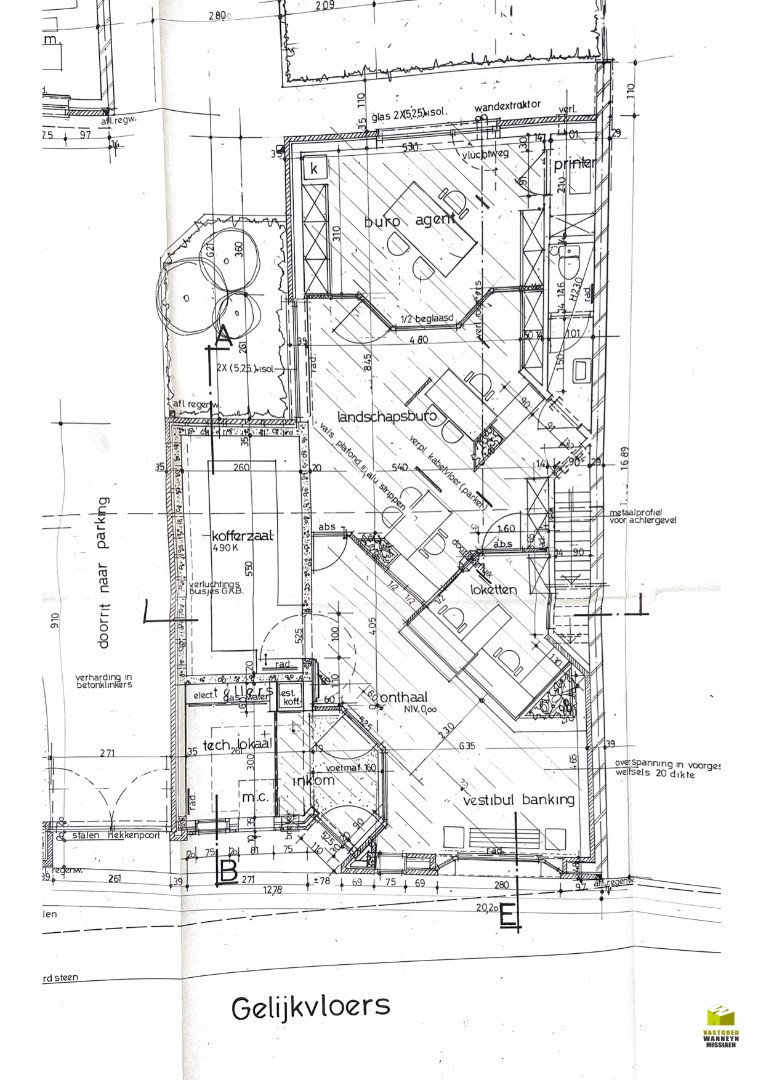 Huidige indeling: inkomhal, vooraan is er een apart kantoor/vestiaire/archief en de ontvangstruimte met wachthoek. Verder zijn er nog 2 afzonderlijke burelen, allemaal uitgerust met airco. Achteraan bevindt zich het sanitair gedeelte (apart toilet). Er is ook een kluizenzaal en een technische ruimte. Op de eerste verdieping zijn er nog eens 2 afzonderlijke burelen en een dienstkeuken. Er is nog een apart toilet. Via een schuiftrap is de ... zolder bereikbaar.