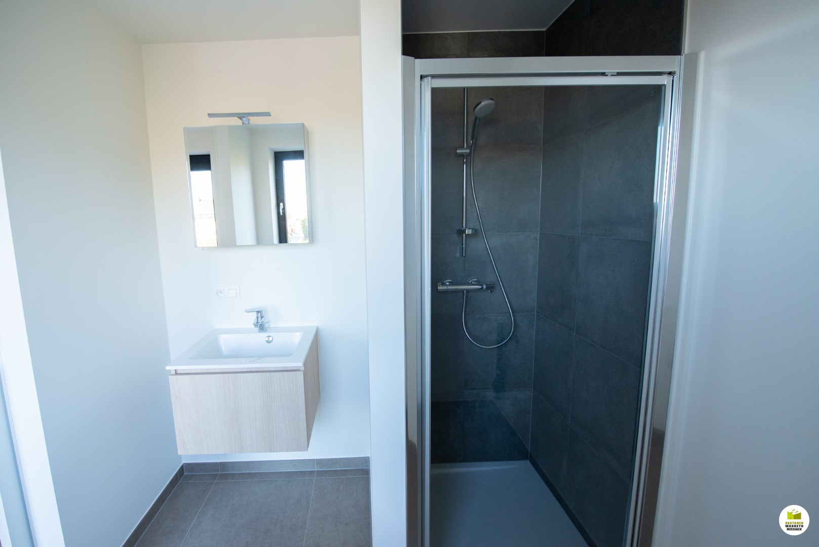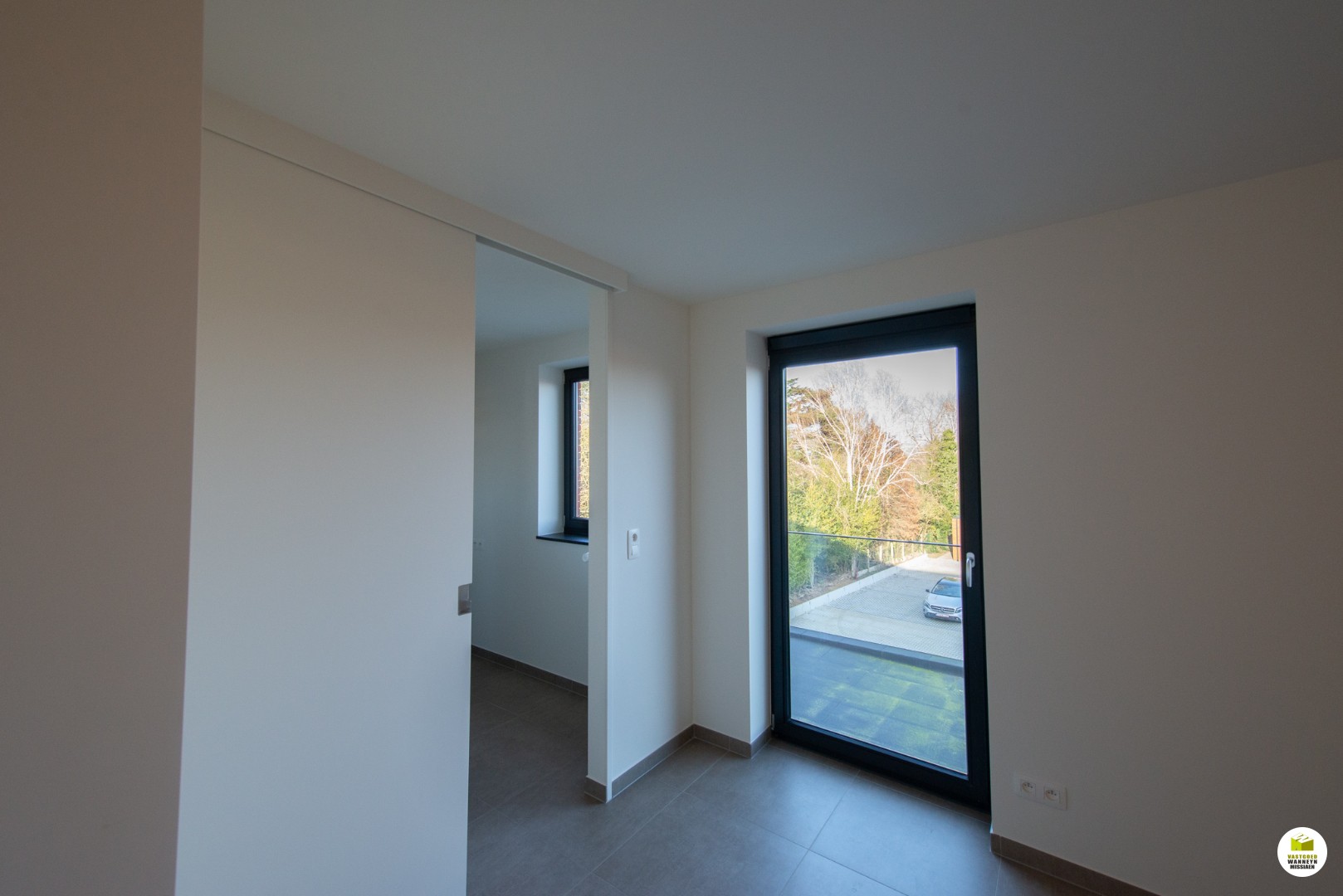 Inkom, afzonderlijk toilet, volledig uitgeruste keuken (vaatwas, combi-oven, koelkast, kookplaat), berging, lichtrijke leefruimte met toegang tot het terras en eerste slaapkamer (14 m2) met toegang tot bijhorende badkamer (wastafel, douche en aansluiting wasmachine).