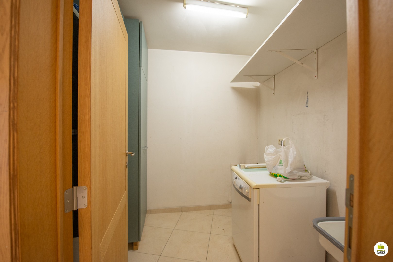 Indeling: 1ste verdiep: ruime en lichtrijke leefruimte met gezellige gashaard, uitgeruste keuken met vaatwas, koelkast, oven en microgolf, berging, afzonderlijk toilet. 2de verdiep: 2 slaapkamers, badkamer met ligbad, lavabo en toilet, berging. Ruime garagebox.
