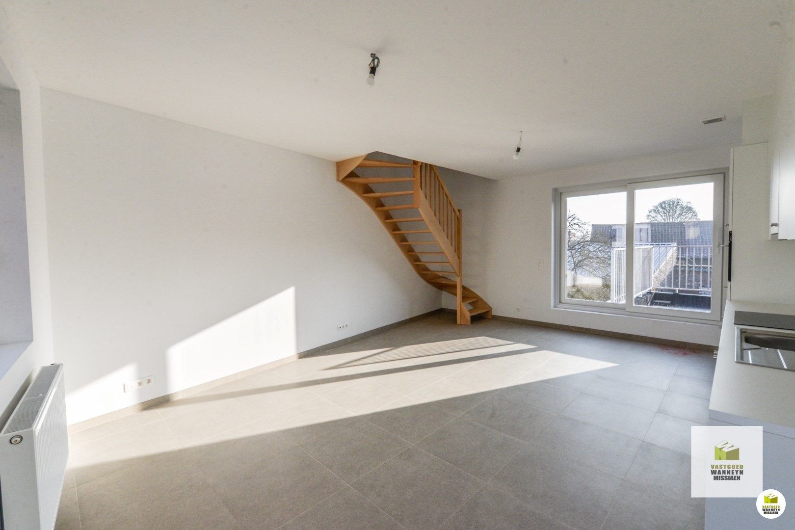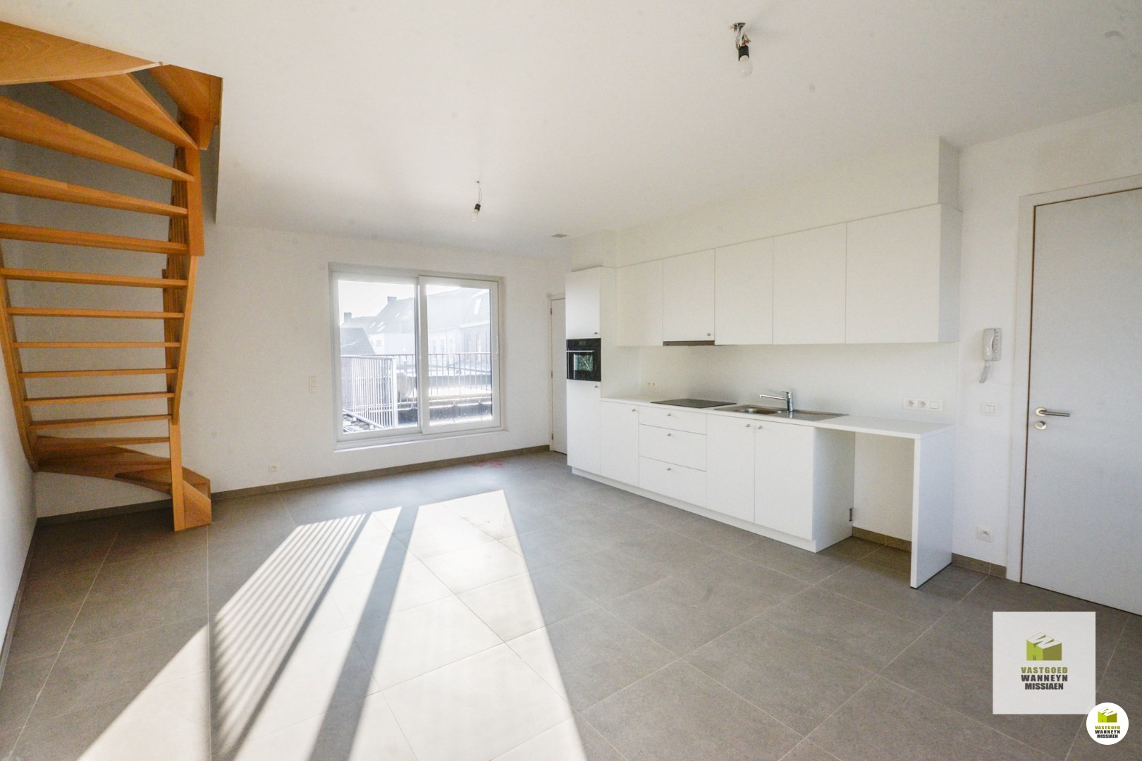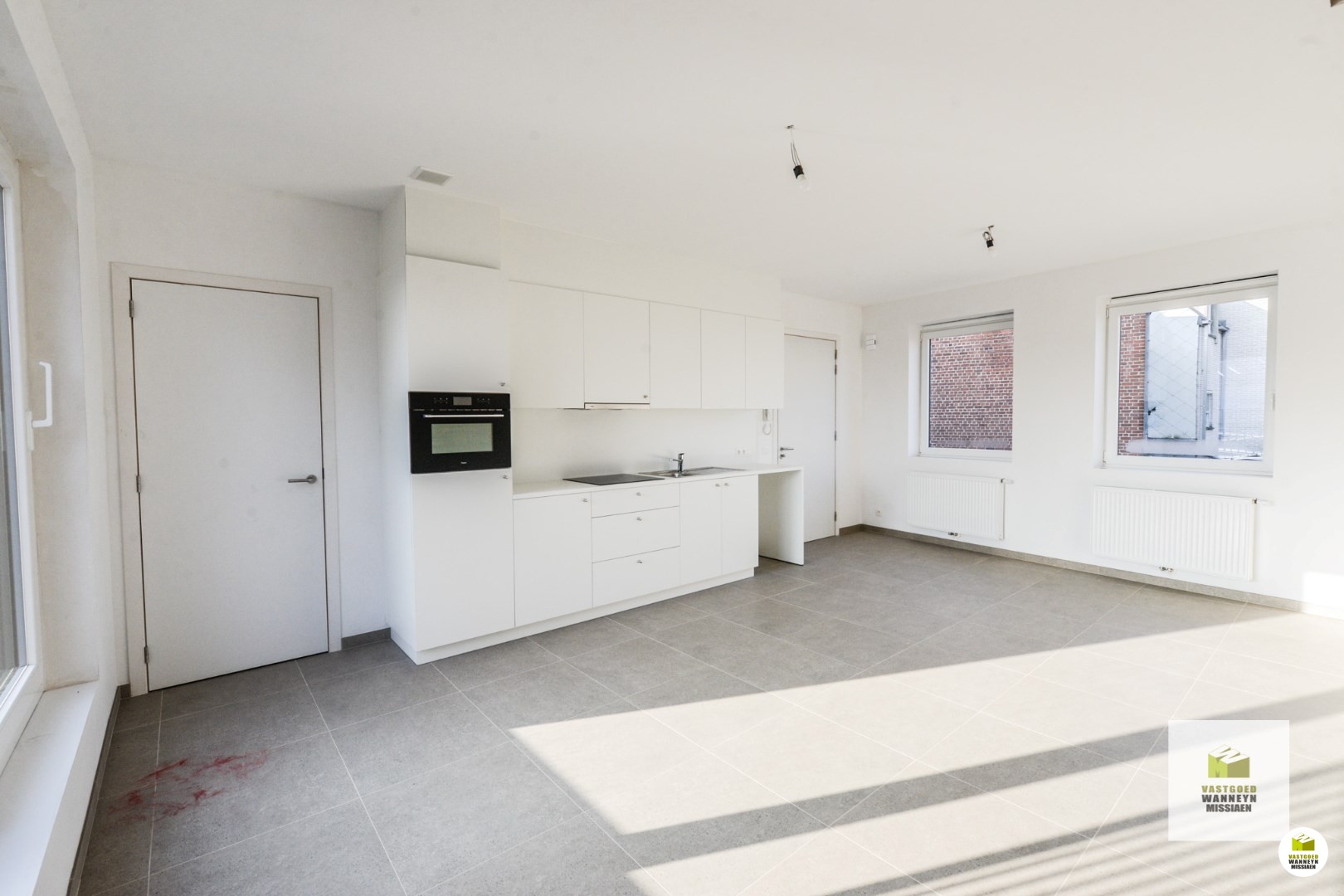 Lichtrijke woonkamer met open keuken, aparte wasplaats. Via het schuifraam aan de woonkamer kan je op het terras.