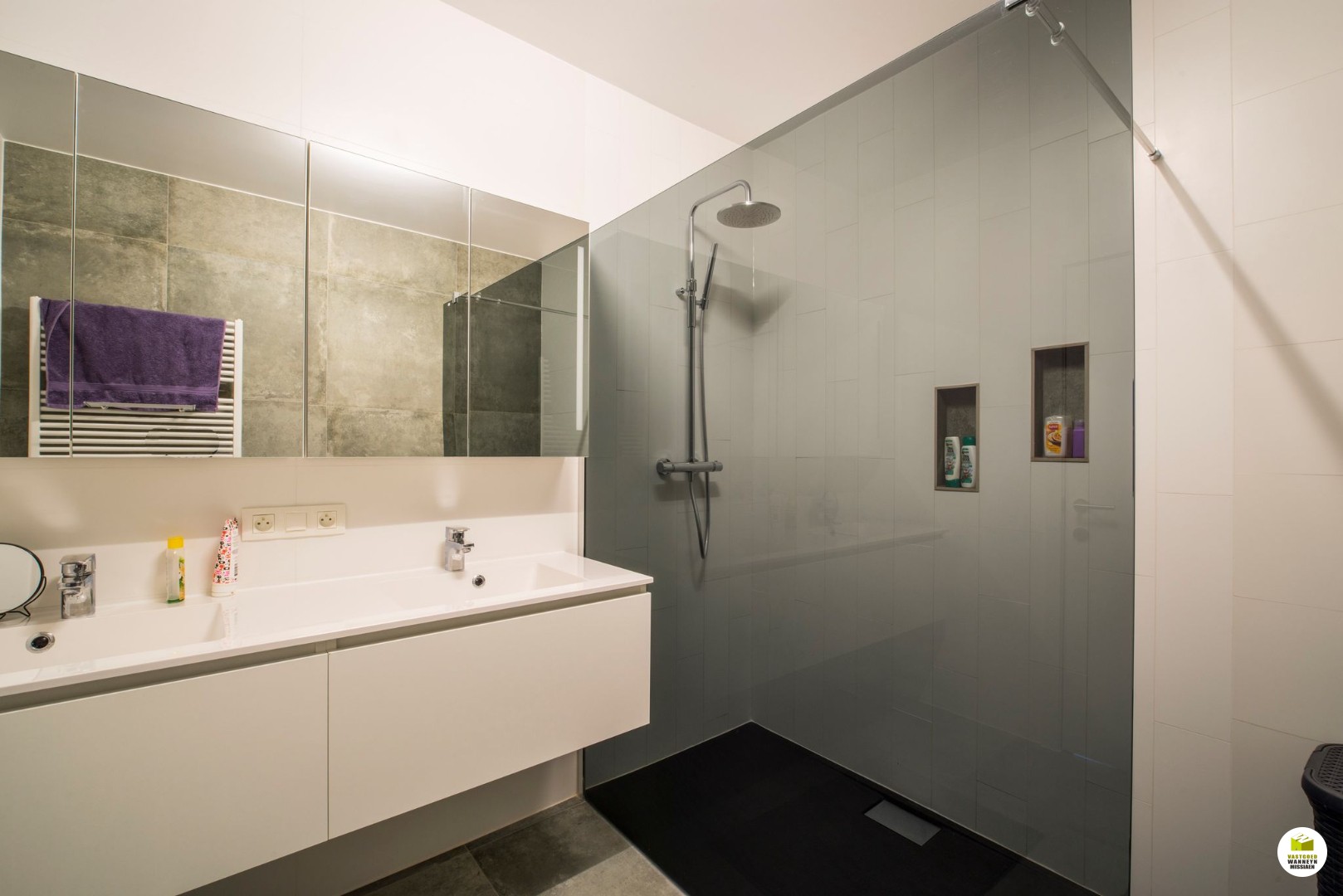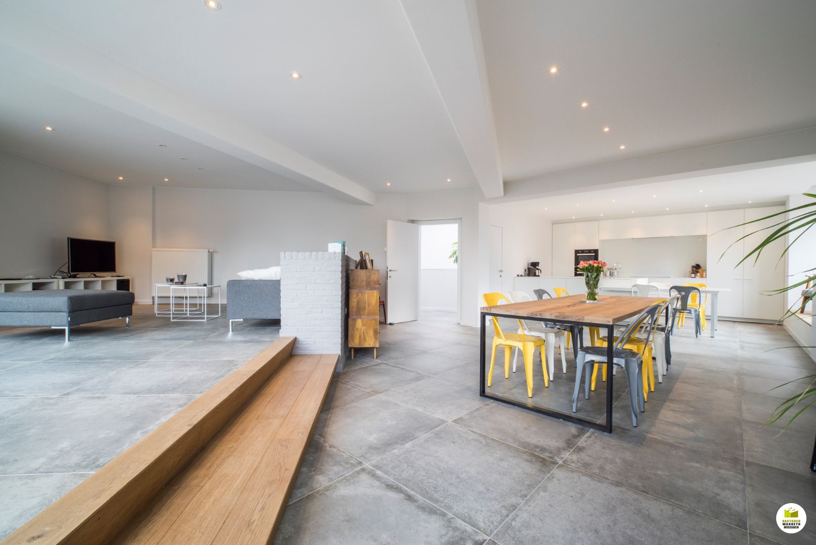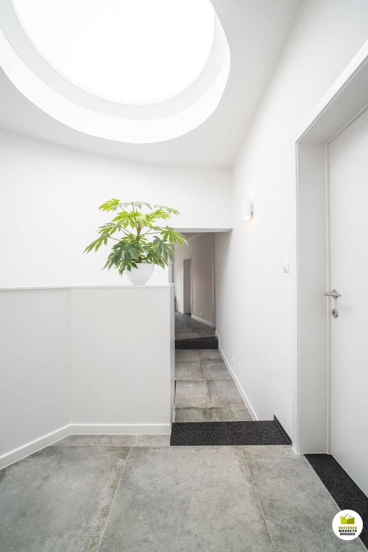 De loft is te bereiken via de private inkom aan de zijkant van het gebouw. Via de trappen komt u terecht in de volledig gerenoveerde loft. De leefruimte is omringd met ramen die zorgen voor zeer veel natuurlijk daglicht en toch beperkte inkijk. Op een verhoog is de zithoek terug te vinden, waar beneden dan de eetplaats, verbonden aan de keuken is. De keuken is uitgerust met alle hedendaagse toestellen (oven, microgolf, frigo, vaatwas) en biedt het nodige comfort. Verder zijn er nog 2 zeer ruime slaapkamers, een apart toilet, een berging met aansluiting voor wasmachine, droogkast, diepvries ect. en een badkamer met dubbele lavabo en inloopdouche. Voor wie graag eens buiten tot rust komt is er een terras voorzien. Ook hier geen inkijk en de nodige privacy. Tot slot is er aan de andere zijkant van het gebouw nog een garage inbegrepen die toegankelijk is met de automatische, elektrische poort. ...