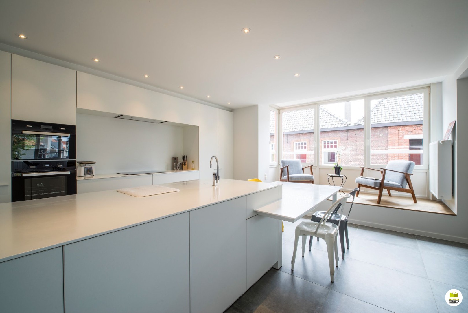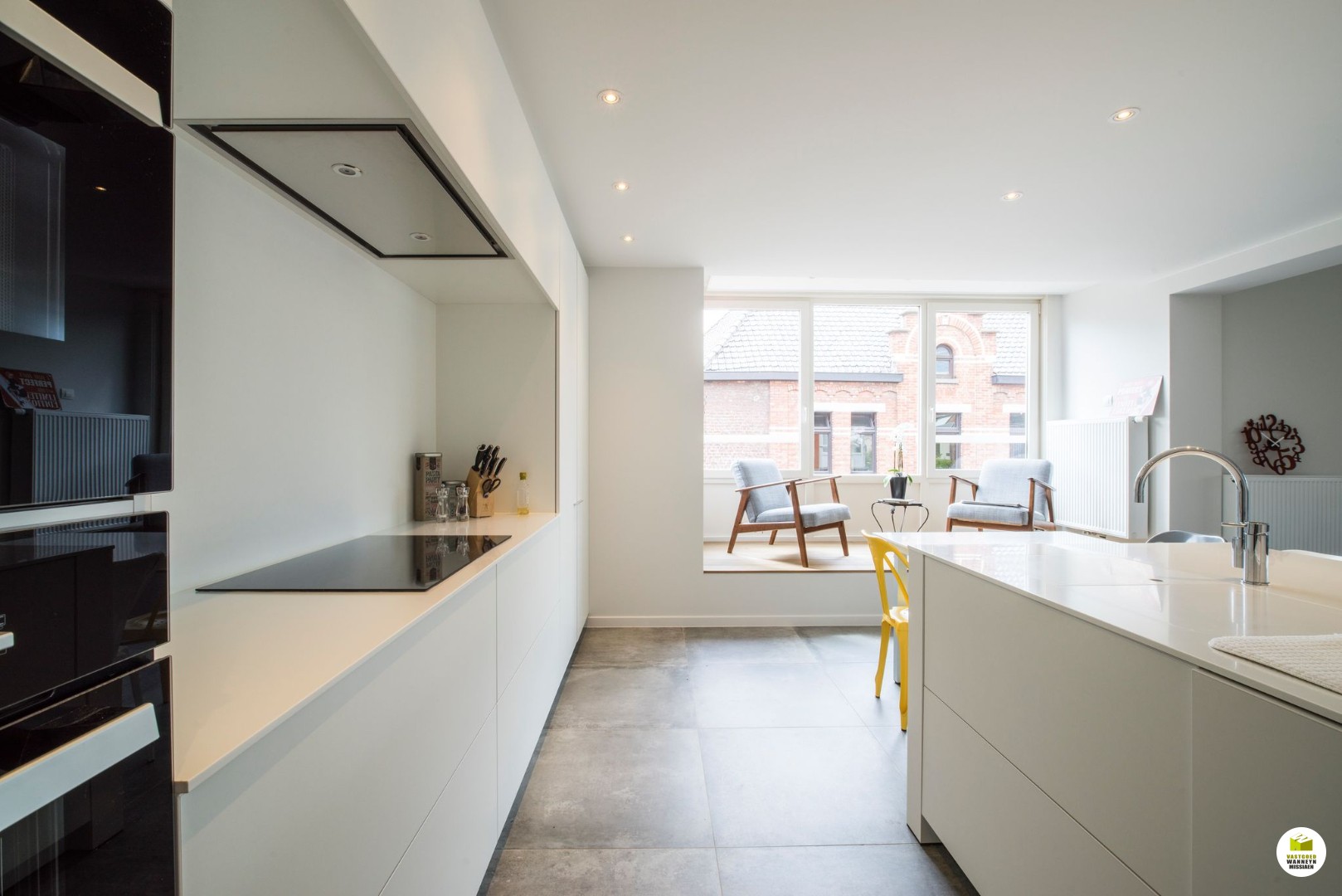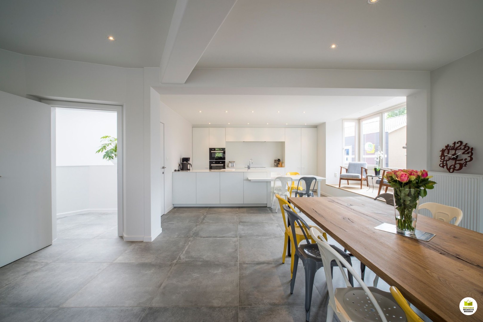 De loft is te bereiken via de private inkom aan de zijkant van het gebouw. Via de trappen komt u terecht in de volledig gerenoveerde loft. De leefruimte is omringd met ramen die zorgen voor zeer veel natuurlijk daglicht en toch beperkte inkijk. Op een verhoog is de zithoek terug te vinden, waar beneden dan de eetplaats, verbonden aan de keuken is. De keuken is uitgerust met alle hedendaagse toestellen (oven, microgolf, frigo, vaatwas) en biedt het nodige comfort. Verder zijn er nog 2 zeer ruime slaapkamers, een apart toilet, een berging met aansluiting voor wasmachine, droogkast, diepvries ect. en een badkamer met dubbele lavabo en inloopdouche. Voor wie graag eens buiten tot rust komt is er een terras voorzien. Ook hier geen inkijk en de nodige privacy. Tot slot is er aan de andere zijkant van het gebouw nog een garage inbegrepen die toegankelijk is met de automatische, elektrische poort. ...