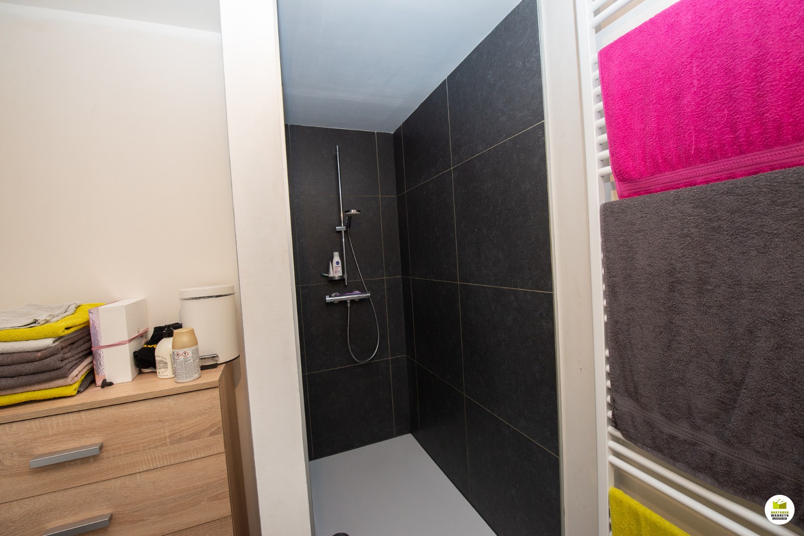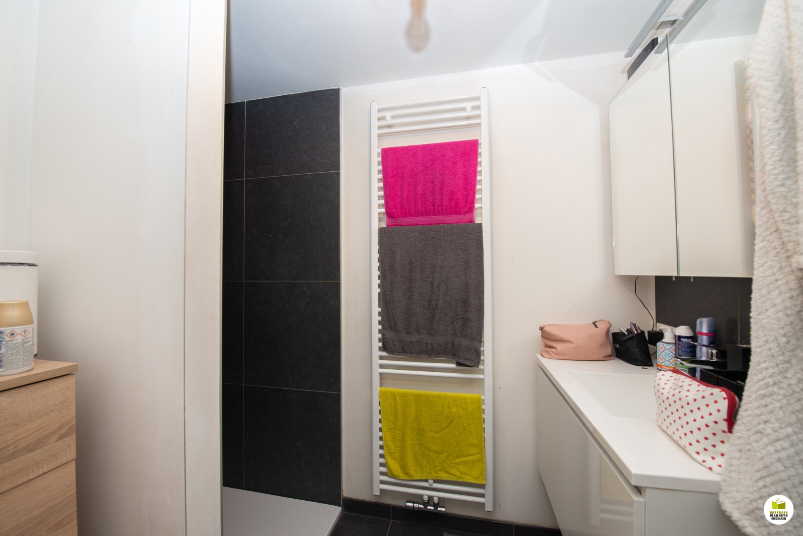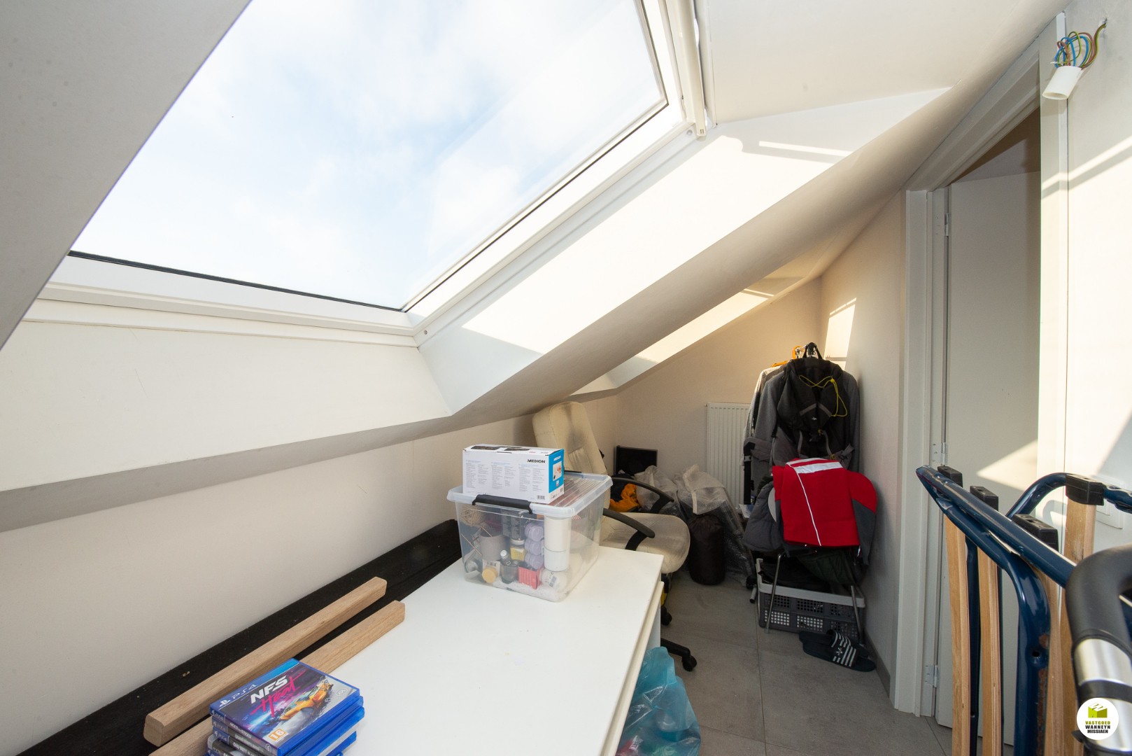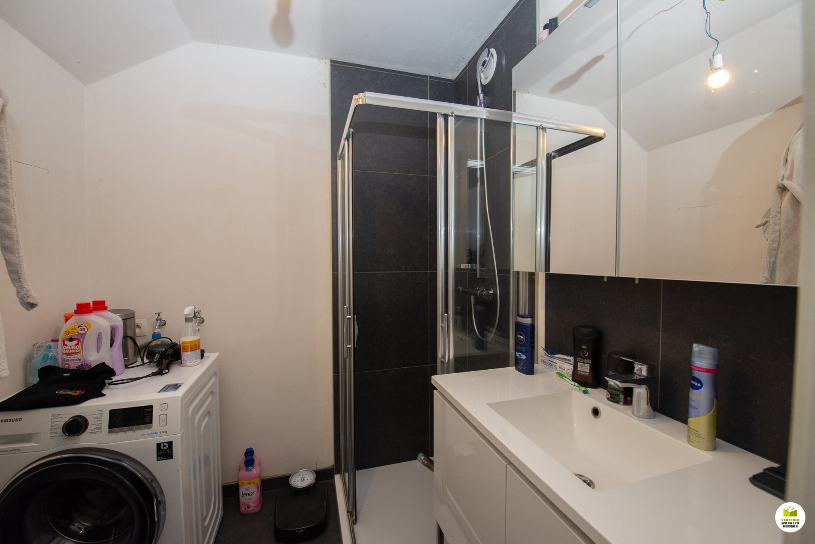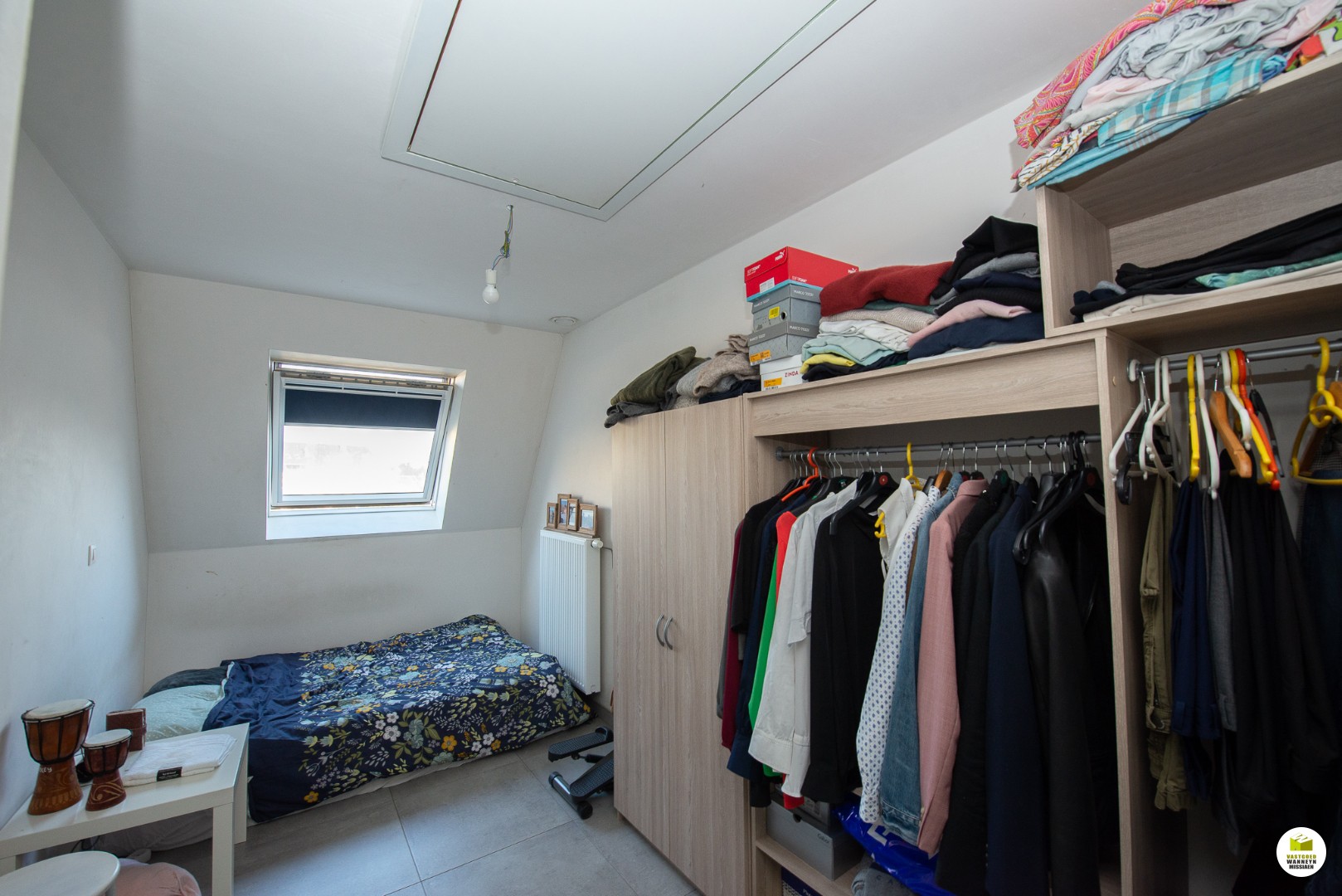 2de verdiep: 2 slaapkamers (beide 12m2), badkamer (douche en lavabo), bureauruimte/dressing.