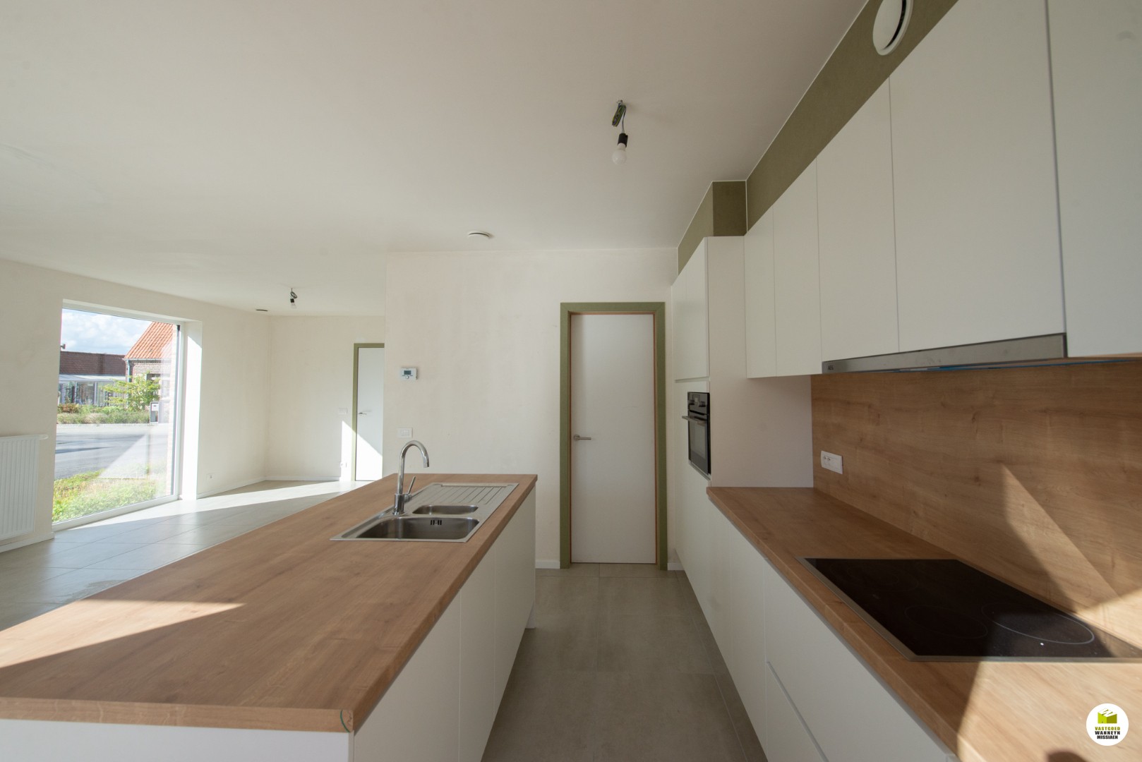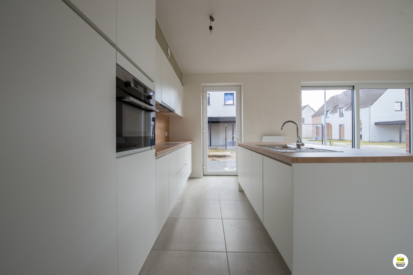 Via de keuken toegang naar de garage met elektrische poort waar ook voorzieningen zijn voor wasmachine en droogkast.