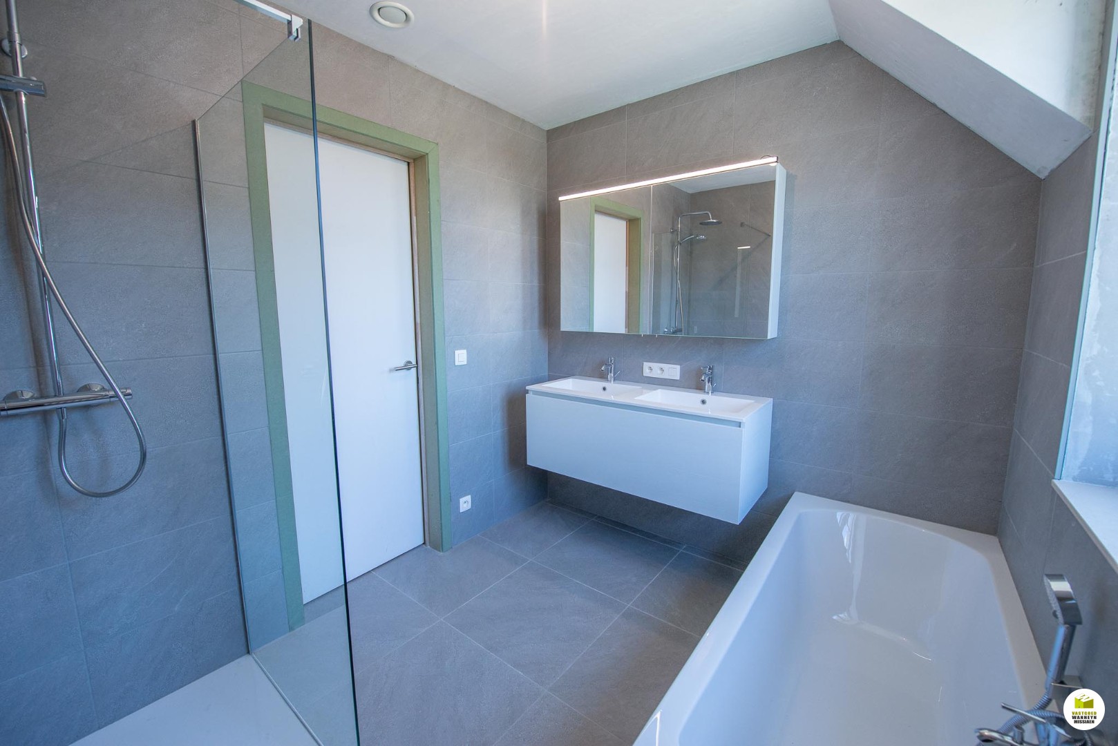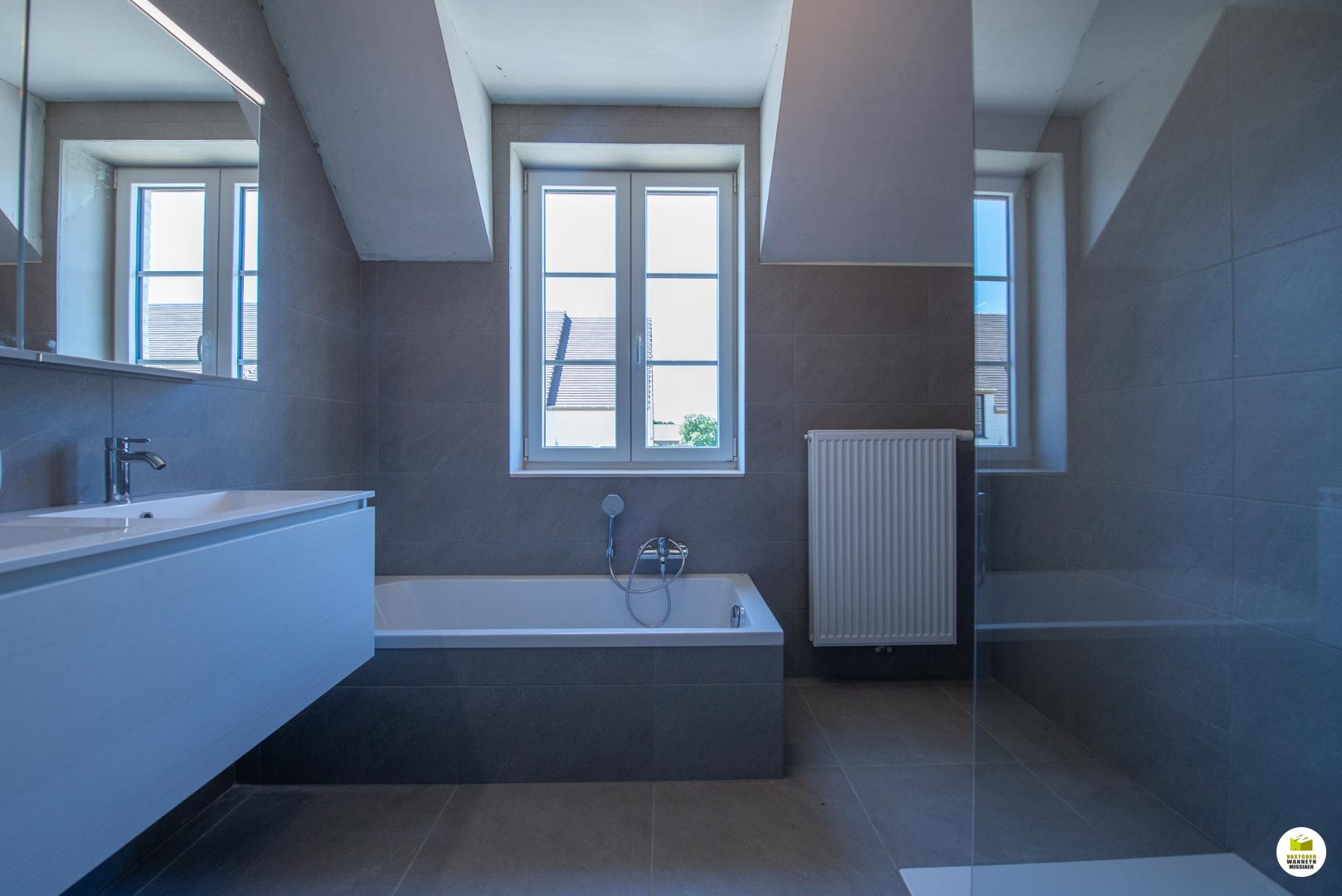 1ste verdiep: 3 slaapkamers met laminaatvloer, badkamer met ligbad, inloopdouche en lavabomeubel, afzonderlijk toilet.