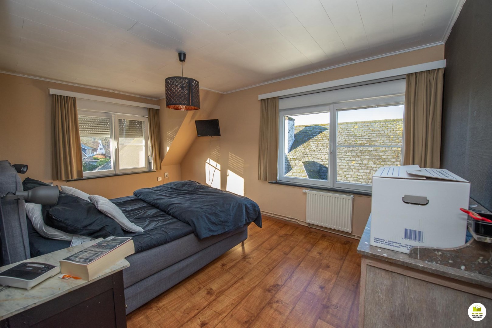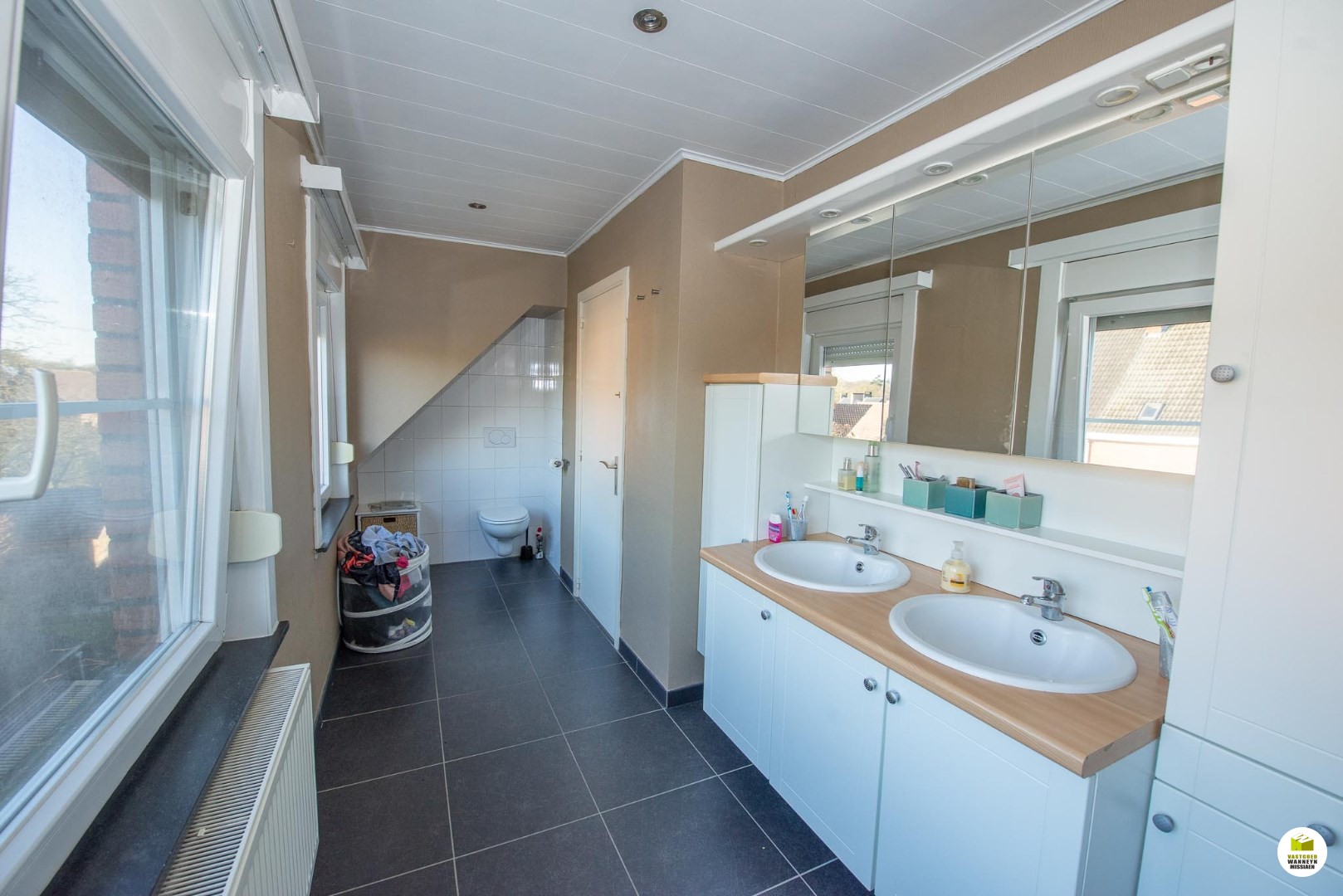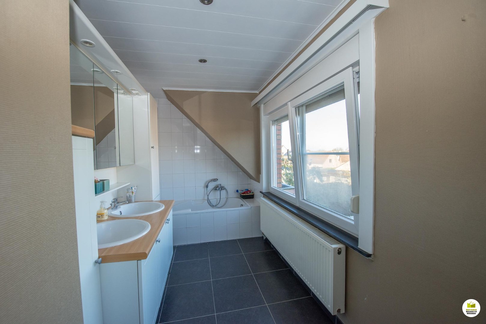 2de verdiep: 3 slaapkamers, badkamer met ligbad, dubbele wastafel en toilet. Zolder (geïsoleerd). Centrale verwarming op aardgas.