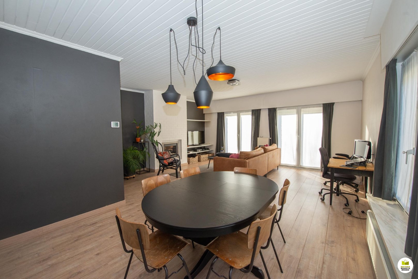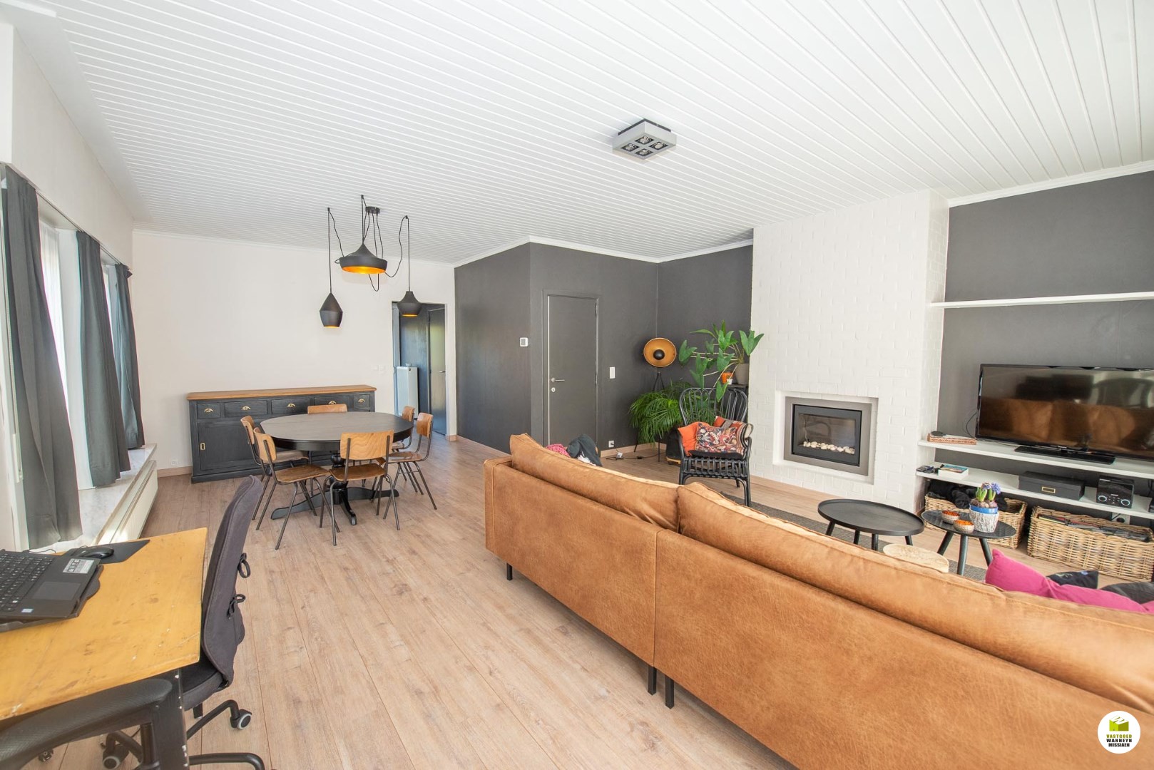 1ste verdiep: toilet, ruime en lichtrijke leefruimte met gashaard, keuken met ingebouwde frigo, oven, microgolf en vaatwas, trap naar tuin.