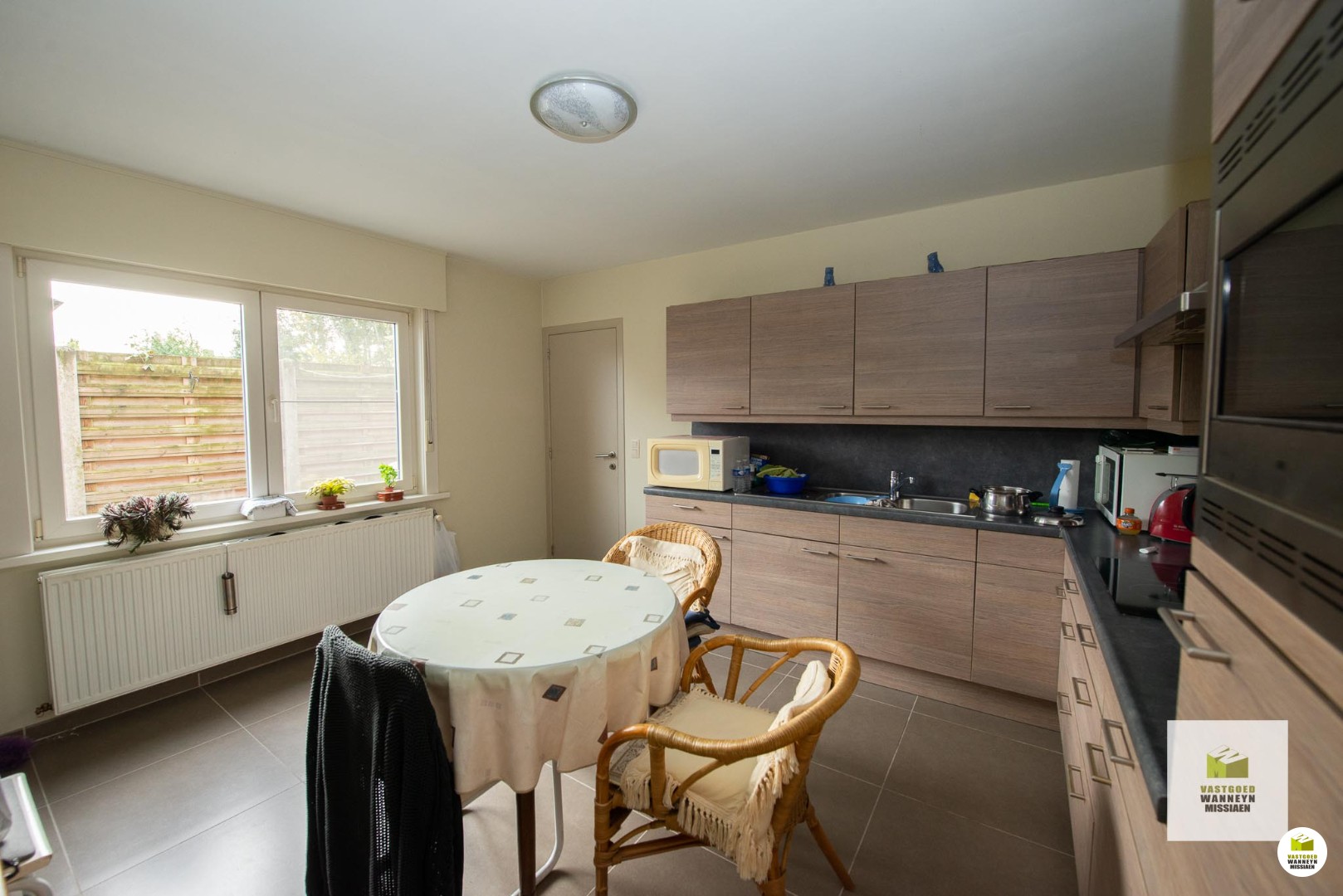 Gelijkvloers: inkom, lichtrijke living, ruime keuken uitgerust met keramische kookplaat, frigo en combi oven/microgolf, bergplaats met CV ketel (nieuwe hoogrendementsketel op aardgas), badkamer met inloopdouche en dubbele lavabo, afzonderlijk toilet, berging/wasplaats,, zonnige buitenruimte.