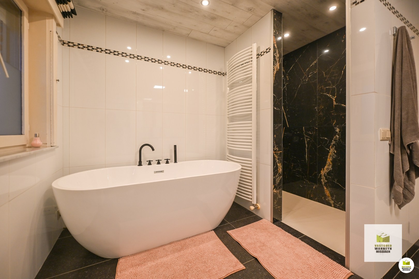 Op de eerste verdieping zijn er 4 slaapkamers en een badkamer. De badkamer werd uitgerust met een dubbele lavabo, ligbad en inloopdouche.