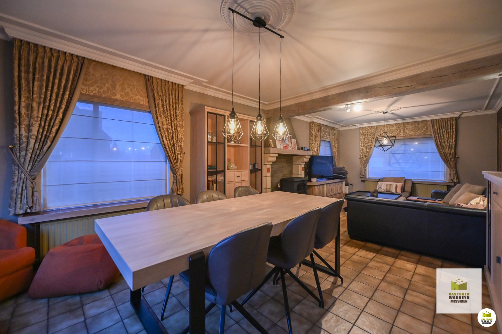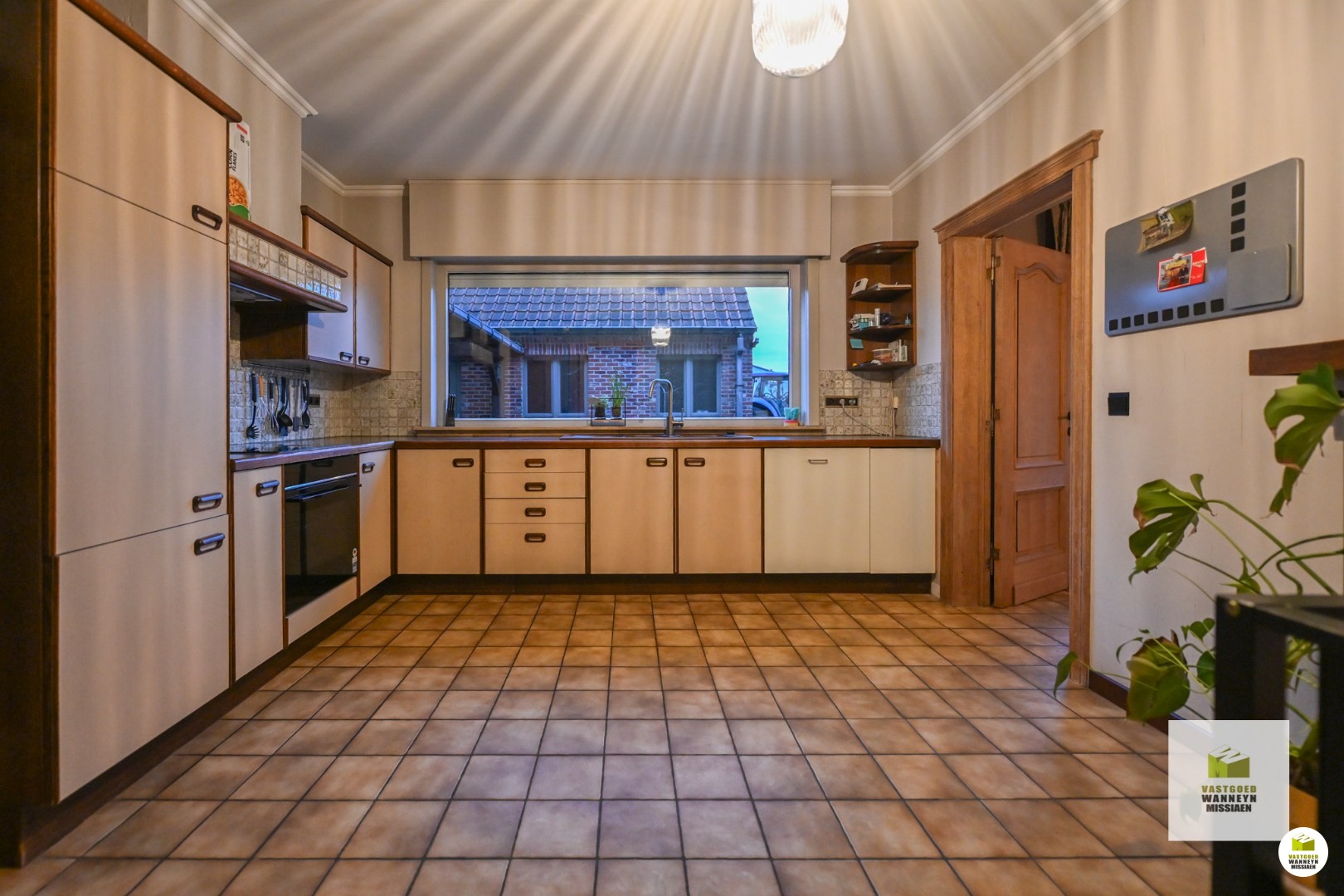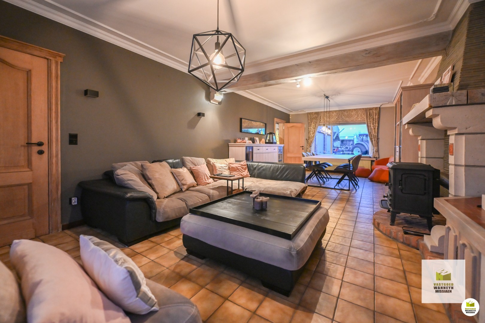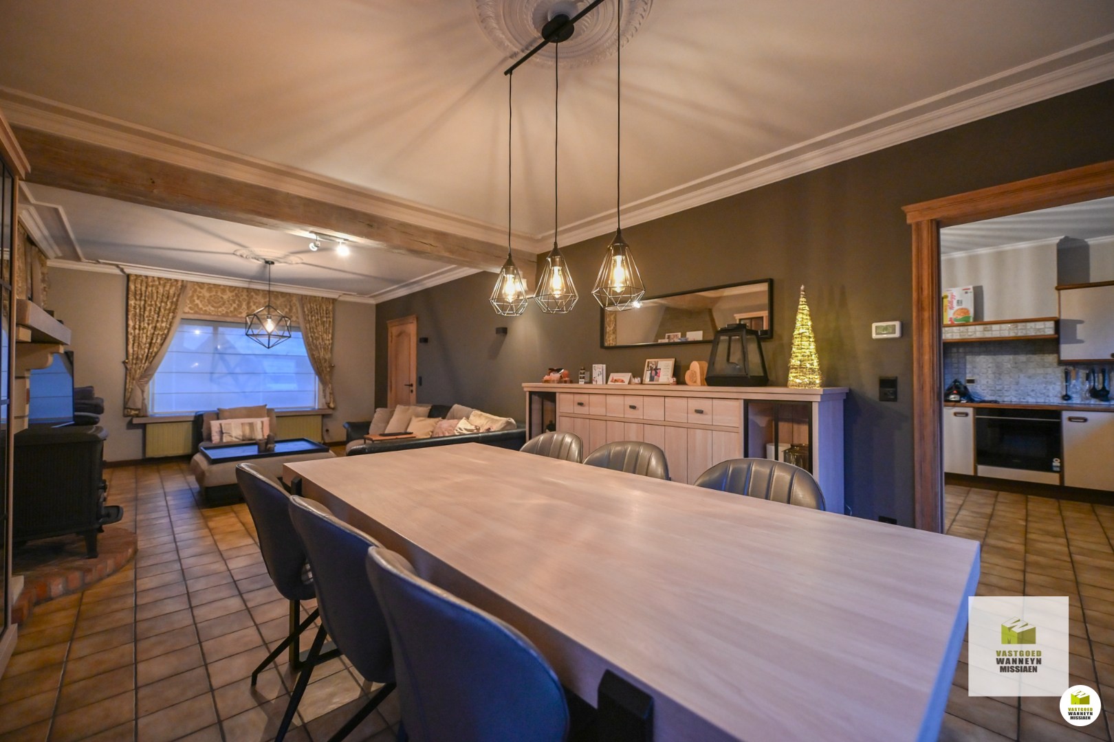 Verder is de leefruimte gelegen. Deze is onderverdeeld in de zithoek enerzijds en de eetplaats anderzijds. In deze ruimte is ook een houtkachel voorzien, die naast de nodige warmte ook voor de nodige sfeer en gezelligheid zorgt! Palend aan de eetplaats is de keuken gelegen. De keuken is ruim genoeg om er nog een eettafel te plaatsen en is uitgerust met alle toestellen om het hedendaags comfort mogelijk te maken: een ingebouwde vaatwas, ingebouwde oven, kookplaat en dampkap. Vanuit de keuken is ook zicht op de verharde ... buitenruimte. Naast de keuken vinden we enerzijds de berging terug, waar nog voldoende plaats is voor extra stockage, frigo en diepvries ect. Anderzijds is er ook nog een wasplaats met toegang tot de achterdeur en (overdekt) terras. De wasplaats werd voorzien van een ingebouwde kastenwand, alsook is er voorziening voor wasmachine en droogkast.