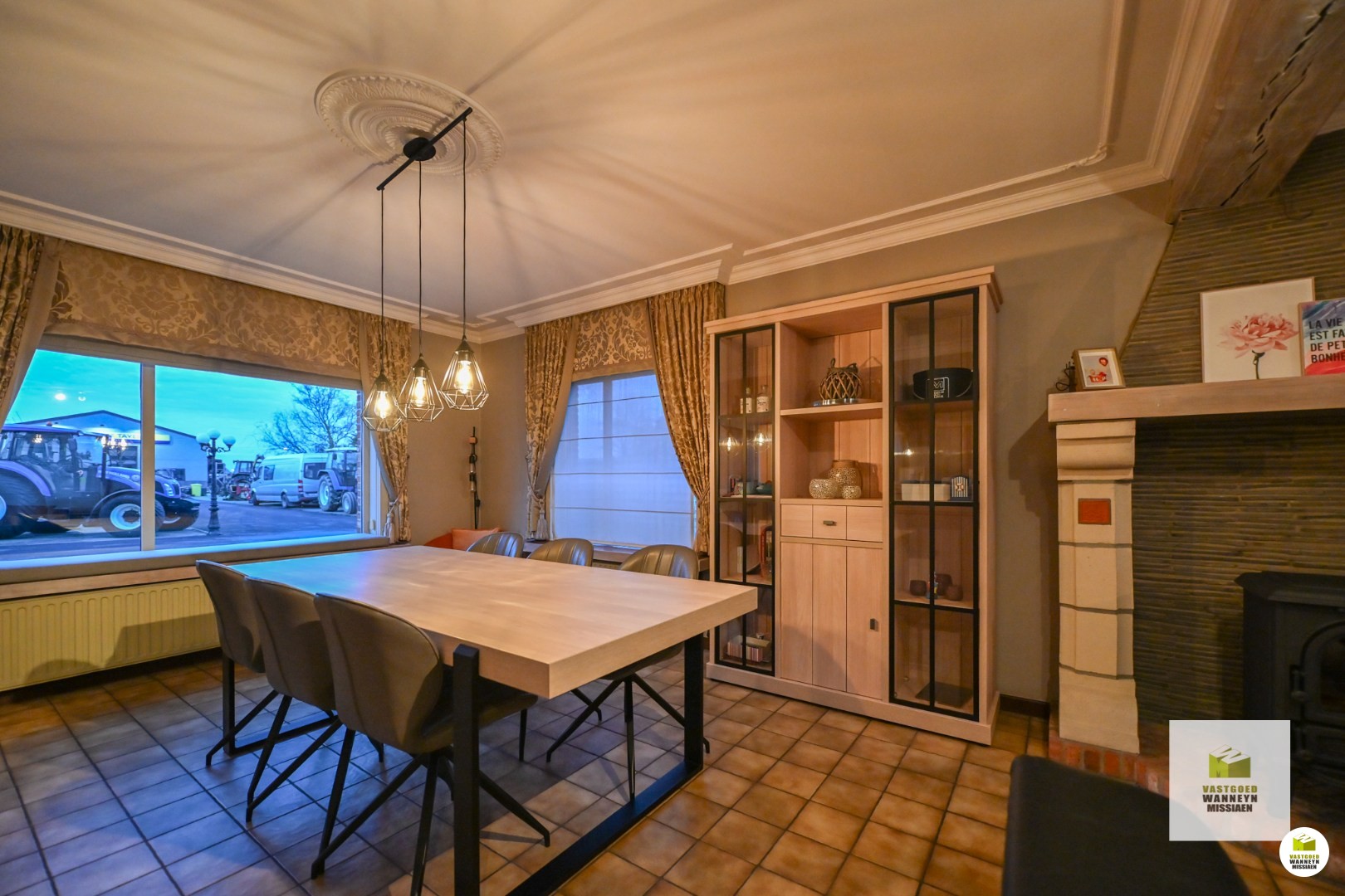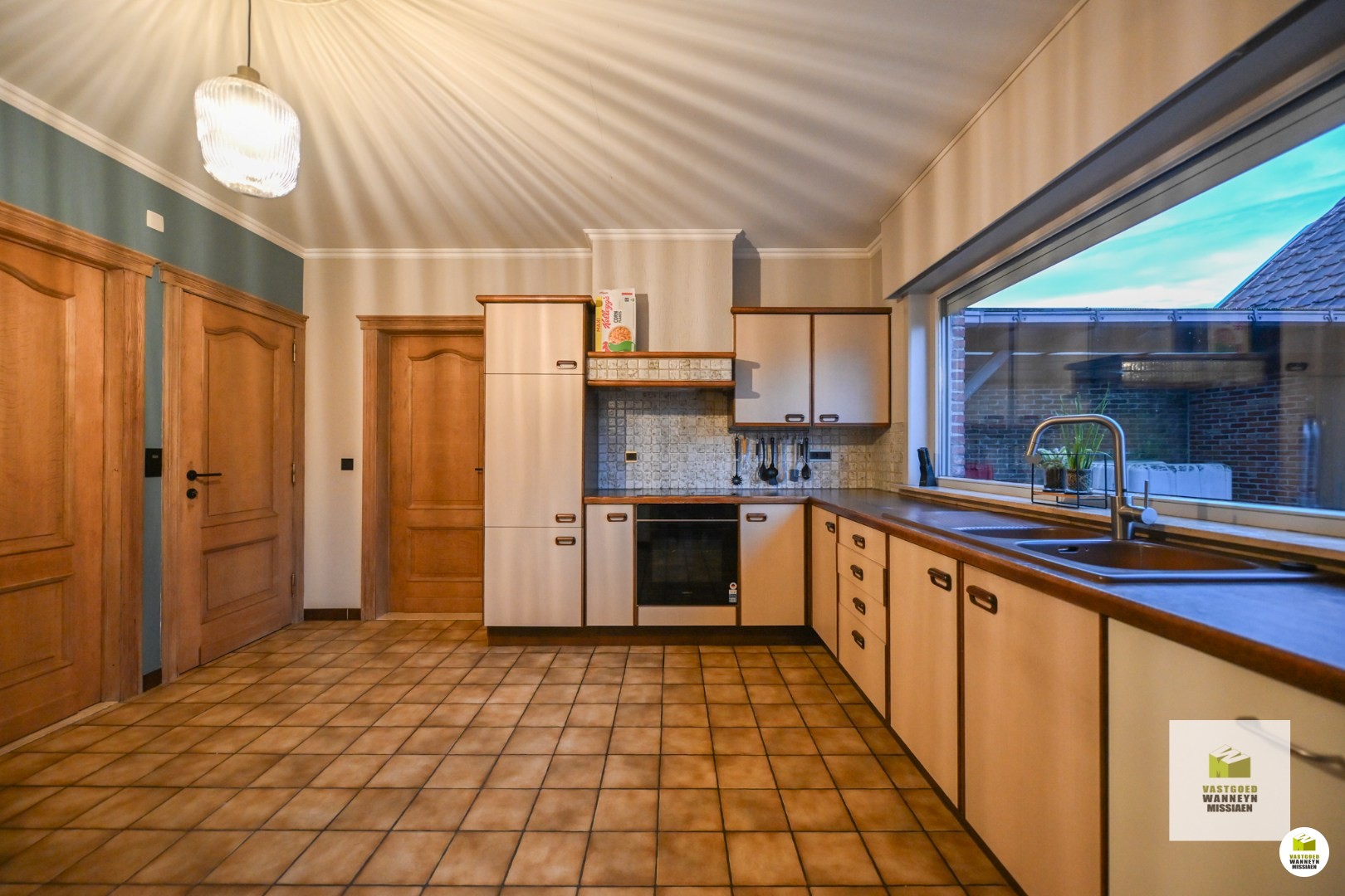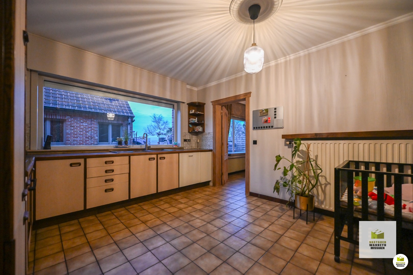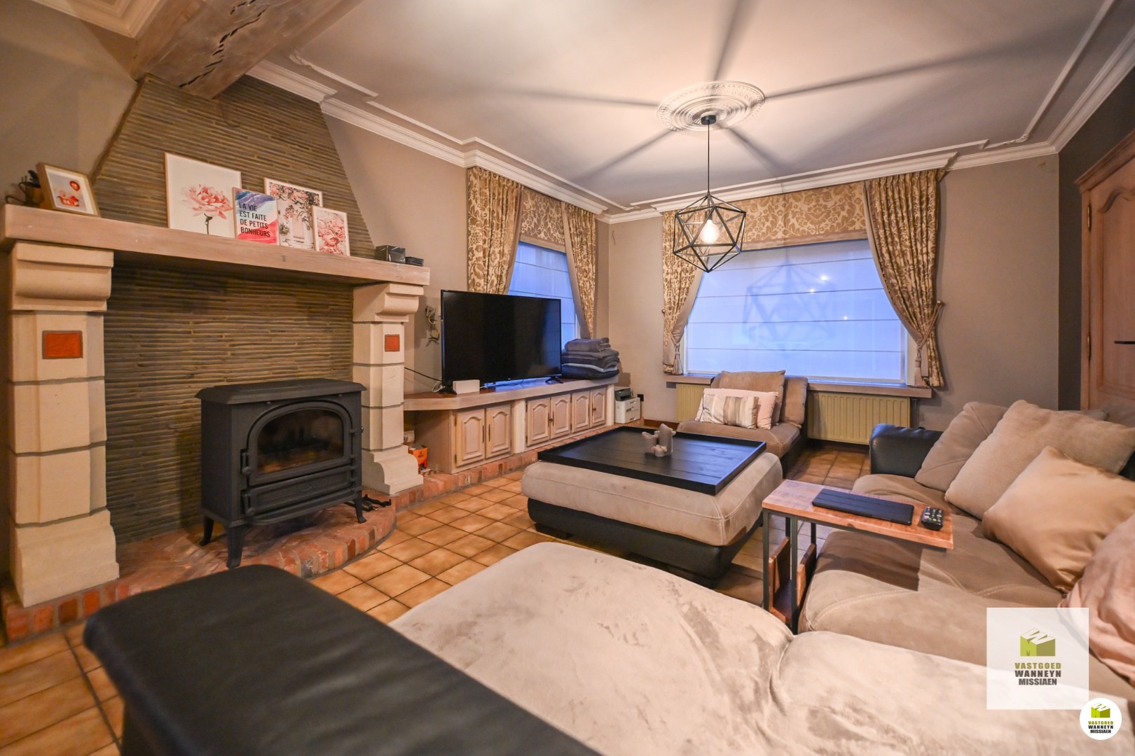 Verder is de leefruimte gelegen. Deze is onderverdeeld in de zithoek enerzijds en de eetplaats anderzijds. In deze ruimte is ook een houtkachel voorzien, die naast de nodige warmte ook voor de nodige sfeer en gezelligheid zorgt! Palend aan de eetplaats is de keuken gelegen. De keuken is ruim genoeg om er nog een eettafel te plaatsen en is uitgerust met alle toestellen om het hedendaags comfort mogelijk te maken: een ingebouwde vaatwas, ingebouwde oven, kookplaat en dampkap. Vanuit de keuken is ook zicht op de verharde ... buitenruimte. Naast de keuken vinden we enerzijds de berging terug, waar nog voldoende plaats is voor extra stockage, frigo en diepvries ect. Anderzijds is er ook nog een wasplaats met toegang tot de achterdeur en (overdekt) terras. De wasplaats werd voorzien van een ingebouwde kastenwand, alsook is er voorziening voor wasmachine en droogkast.