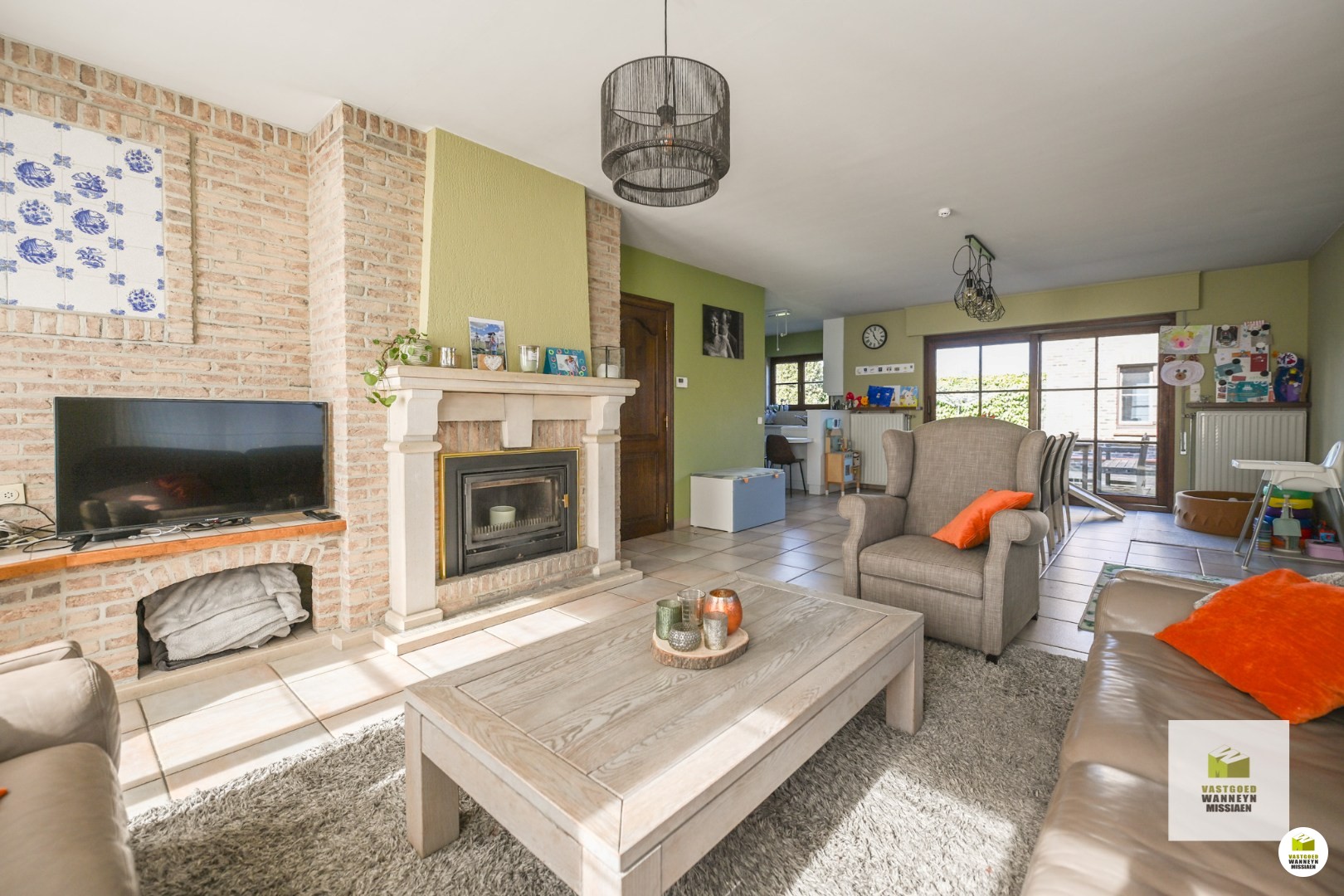 Vervolgens komen we in de lichtrijke leefruimte. Deze is opgedeeld in een zithoek en de eetplaats. Centraal bij de zithoek is een houtkachel voorzien. Deze zorgt tijdens de wintermaanden voor extra sfeer, gezelligheid en uiteraard warmte.