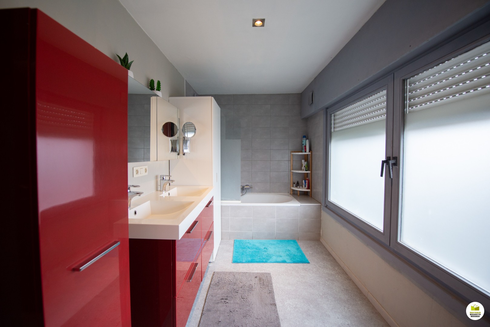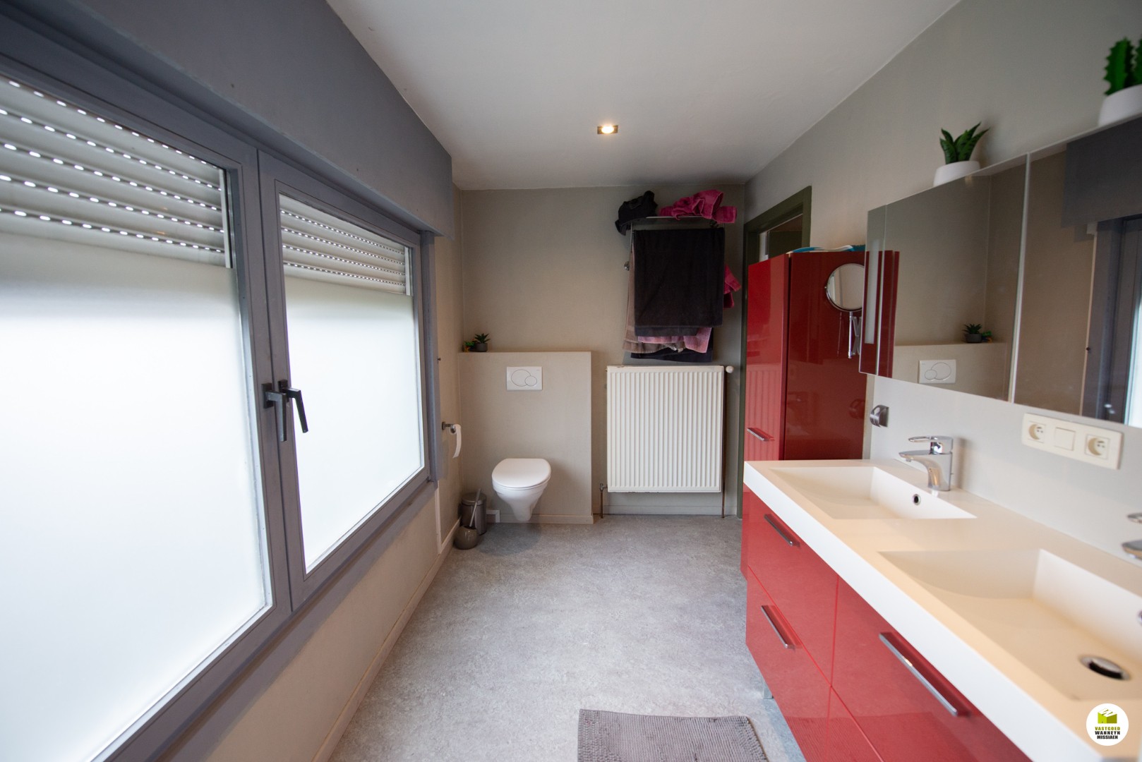 Op de eerste verdieping: badkamer met dubbele lavabo, toilet, ... ligbad, ingebouwde dressing, eerste slaapkamer.