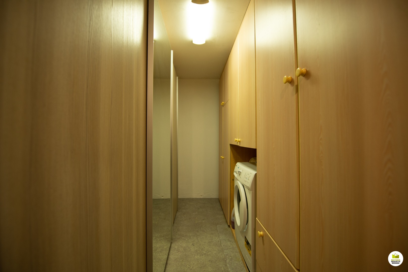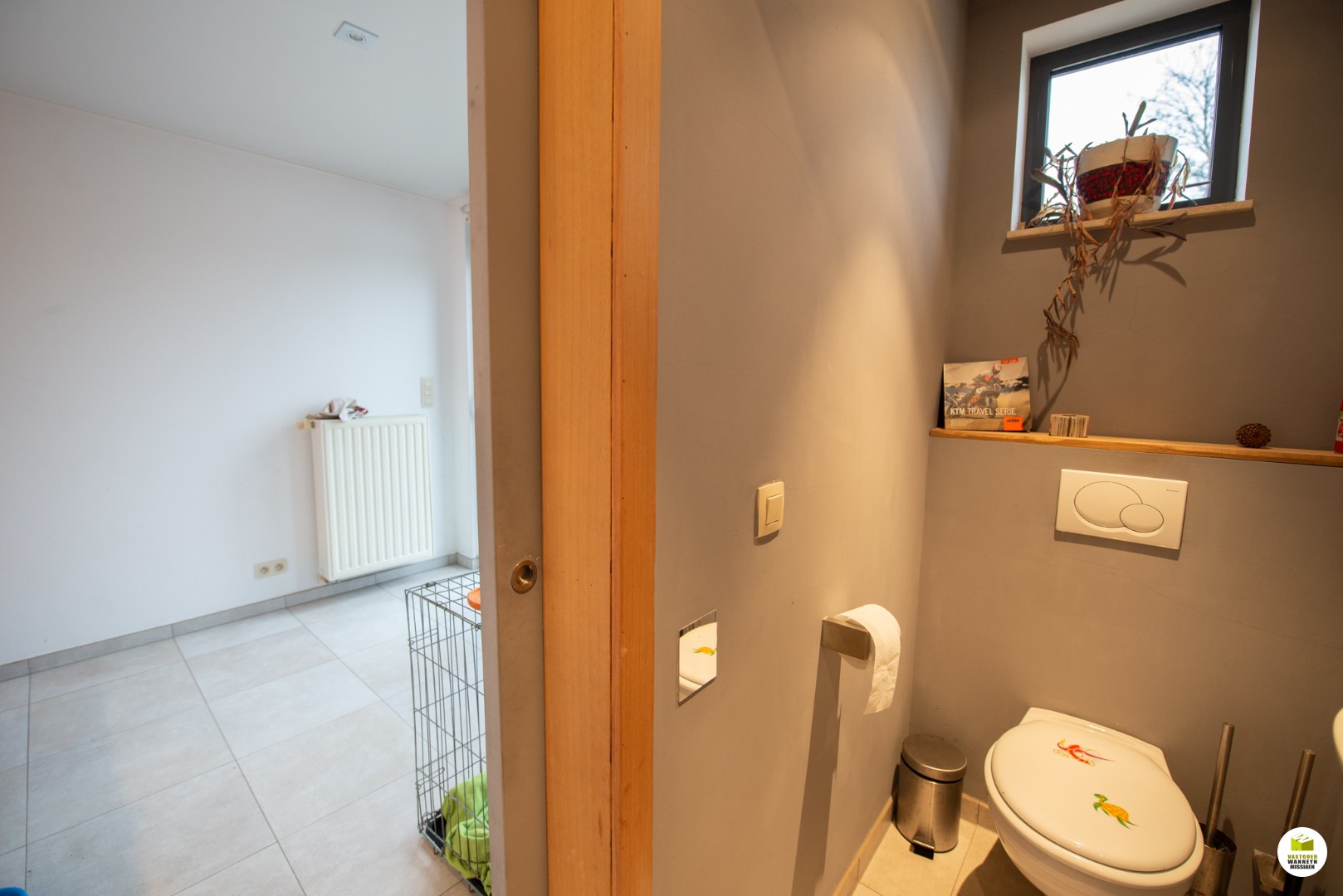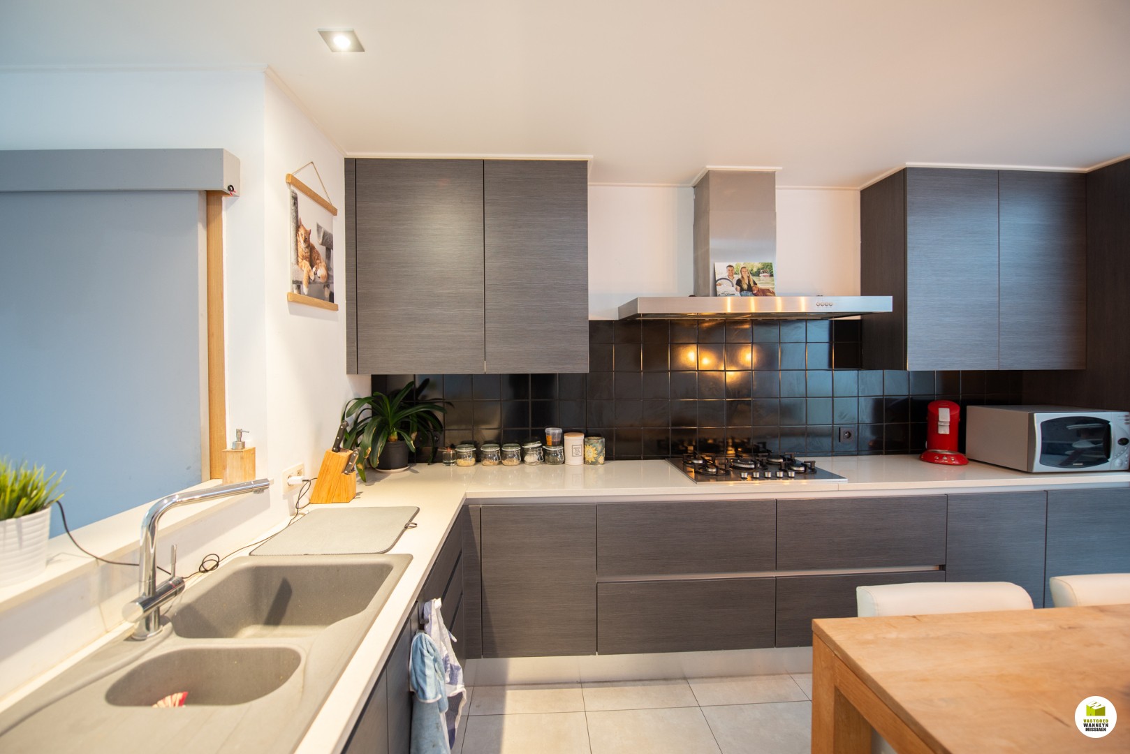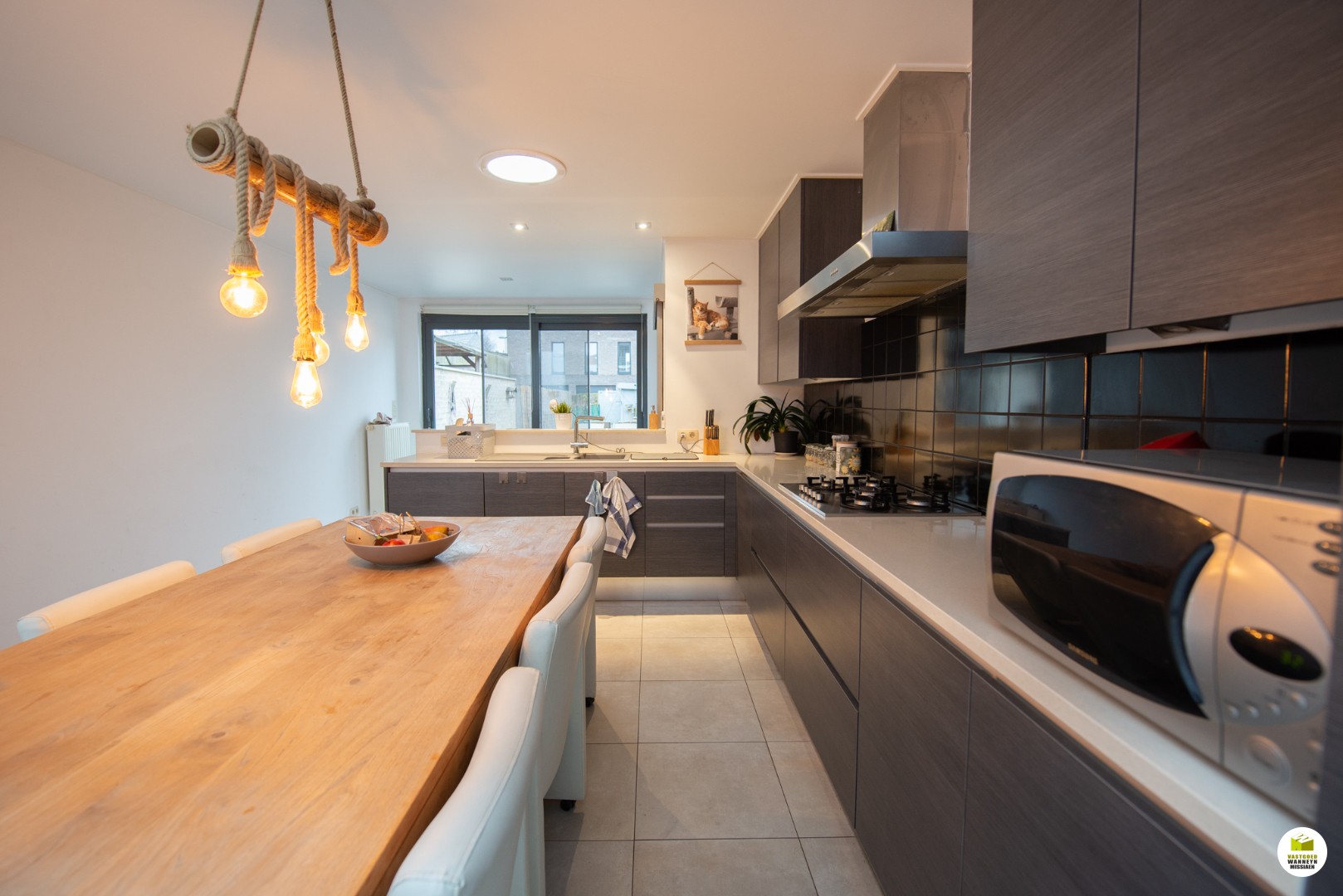 De keuken is uitgerust met een vaatwas, wasbak, frigo, diepvries, dampkap, oven en een microgolf kan ingewerkt worden. Koken gebeurt op gas. Zowel de keuken als de leefruimte werden voorzien van voldoende ramen zodat men altijd kan genieten van voldoende daglicht. Achter de keuken kan men nog een toilet terugvinden.