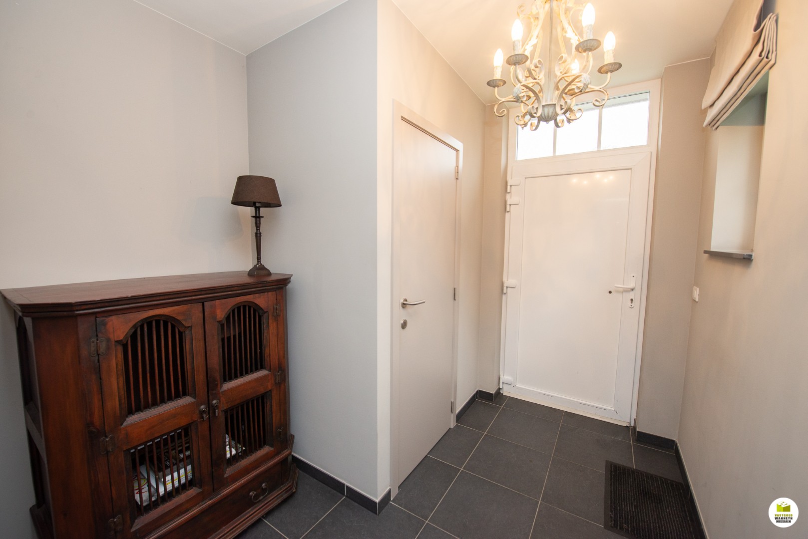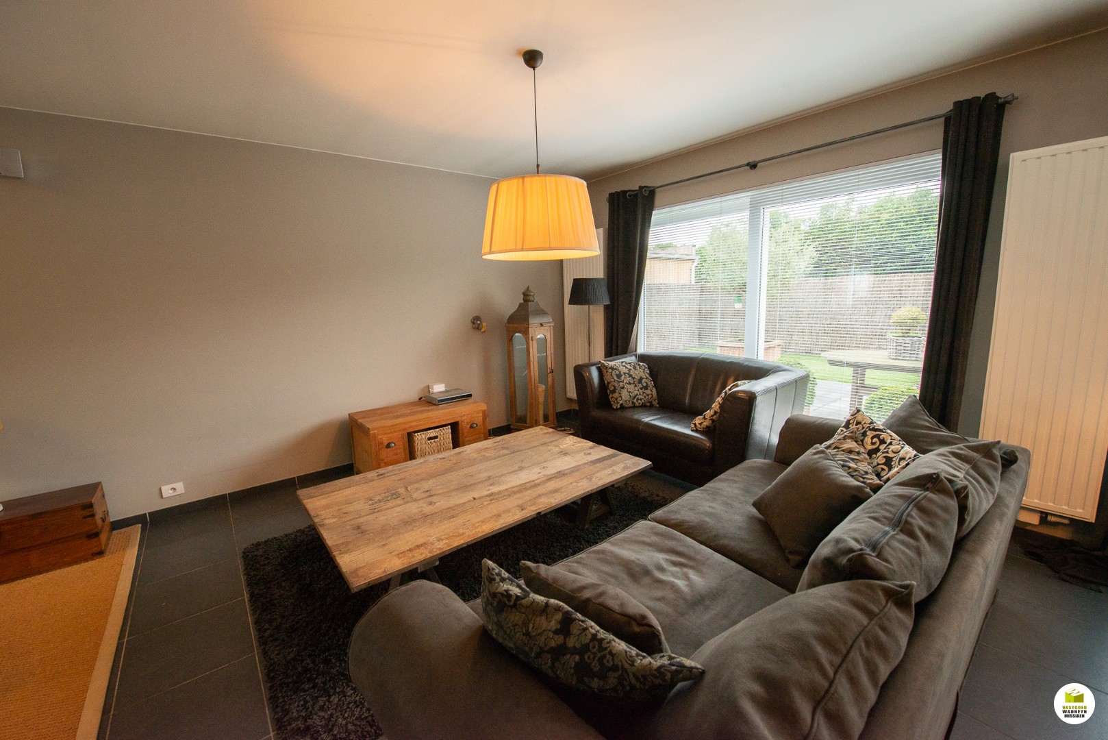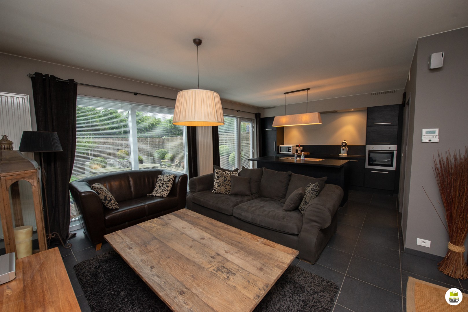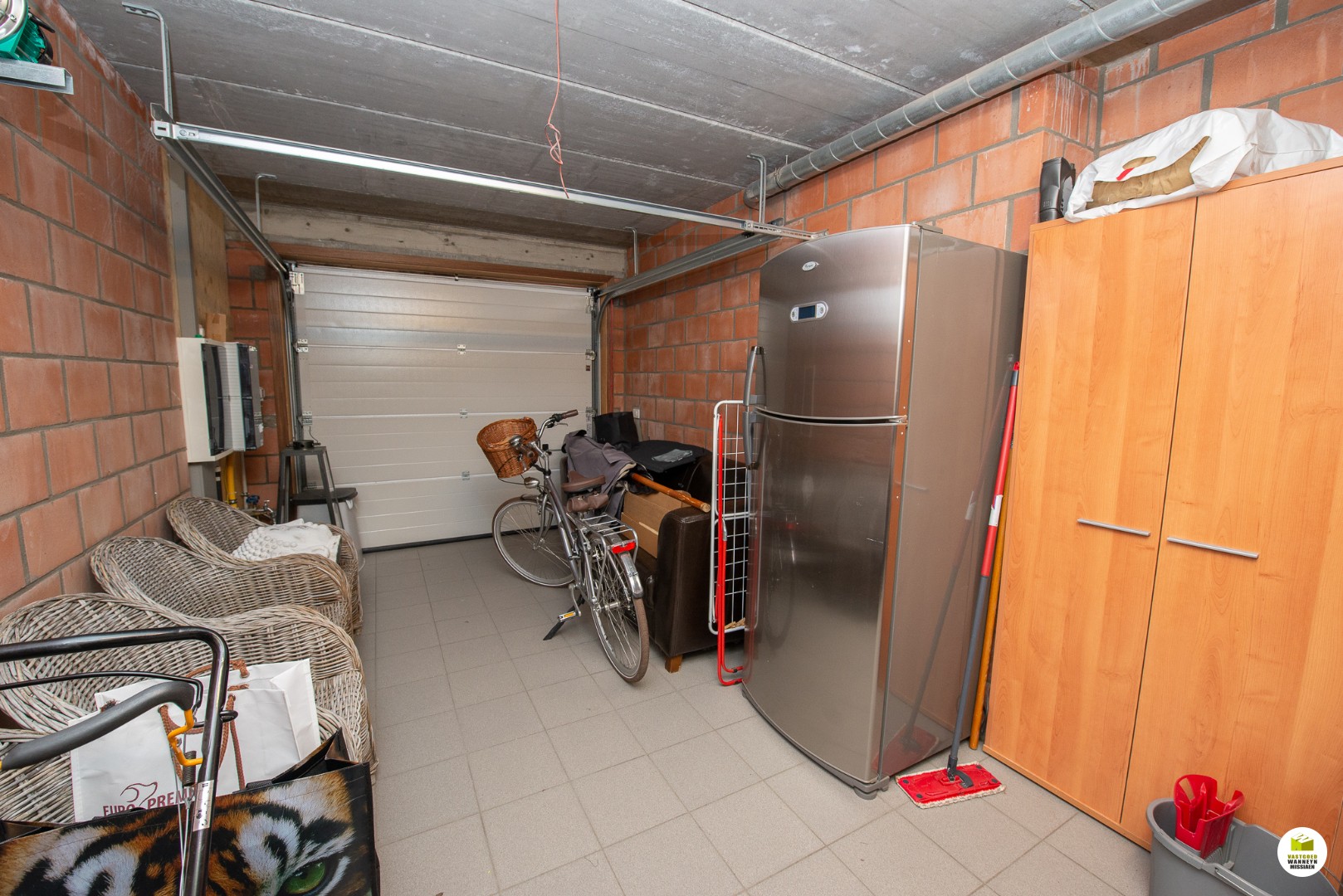 Ruime inkom met gastentoilet, leefruimte met open keuken (frigo, oven, microgolf, kookplaat), garage met sectionale poort.