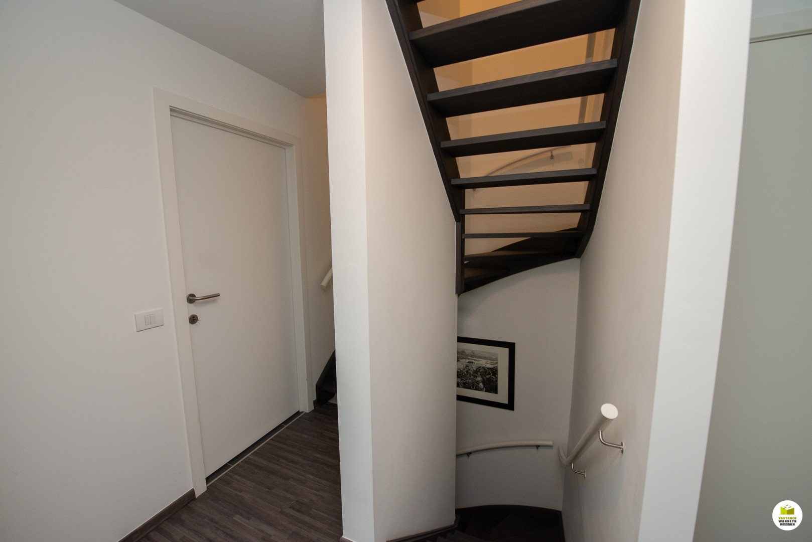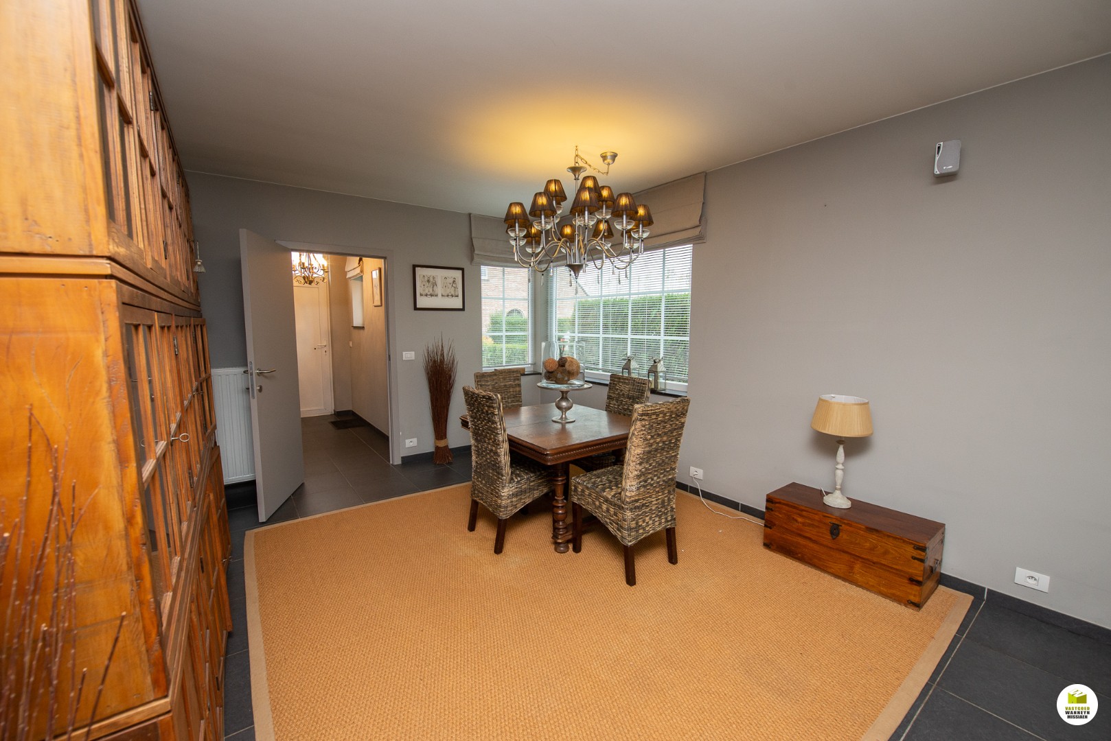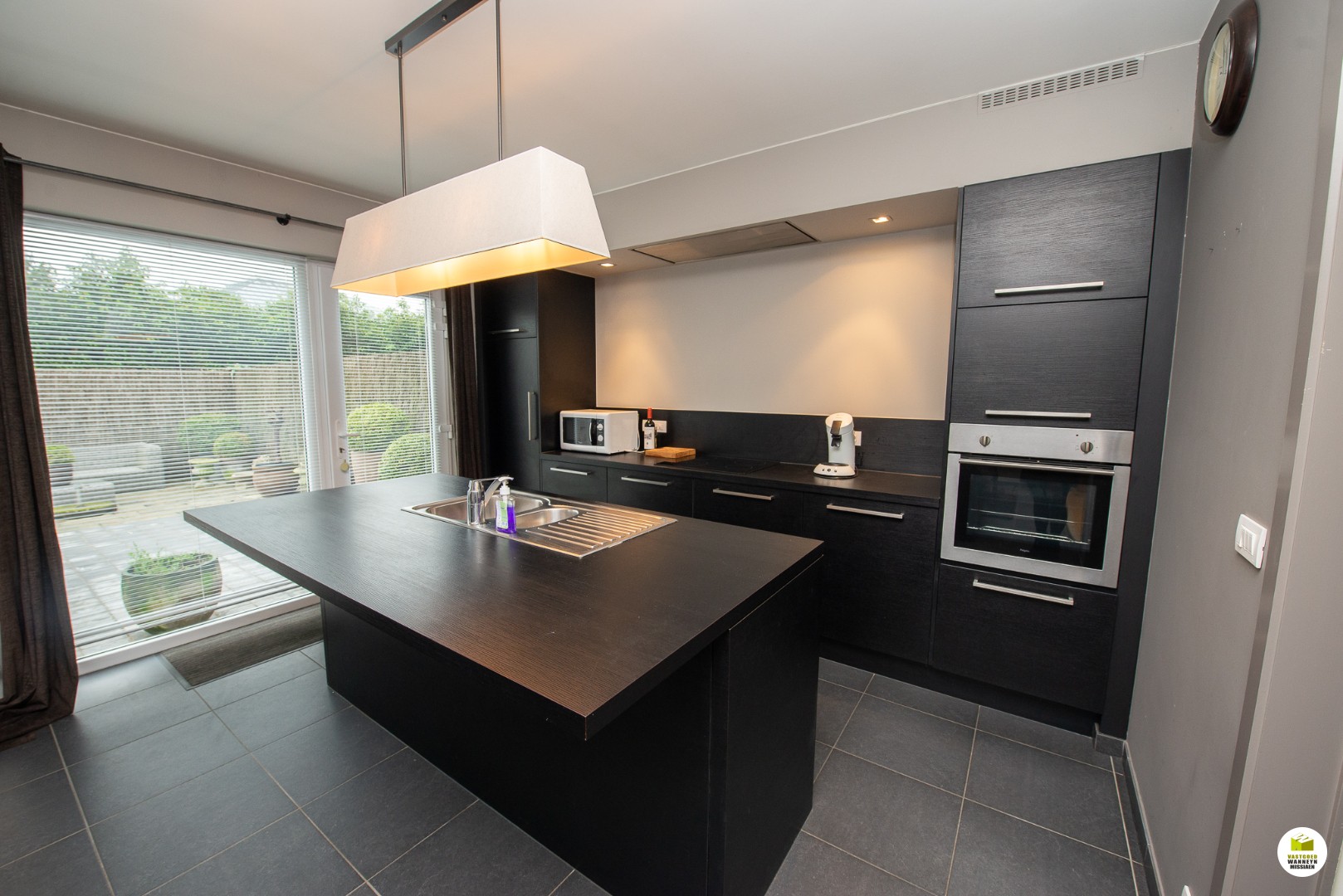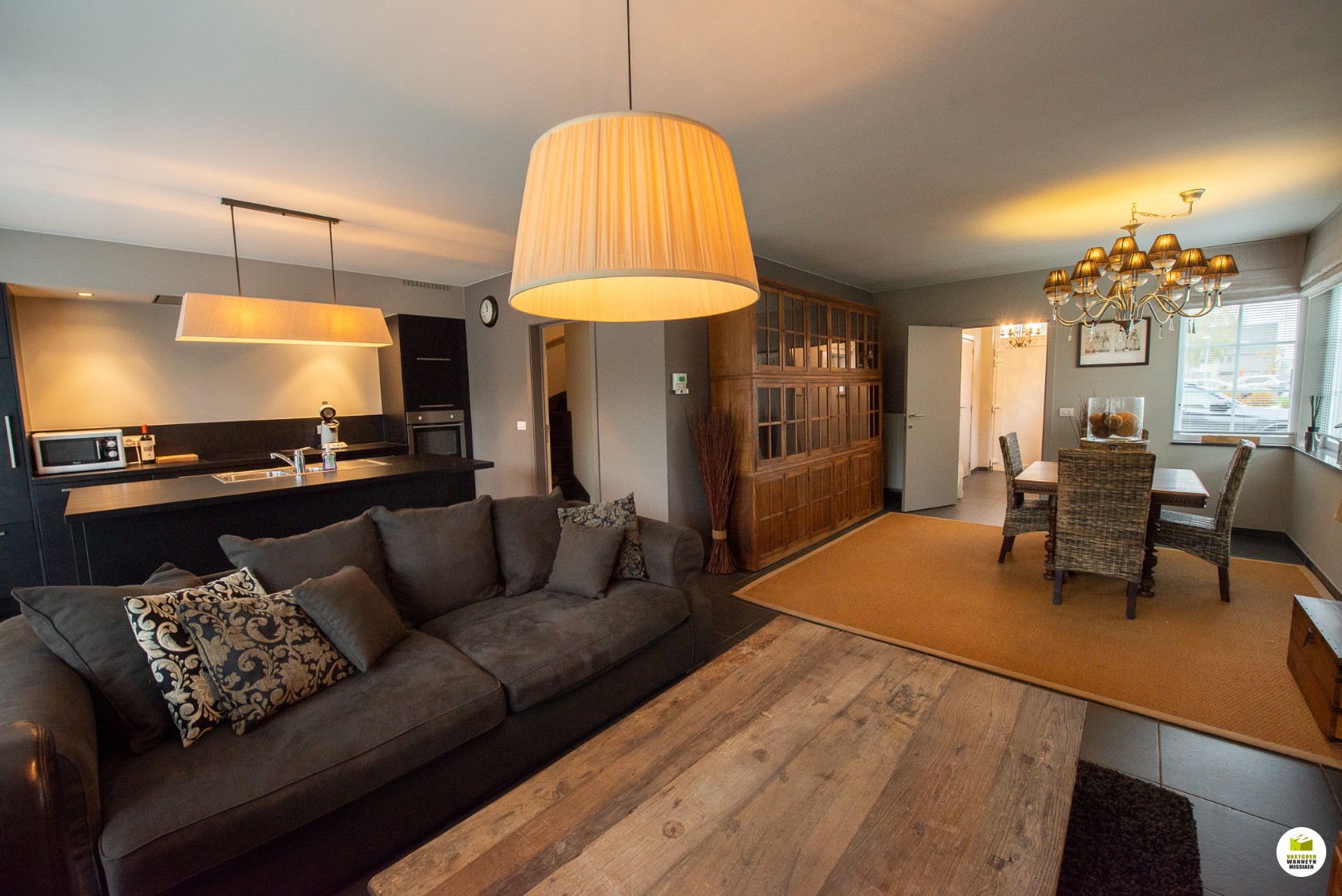Ruime inkom met gastentoilet, leefruimte met open keuken (frigo, oven, microgolf, kookplaat), garage met sectionale poort.