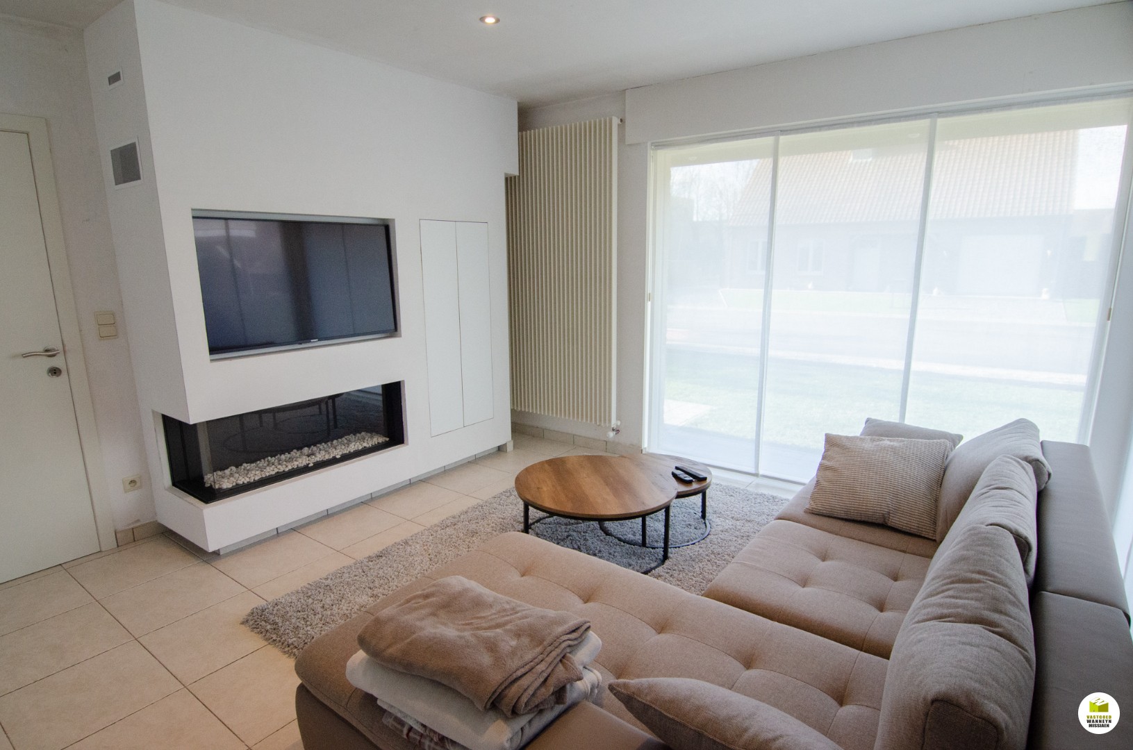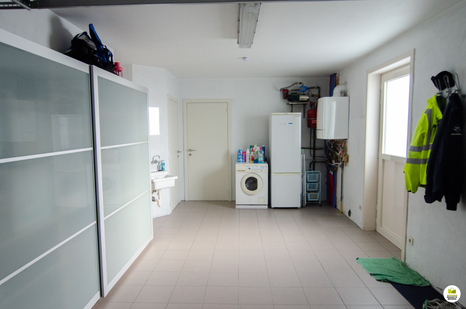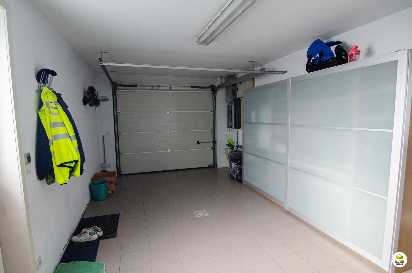 Indeling: een inkom met een gastentoilet en trap naar boven. Vervolgens komen we terecht in een grote, lichtrijke leefruimte met ingebouwde kasten en gashaard. Aansluitend vinden we de volledig uitgeruste keuken (combi-oven, vaatwas, frigo, kookplaat...). Zowel via de leefruimte als via de keuken hebben we toegang tot het terras. Vanuit de keuken kunnen we ook naar de garage met ingebouwde kasten, aparte berging, lavabo en aparte douchekabine. De garage is bovendien voorzien van een automatische sectionale poort.