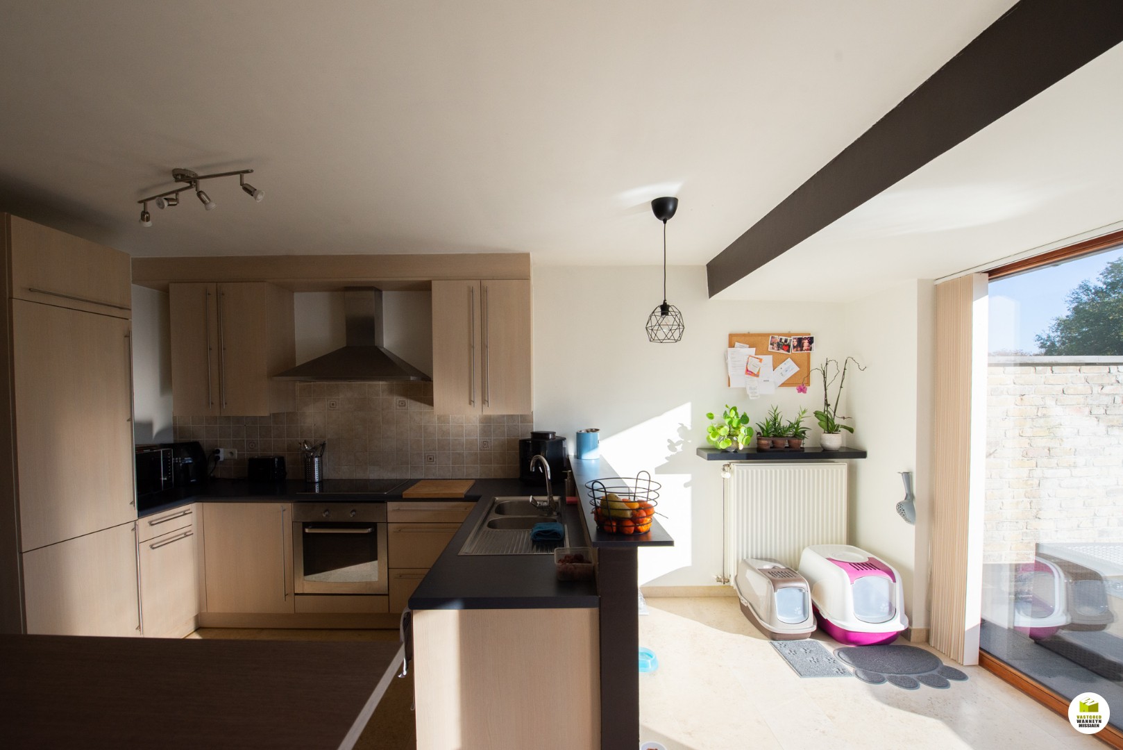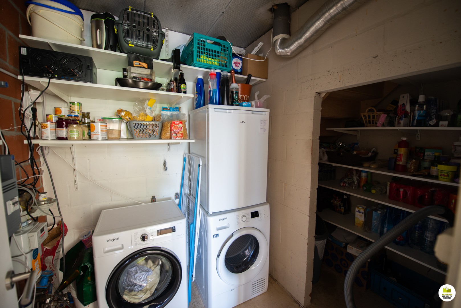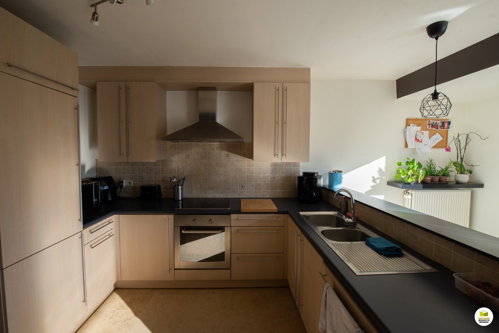 Gelijkvloers: inkomhal met gastentoilet, leefruimte met mooi zicht op de zonnige tuin, halfopen keuken (frigo, vaatwas, oven) met aansluitend een koele berging/wasplaats.
