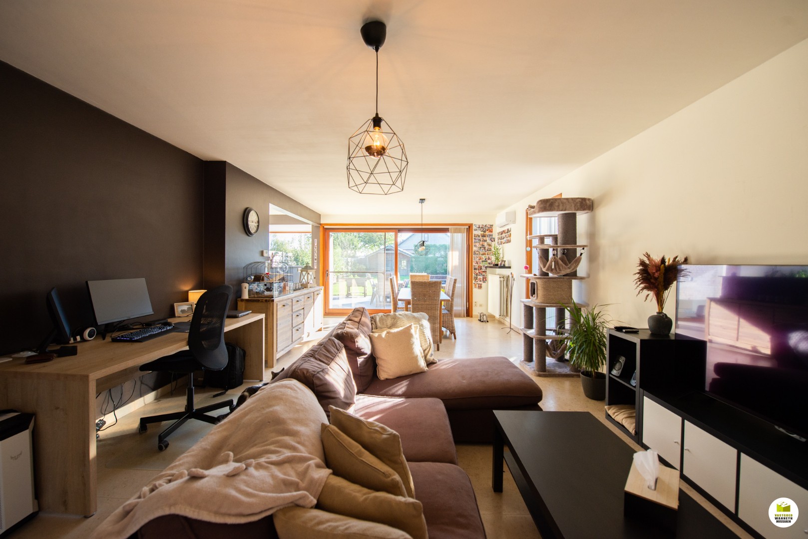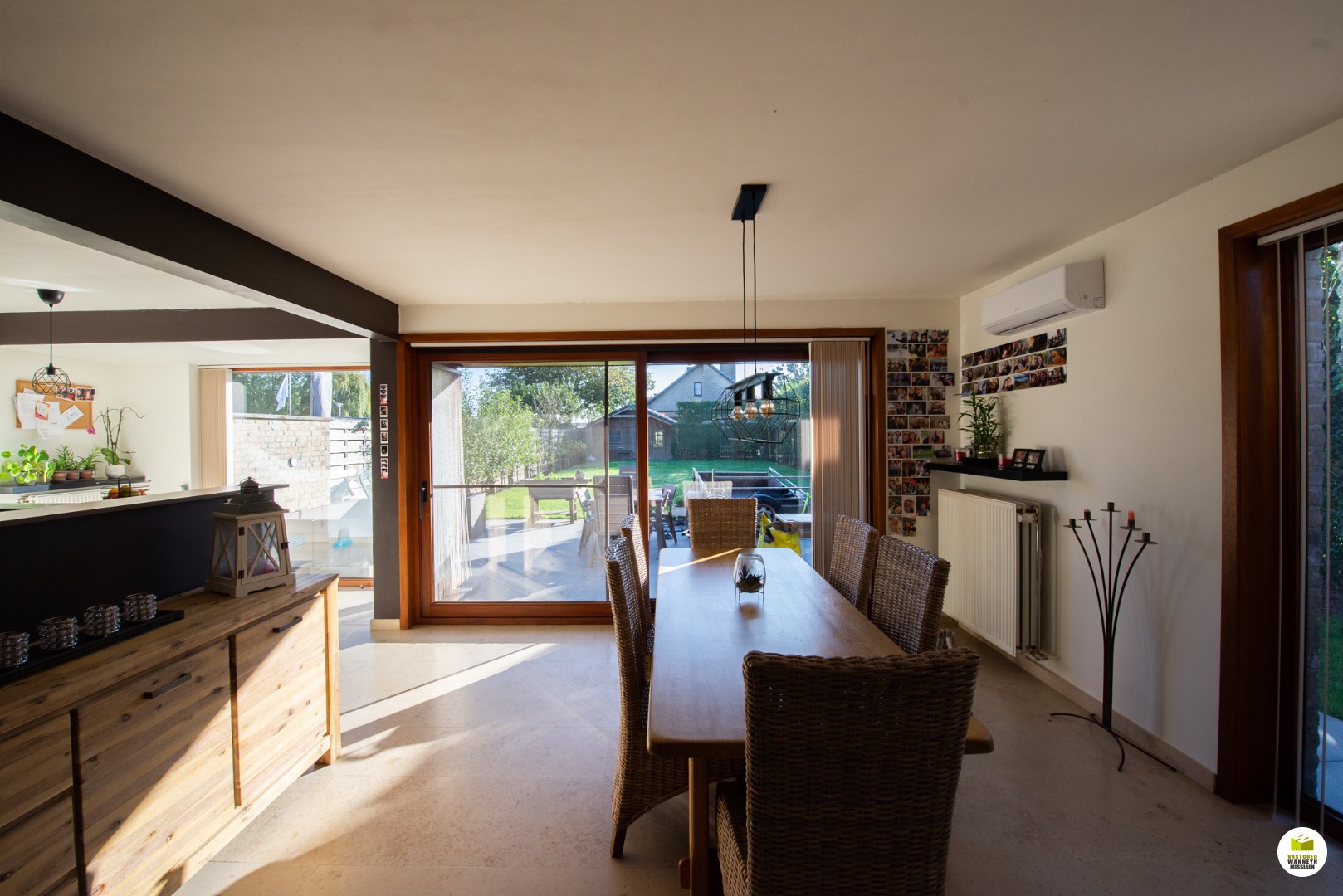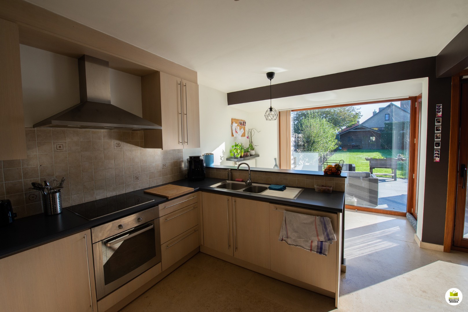 Gelijkvloers: inkomhal met gastentoilet, leefruimte met mooi zicht op de zonnige tuin, halfopen keuken (frigo, vaatwas, oven) met aansluitend een koele berging/wasplaats.