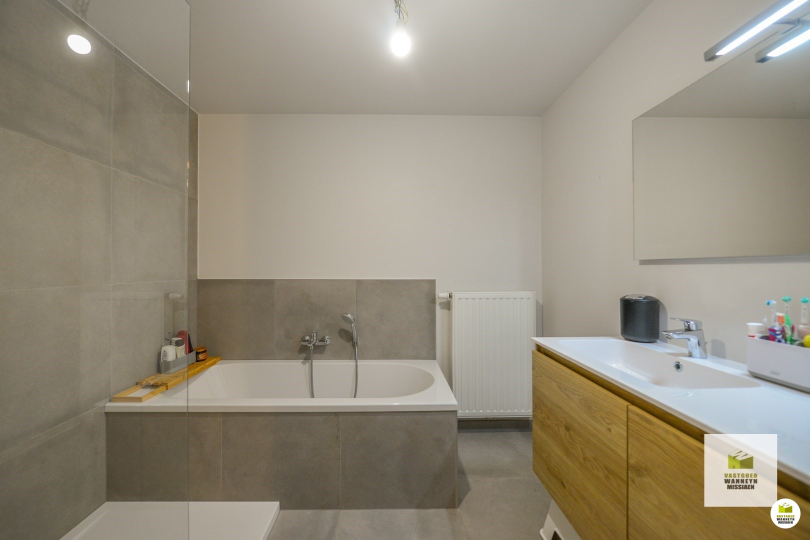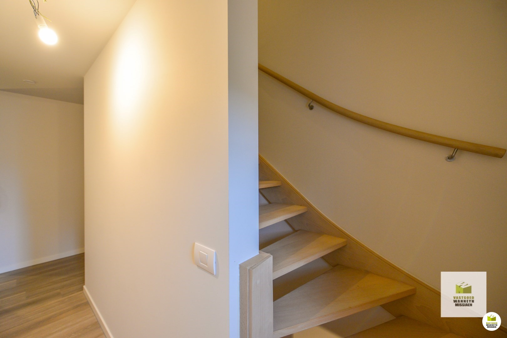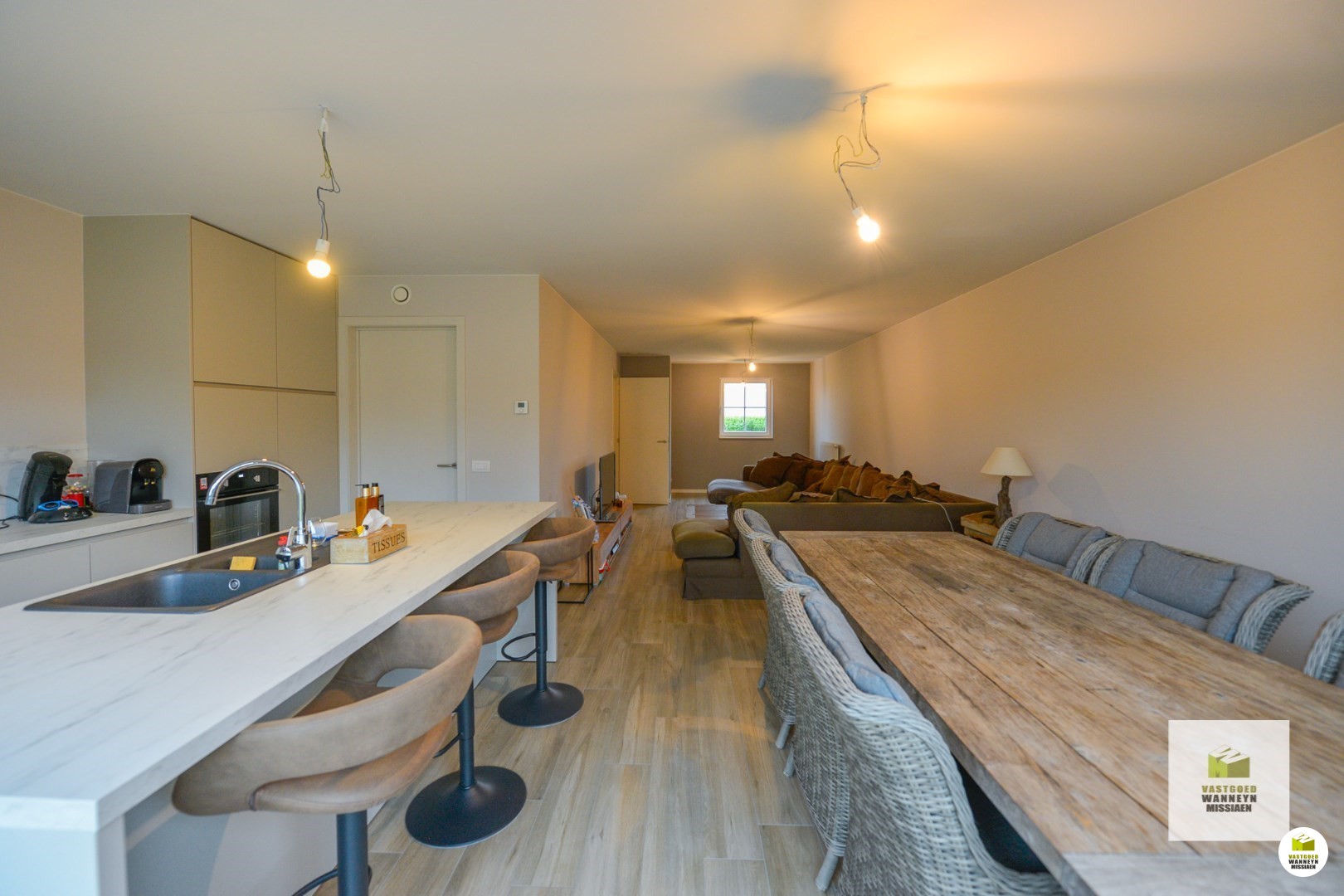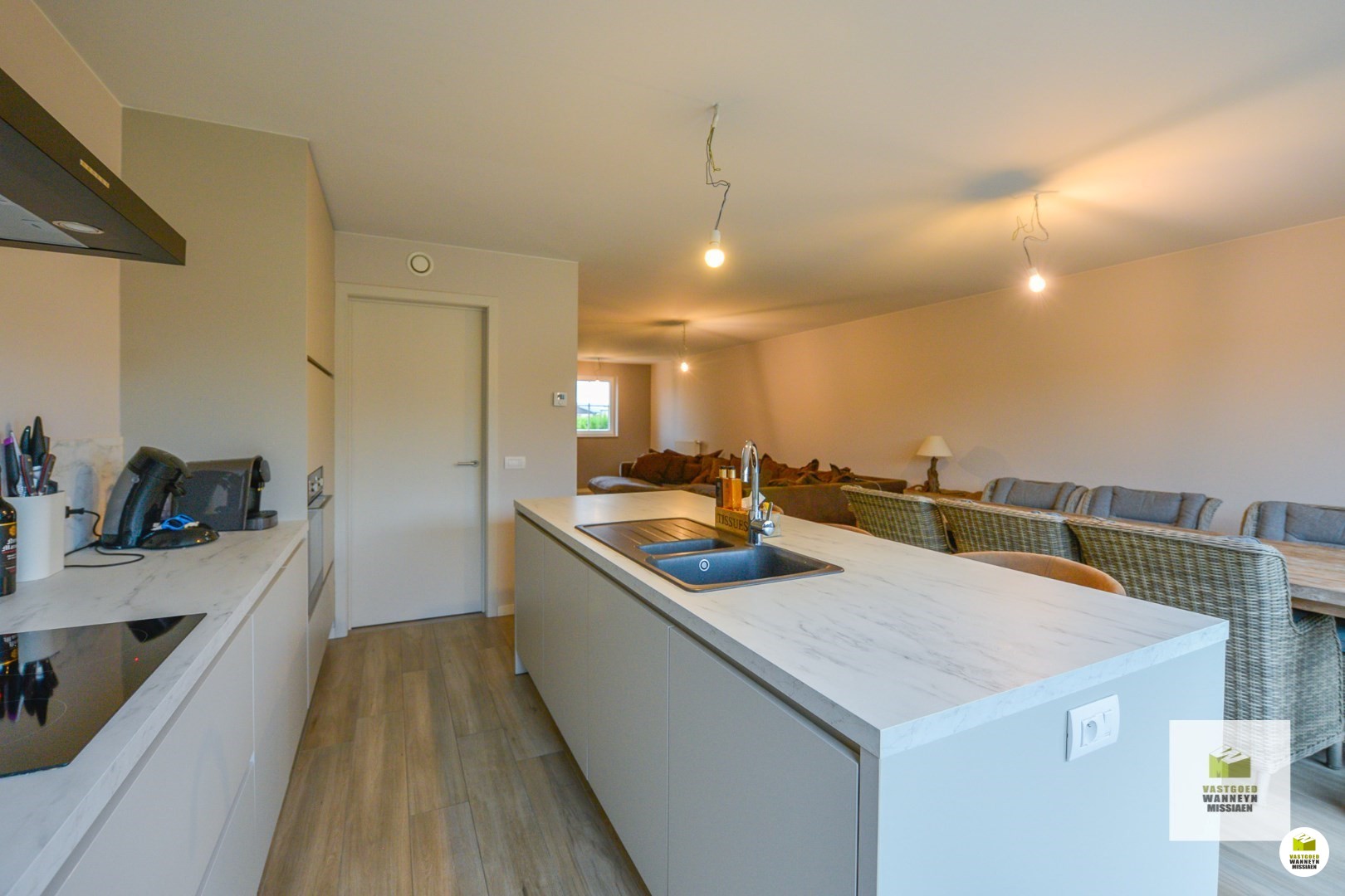 Indeling: binnenkomen in een aparte inkomhal met apart gastentoilet. Vervolgens is de ruime en lichtrijke leefruimte gelegen met open keuken. De keuken werd ingericht met alle toestellen: vaatwasmachine, combi-oven, ingebouwde frigo, dampkap, spoelbak, kookplaat ect. Palend aan de keuken is nog een praktische berging gelegen, waar nog voldoende ruimte is voor een extra frigo en/of diepvriezer, wasmachine, droogkast en stockage.