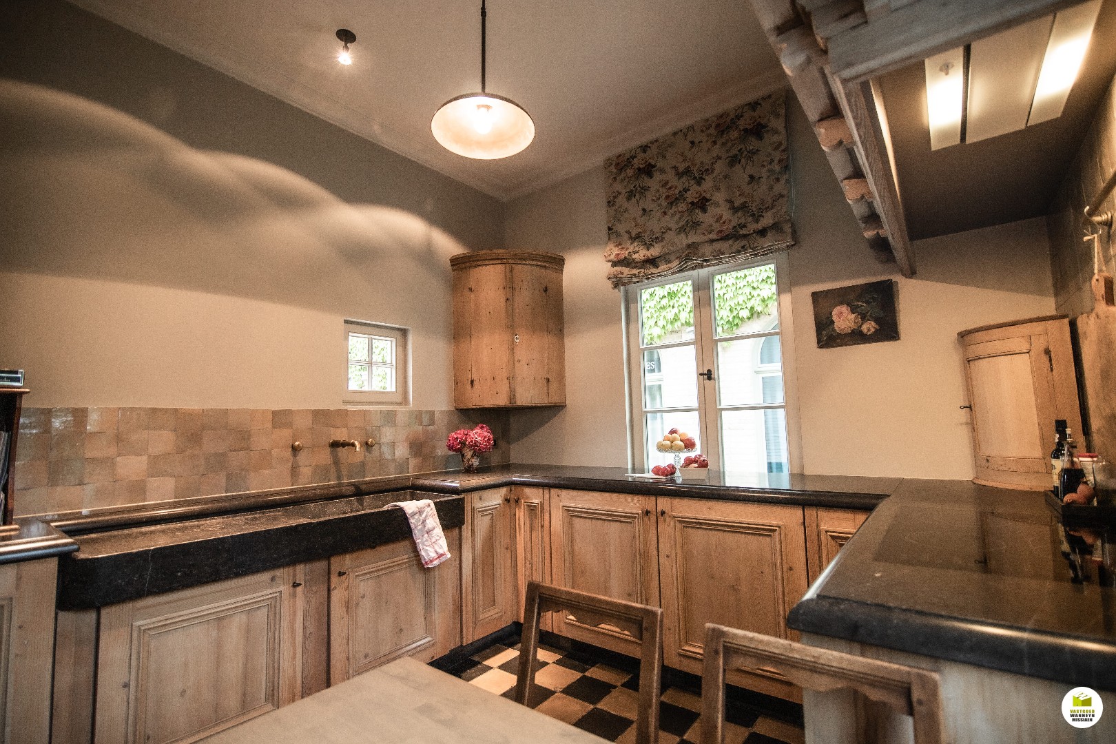 De landelijke keuken is een ontwerp van Dries Bonamie en is uitgerust met een ... frigo, diepvries, vaatwas en vlak ingefreesde keramische kookplaat, het werkblad is een massief graniet. Via buiten is de kelder bereikbaar, deze is uitermate geschikt voor een mooie wijncollectie.