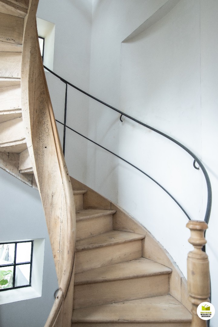 Via de massief grenen draaitrap komt u op de 1ste verdieping met een ruime slaapkamer, aansluitend bureau of 2de slaapkamer, badkamer met ligbad, ingebouwde dressing, wasplaats en opslagruimte en een afzonderlijk toilet.