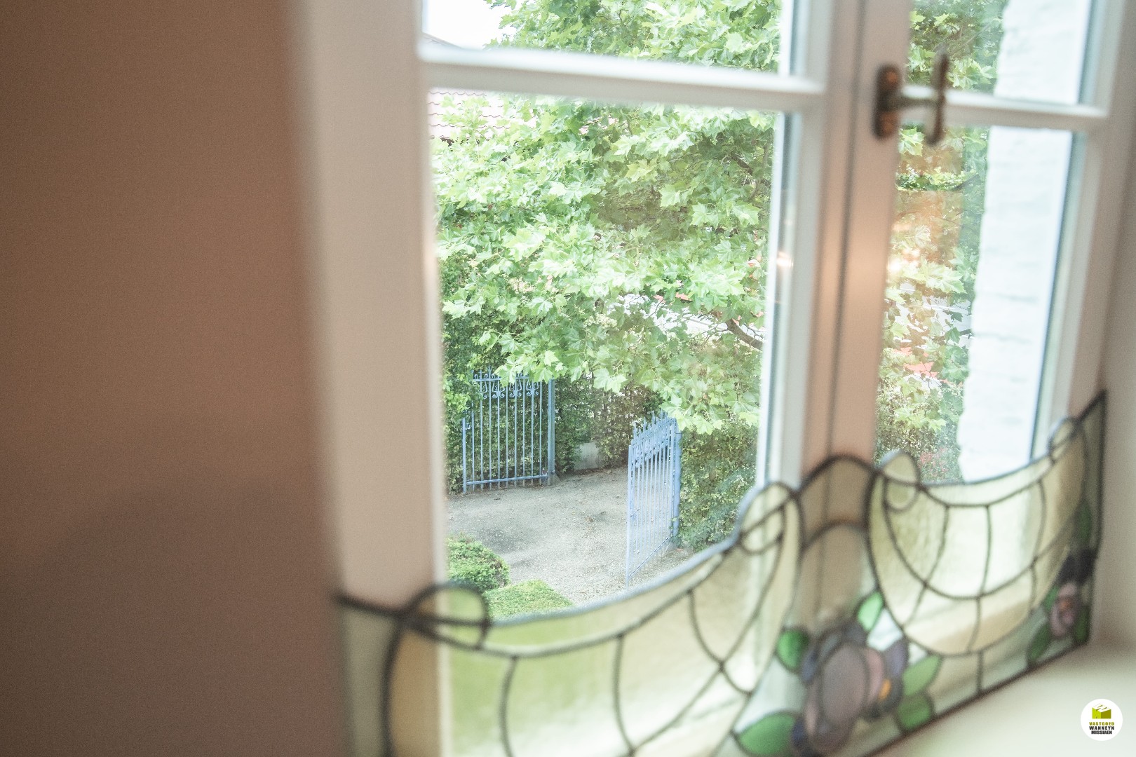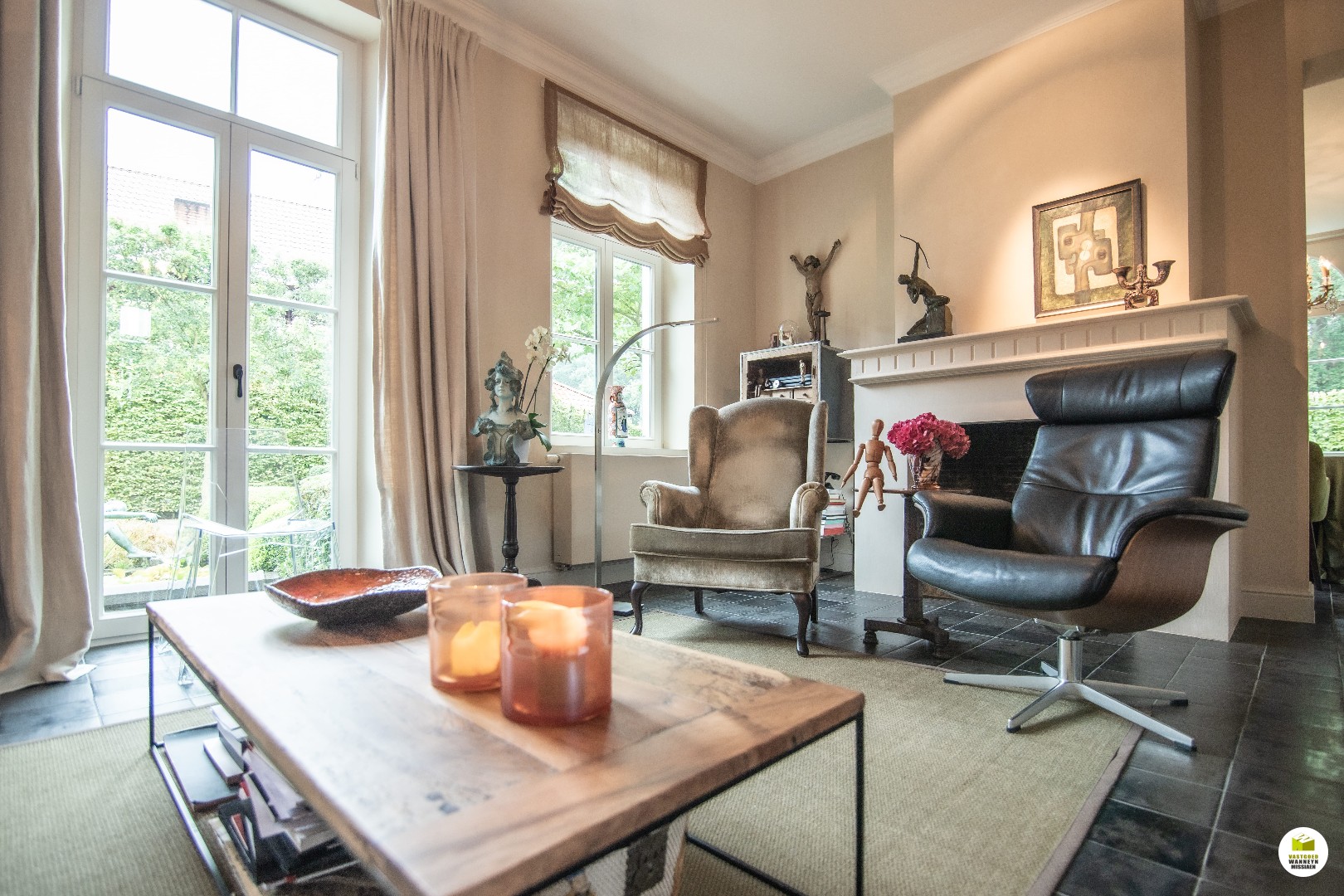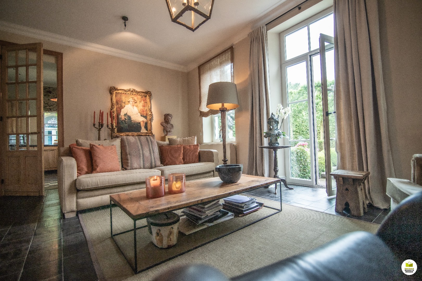 Het kasteeltje komt u binnen via de mooie inkomhal met gastentoilet, via de dubbele deur komt u in de karaktervolle leefruimte met aanpalende salonruimte waar het hoge plafond met sierlijsten en de mooie lichtinval meteen charmeren.