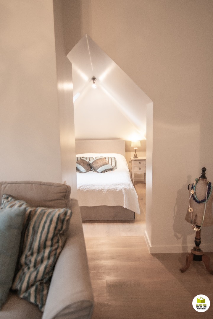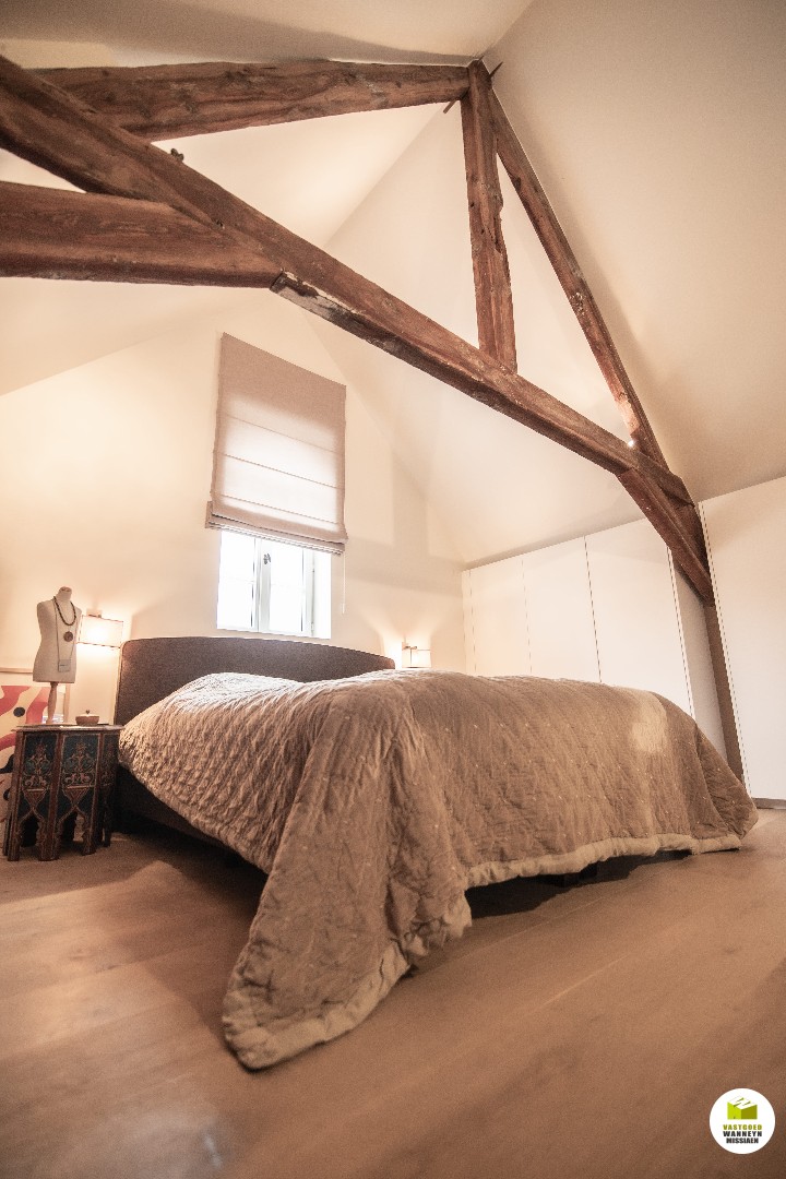 Op de 2de verdieping bevindt zich een ruime slaapkamer met eigen badkamer uitgerust met inloopdouche. De authentieke, gezandstraalde balken maken van deze verdieping een juweeltje.
