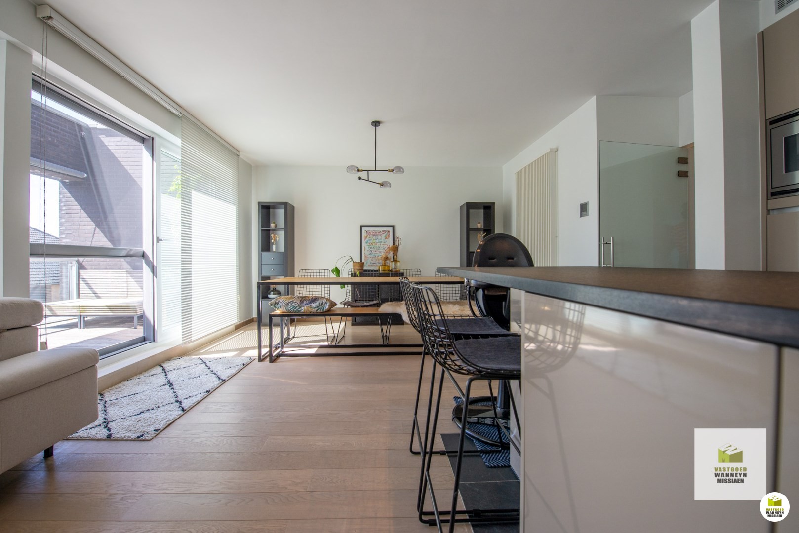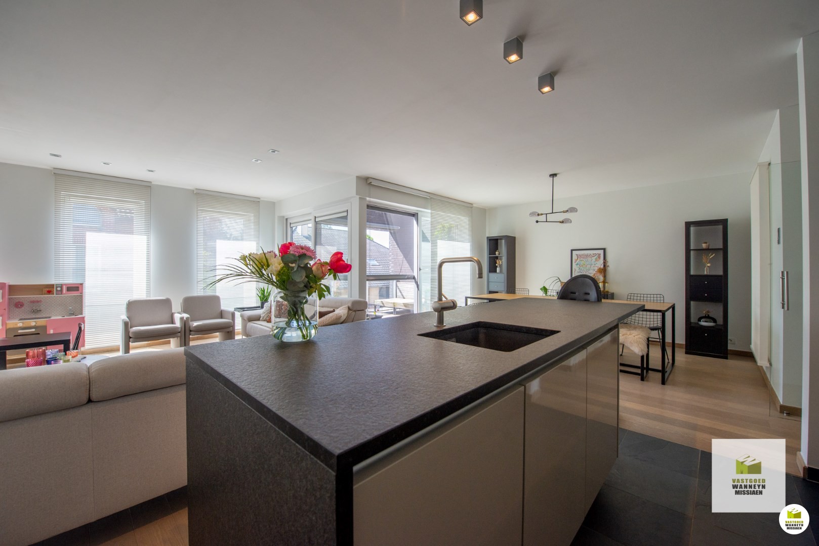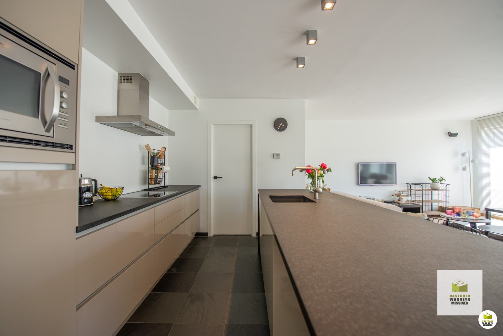 Vervolgens komen we via de glazen deur in de ruime lichtrijke leefruimte met open keuken. De ruimte is opgedeeld in een eetplaats, zithoek en leefkeuken met kookeiland. De keuken met natuurstenen werkblad werd ingericht met alle toestellen om het hedendaags comfort te garanderen: vaatwas, combioven, dampkap, ingebouwde frigo met vriesvak, spoelbak.. Alle toestellen zijn van het merk AEG.