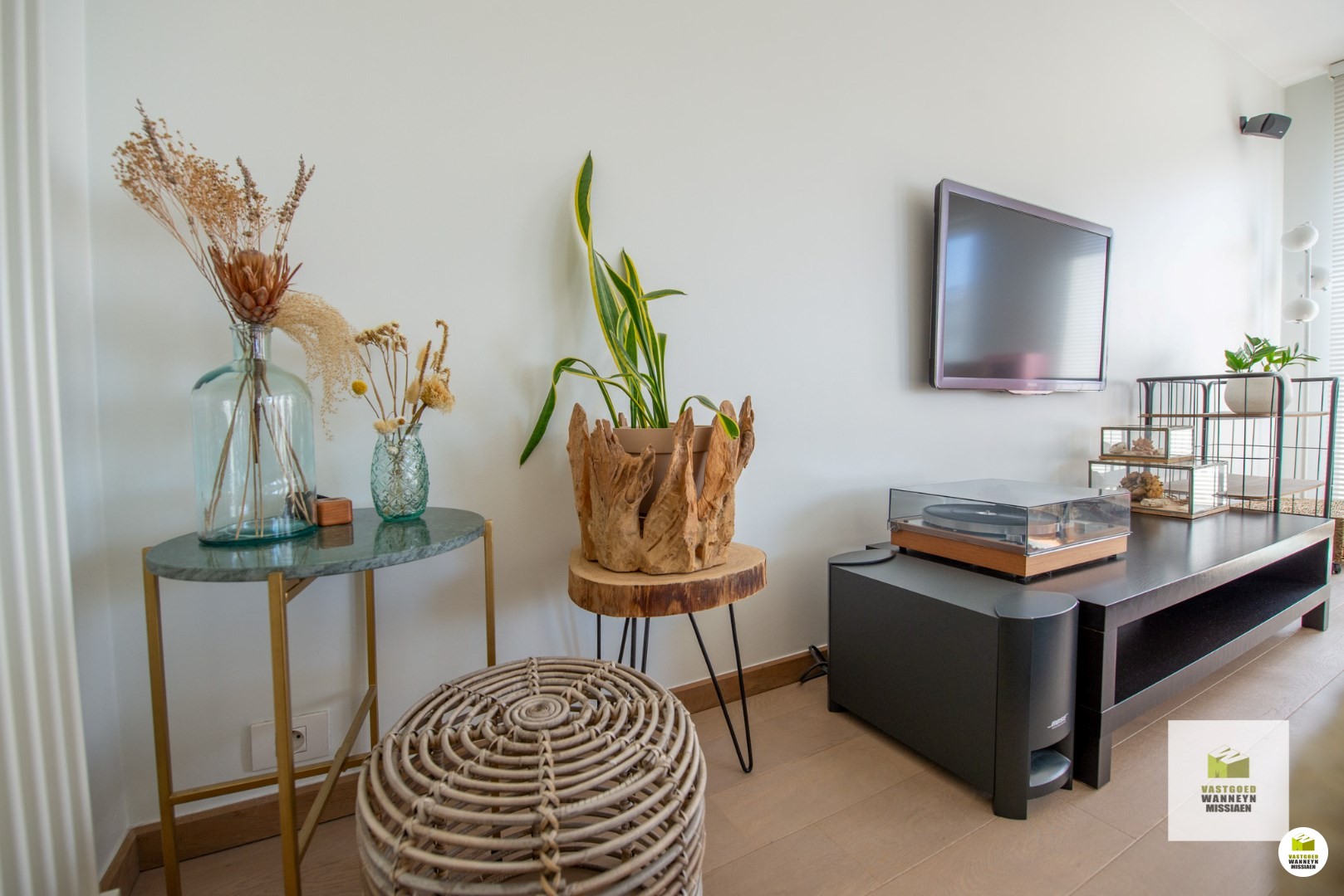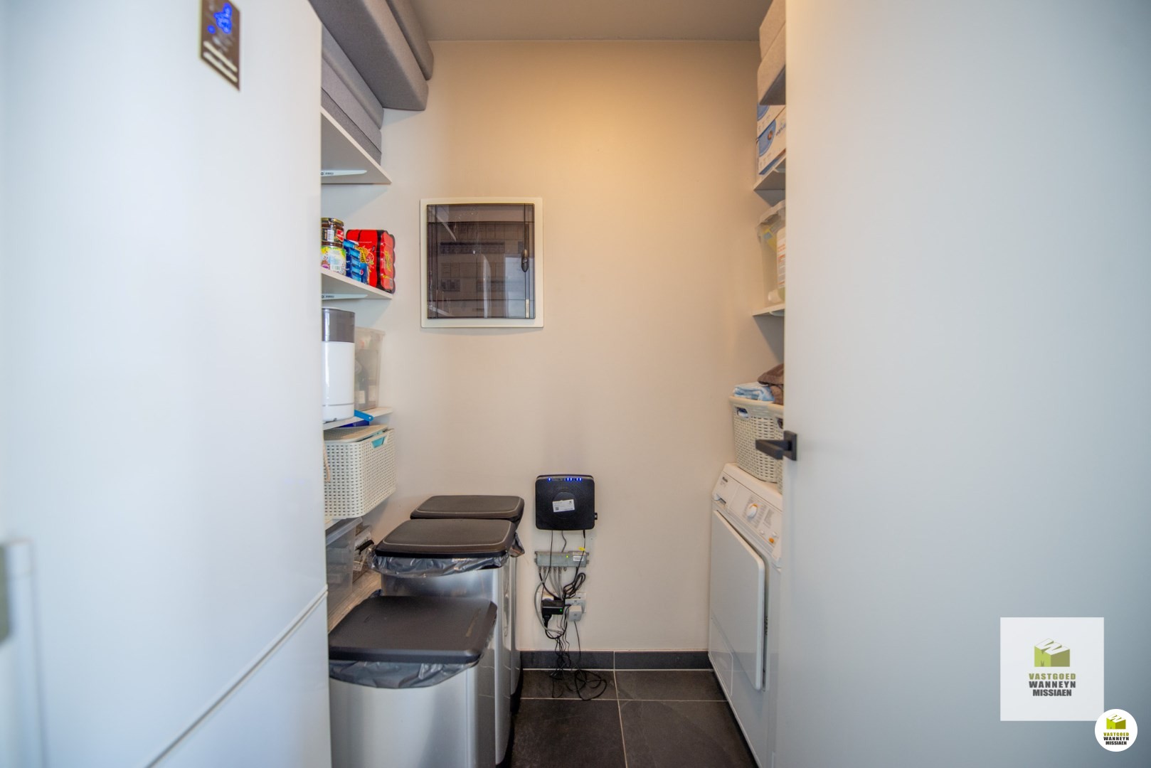 In de leefruimte ligt overal parket en in de keuken een natuurstenen vloer, net zoals in de badkamer, gang, berging en toilet. Palend aan de keuken bevindt zich nog een praktische berging (wasplaats)