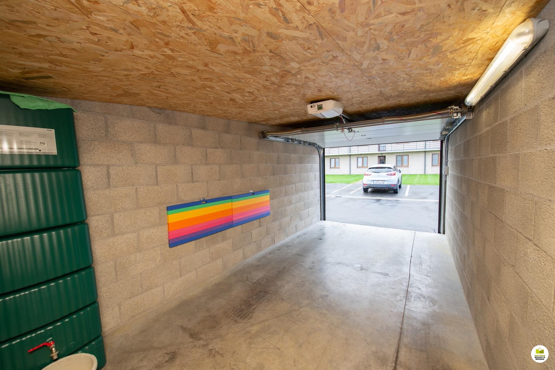 In 1 van de 2 garage's die ze aanbieden vangen ze het regenwater op en staat er een tank van 300l, daardoor is het perfect mogelijk om bv. je auto te wassen op eigen terrein, er is elektriciteit voorzien in de beide garages.
