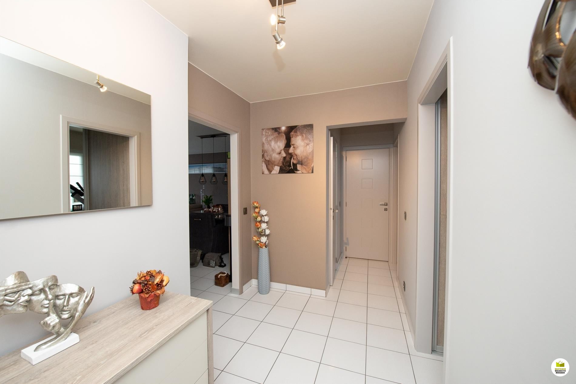 Inkomhal met ruimte voor vestiaire, toegang via een glazen deur naar de woonkamer. De woonkamer is lichtrijk en meet 5 m x 6 m, toegang via een schuifraam naar het balkon (+/- 2 m2), de keuken is halfopen en totaal ingericht met o.a. vaatwas, keramische kookplaat, compacte ontbijthoek.. met aansluitend een geriefelijke berging/wasplaats. De ... slaapkamers bevinden aan de noordelijke kant en zijn beiden ingericht met mooie inbouwkasten. In de eerste slaapkamer staat een dubbel bed met 2 nachtkastjes en een grote op maat gemaakte (kleer)kast. De andere slaapkamer is volledig ingericht met multifunctionele kasten en doet nu vooral dienst als dressing en berging. Er is een gastentoilet met lavabo, mooi betegeld met dezelfde faiences als in de badkamer. De badkamer is modern en ingericht met veel bergruimte, lavabo en grote inloopdouche met een "regendouche" kop. Er dient een garagebox bij aangekocht te worden. (25.000,00 EUR). Indien gewenst kan er zelfs een tweede garagebox bij aangekocht worden.