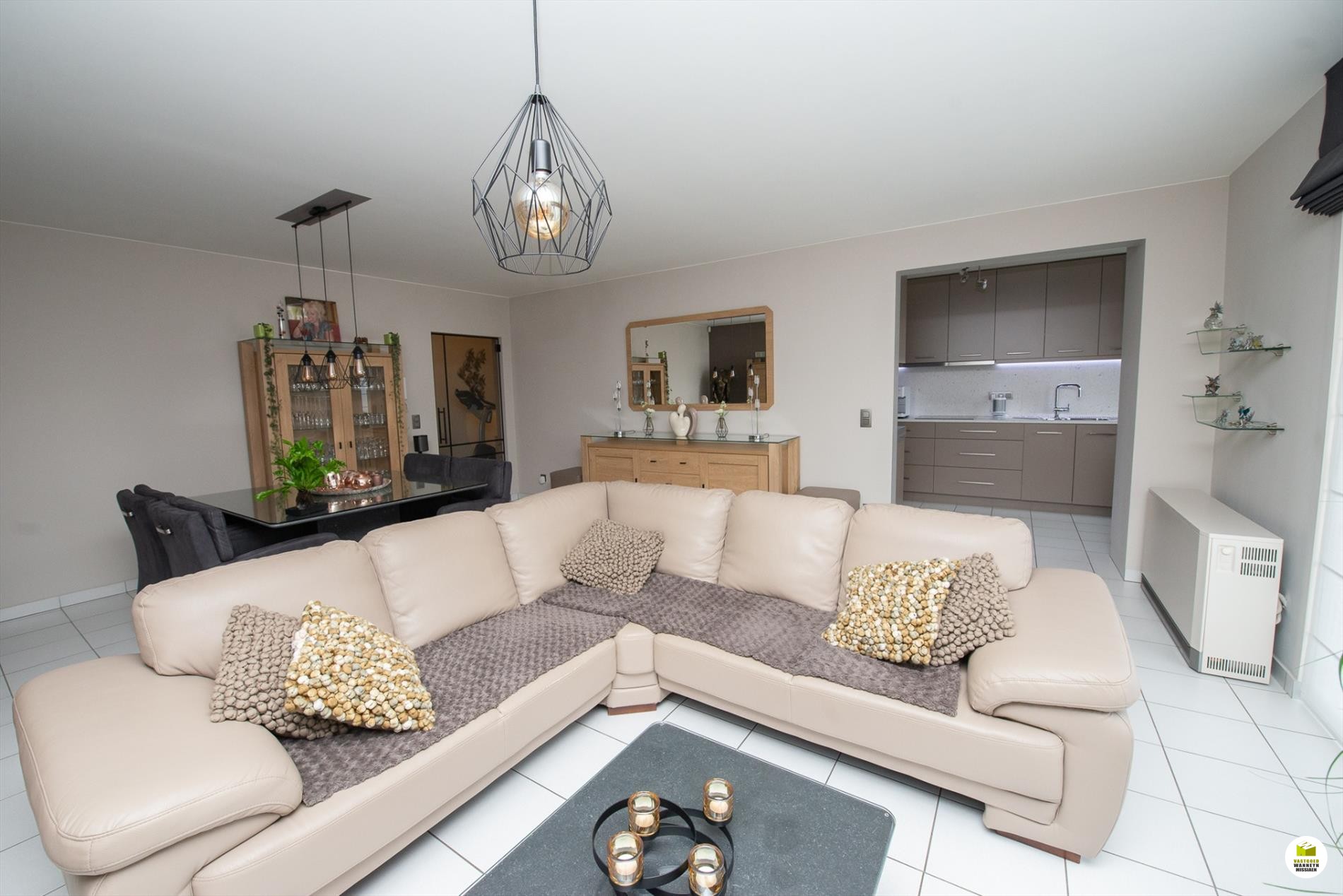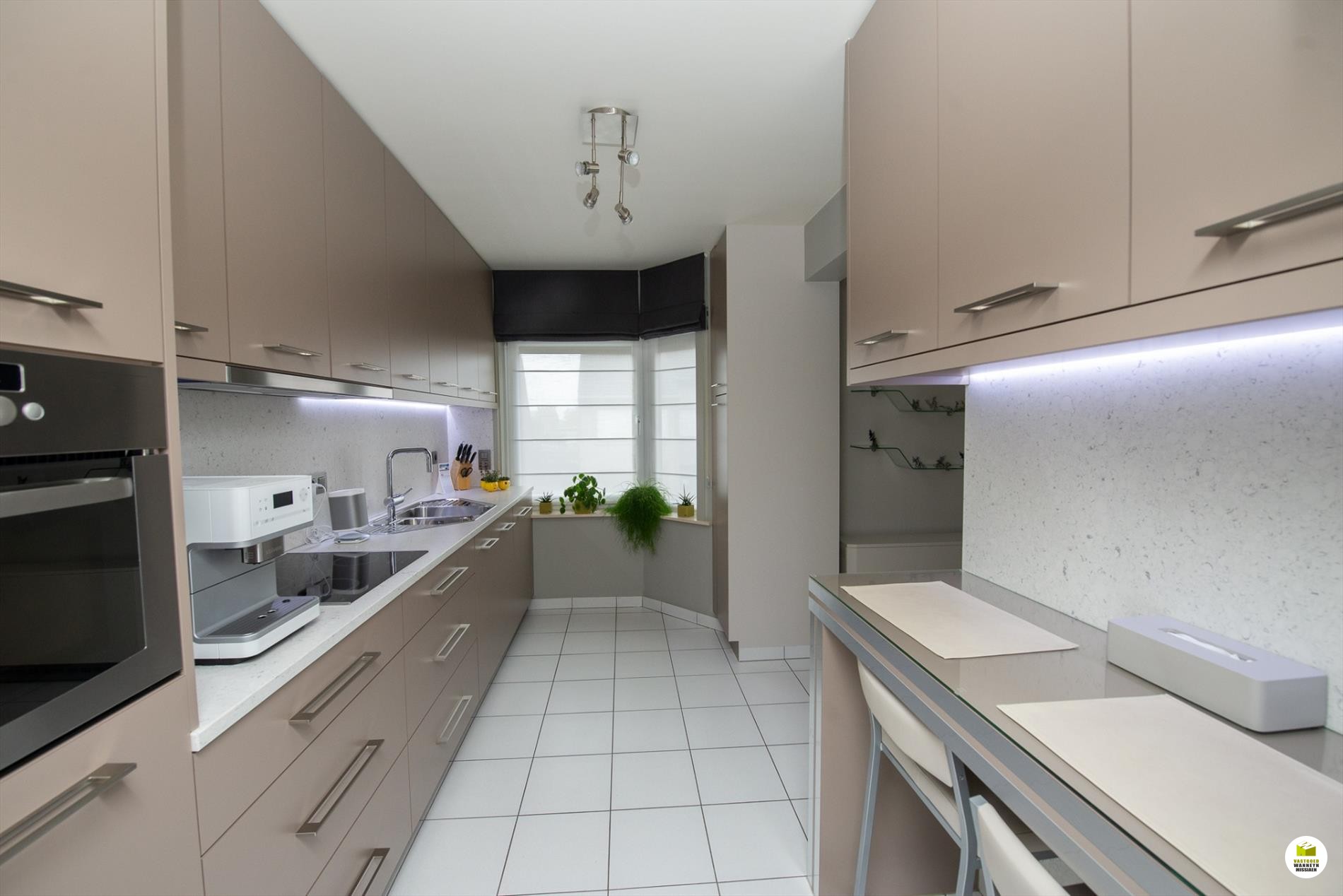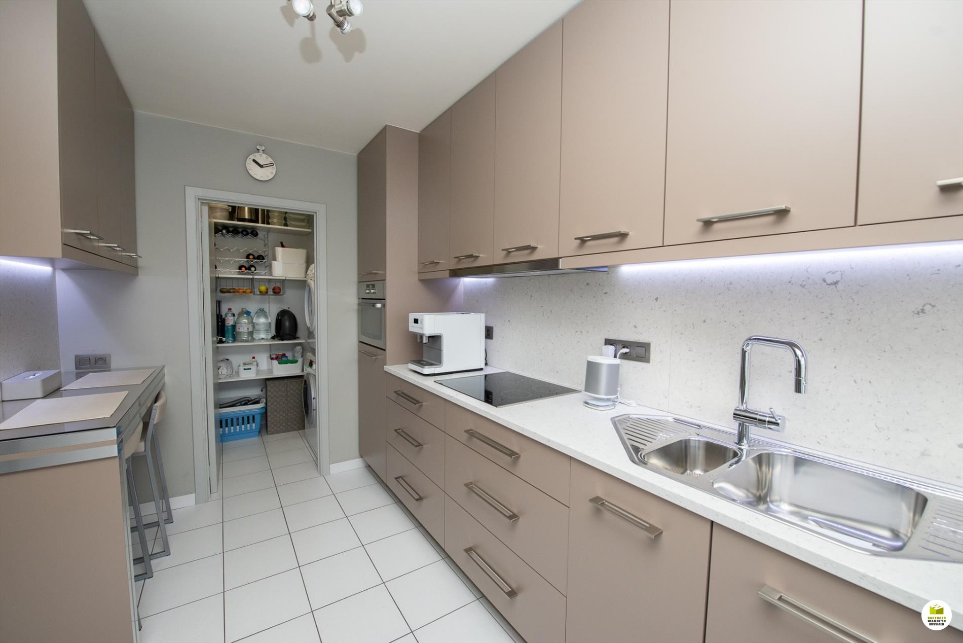 + Volledig ingerichte klassevolle keuken met o.a. composiet werkblad, indirecte verlichting, veel kasten,..