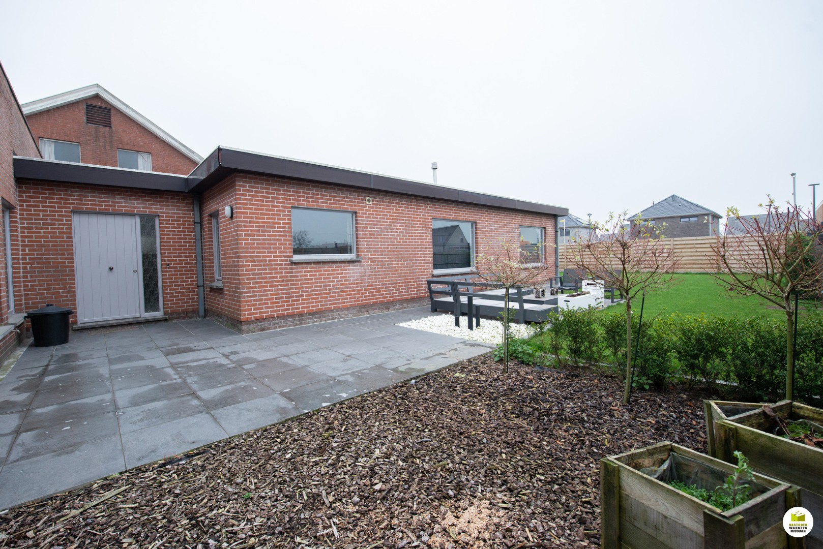 Achteraan zijn er nog 2 garages (50m2) en een strookje tuin. Er is een groot deel verhard, ideaal voor extra parking op stockageruimte.