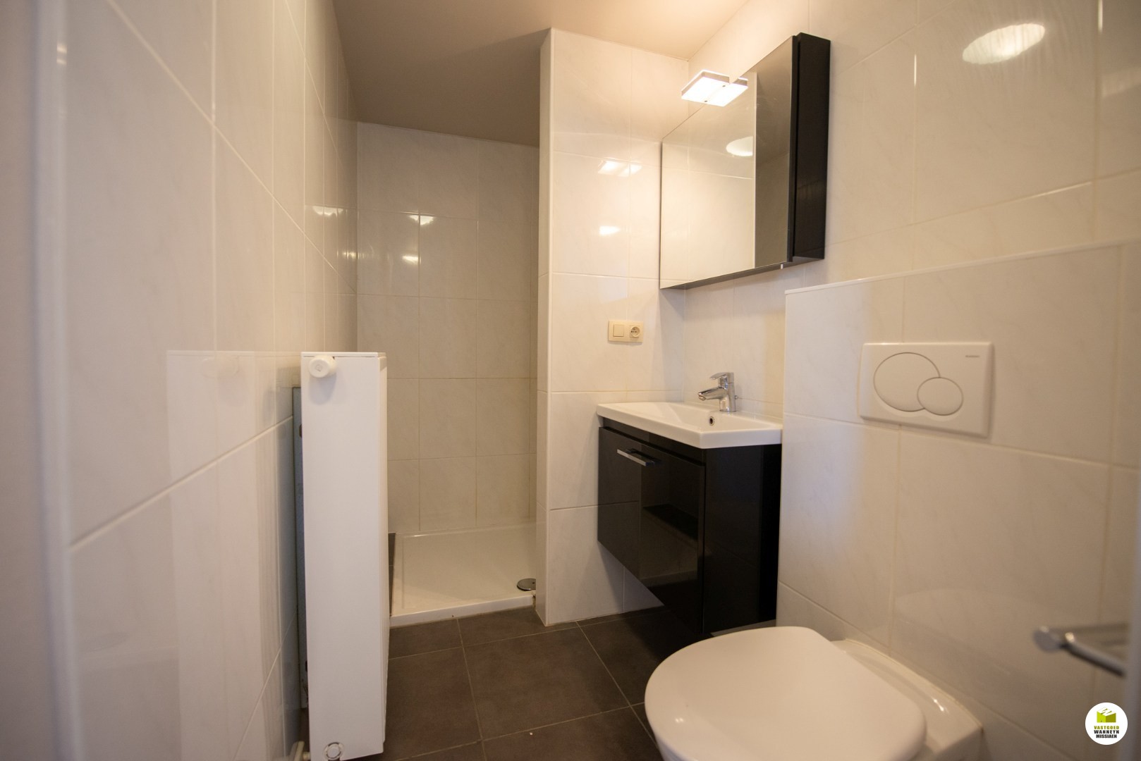Indeling: Leefruimte met terras, aansluitend de open keuken die praktisch is ingericht en uitgebreid werd met ingebouwde kasten. Hierachter ligt de slaapkamer die afgesloten kan worden van de wasplaats en badkamer met een schuifdeur. In de wasplaats is voldoende plaats voor de wasmachine en droogkast. De badkamer beschikt over een toilet, lavabo en ruime douche.