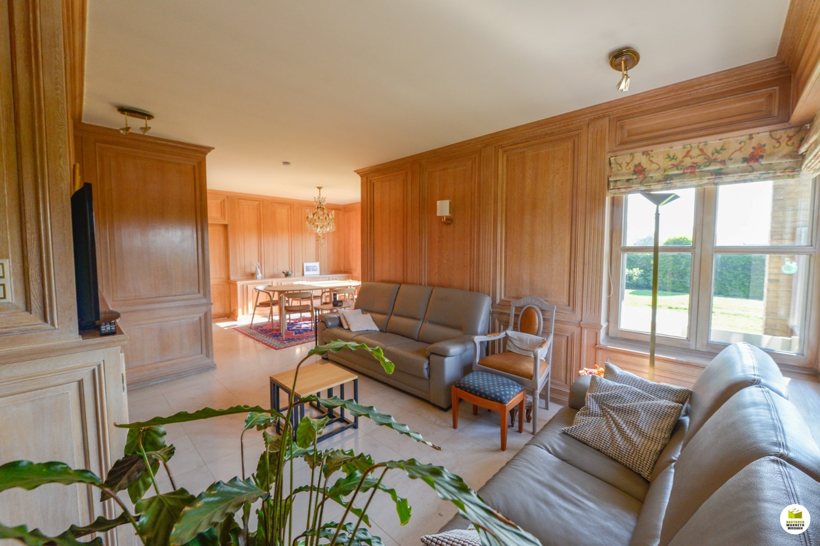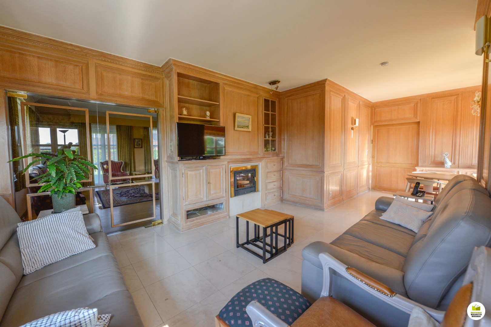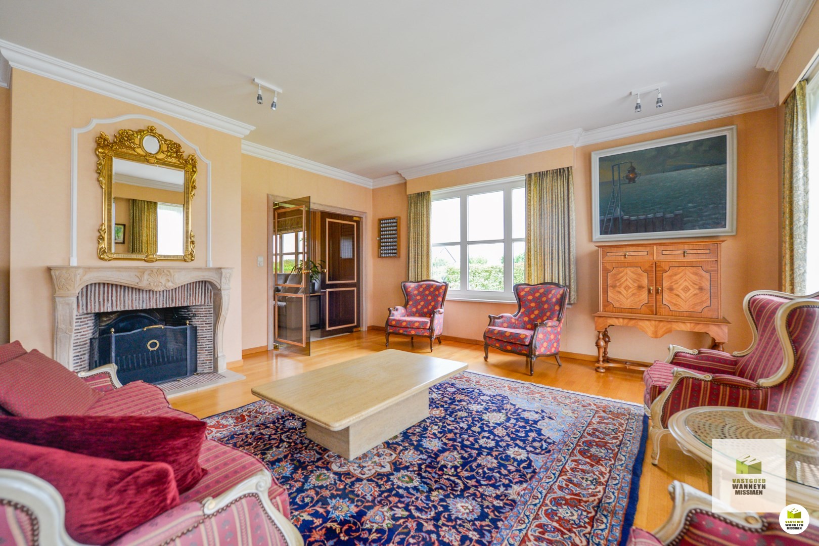 Bij binnenkomst in de ruime hal met gastentoilet, vind je direct rechts de eerste woonkamer van maar liefst 40 m² met veel ramen, daardoor heb je mooi uitzicht op de zuid west gerichte tuin. Deze ruimte is voorzien van een opvallende originele witstenen open haard, men koos hier destijds voor een warme massieve parketvloer. Een leuk familie-weetje: hier stond er nooit een TV, dus hier werden er gezelschapspelen gespeeld, werden gesprekken gevoerd, werden boeken gelezen, .. want ze hadden een twééde woonkamer waar de Tv stond. Dit kan heel gemakkelijk zijn voor grotere gezinnen, waar iedereen zijn eigen plekje kan vinden. In de tweede woonkamer werd er Tv gekeken en kon men vanuit hier naar de tuin. Er is een overdekt terras met een windwand waardoor je op gelijk welk moment van de dag al in de tuin kunt zitten. Deze tweede living meet 25 m2. Tijdloze lambrisering maakt deze ruimte ... knus en klassevol.