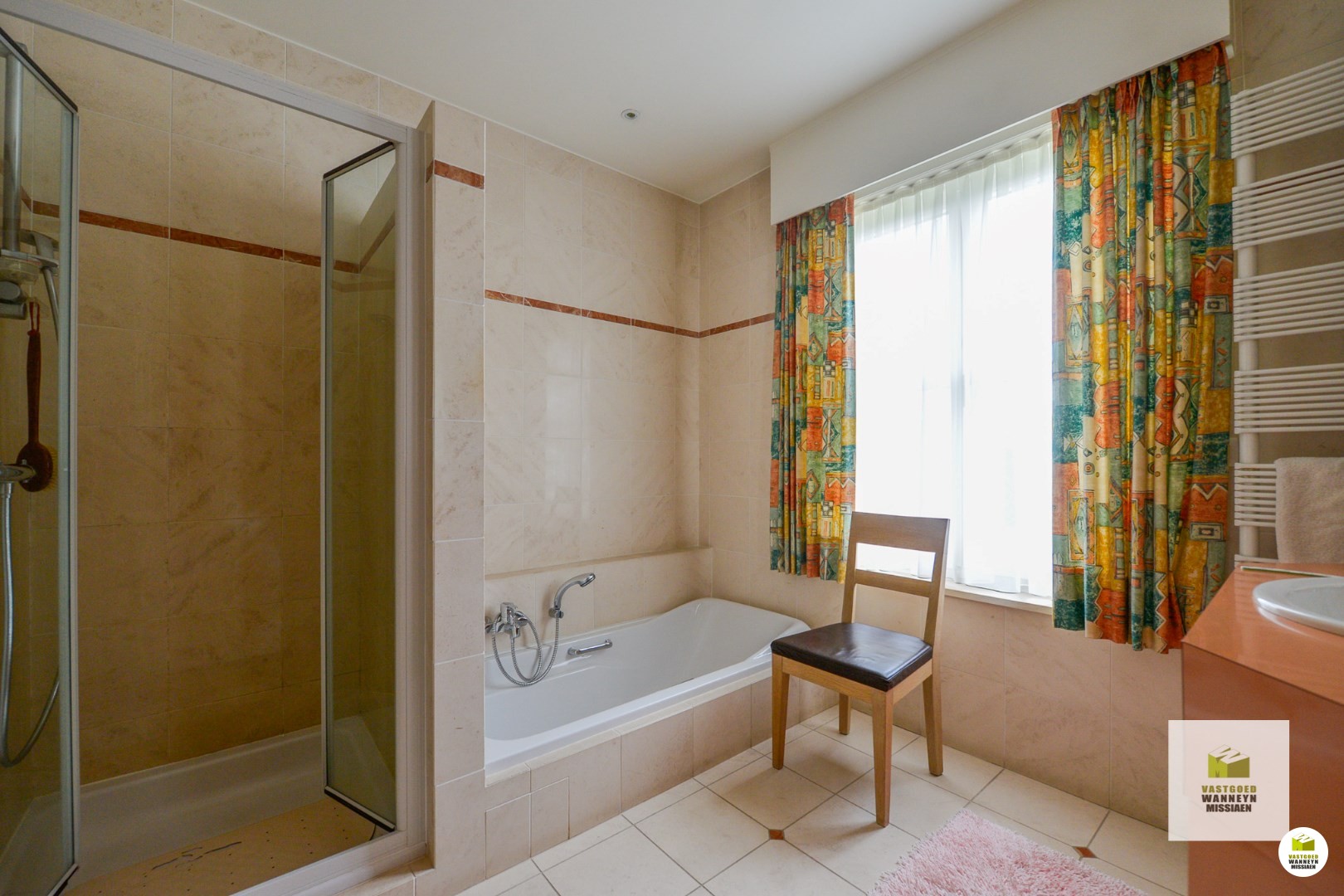 1 slaapkamer bevindt zich gelijkvloers, net als de eerste badkamer die voorzien is van een douche en een verzonken ligbad. Deze twee ruimes zijn ook bereikbaar vanuit de inkomhal, daardoor kan dit ook bekeken worden als een