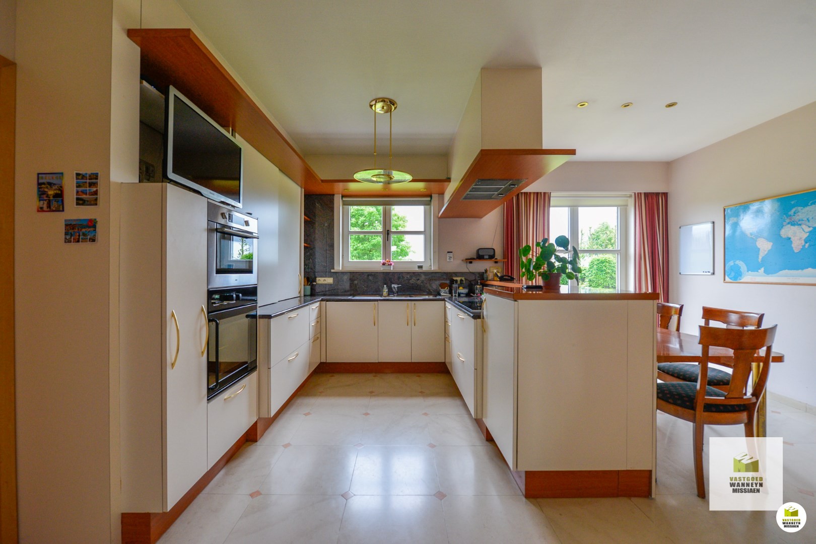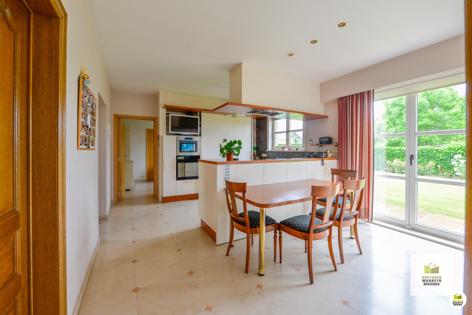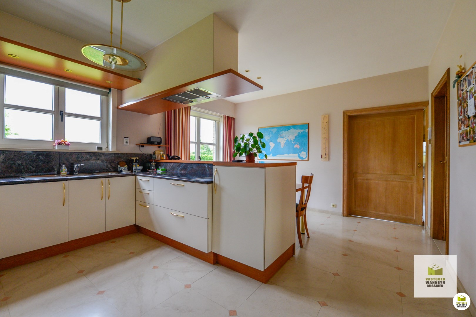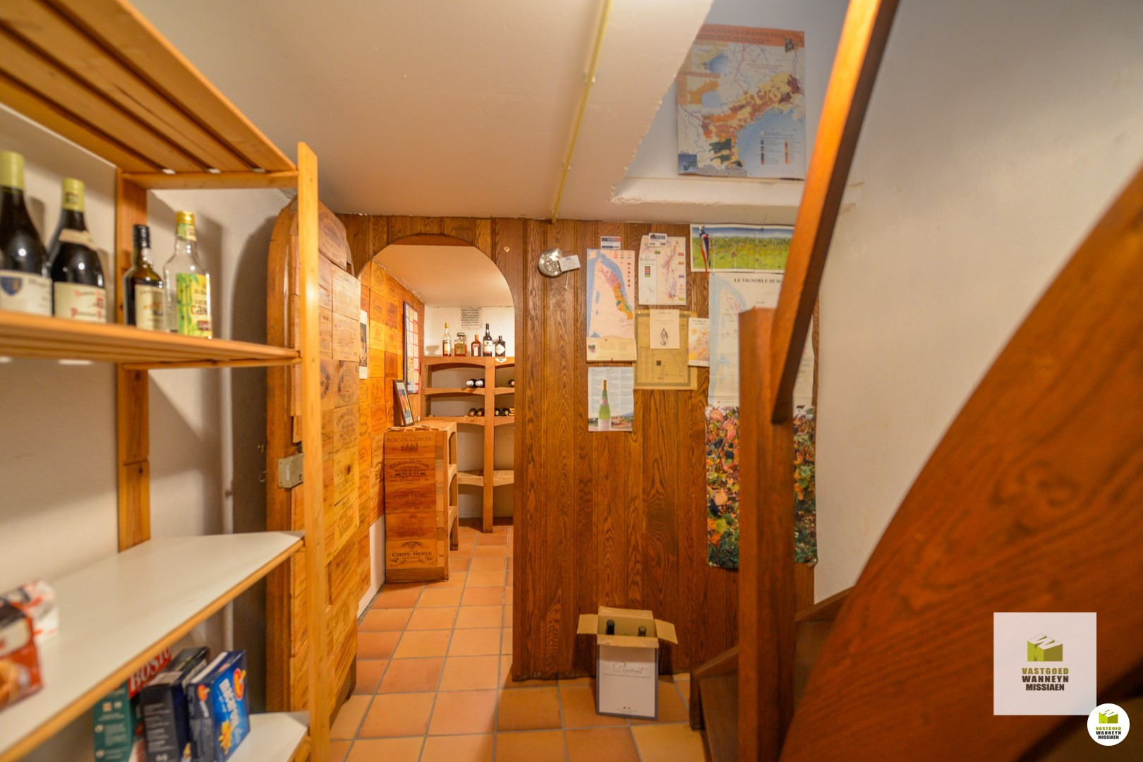 De keuken is aansluitend gelegen maar wel afsluitbaar door een schuifwand, en daardoor dus perfect als dé centrale ontmoetingsplaats. In de keuken kan er een groot gezin eten. Vanuit de keuken bereik je de wijnkelder, de rekken zijn "eigen makelij" maar brengen ook hier extra cachet. Naast de keuken vinden we de wasplaats met veel bergruimte en aansluitend, de dubbele garage die voorzien is van nog meer inbouwkasten. Er zijn 2 automatische poorten en een aparte nis voor papier, leeggoed, vuilbakken, poetsgerief,.. De tuin is netjes onderhouden en beplant met seizoensbloemen, planten en diverse terrassen. Er is veel parkeergelegenheid door de grote oprit. Er is nog een tuinhuis van +/- 50 m2. Achter het tuinhuis is er nog een kippenpark en een plek voor een grote moestuin, een tuin om te ravotten, etc..