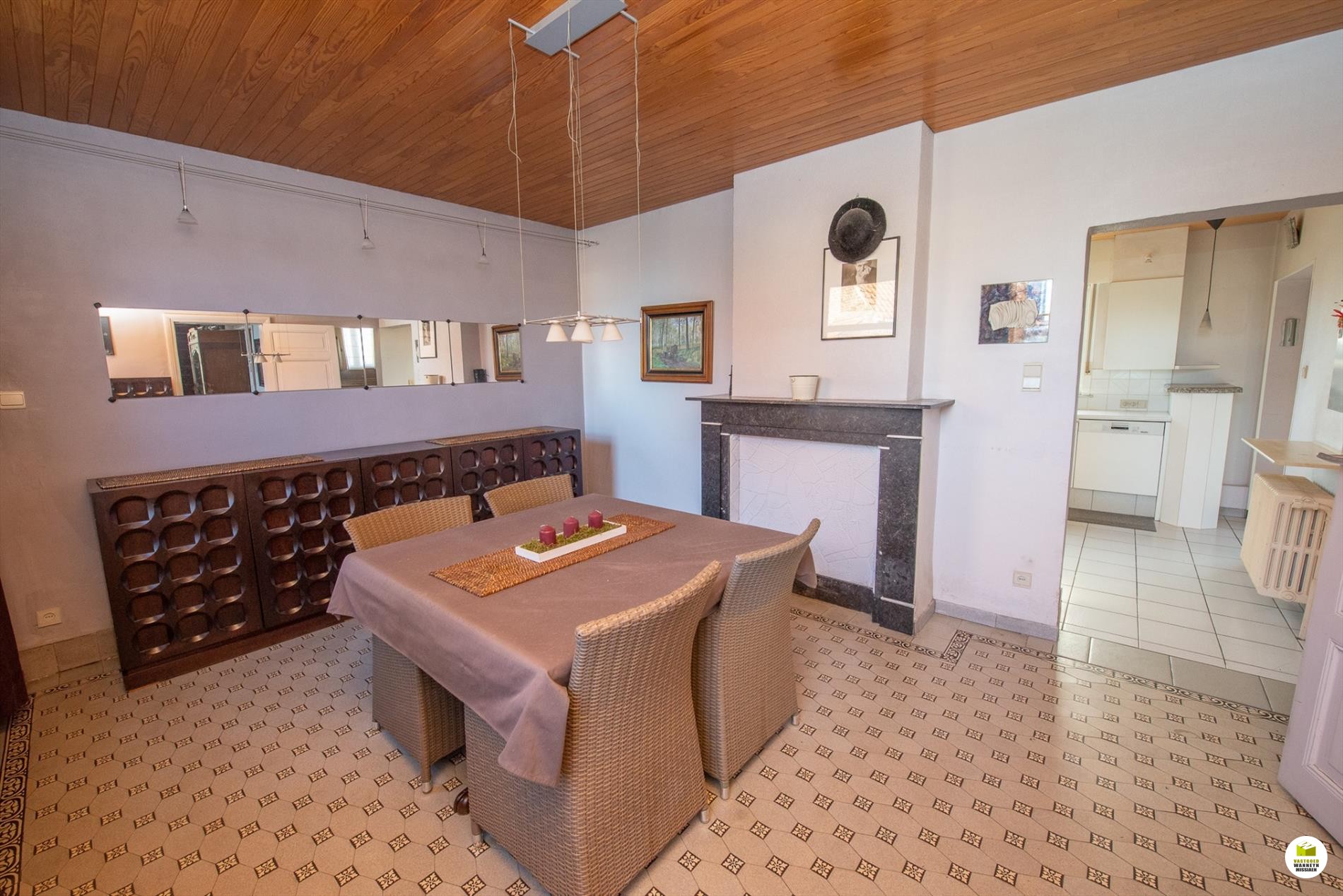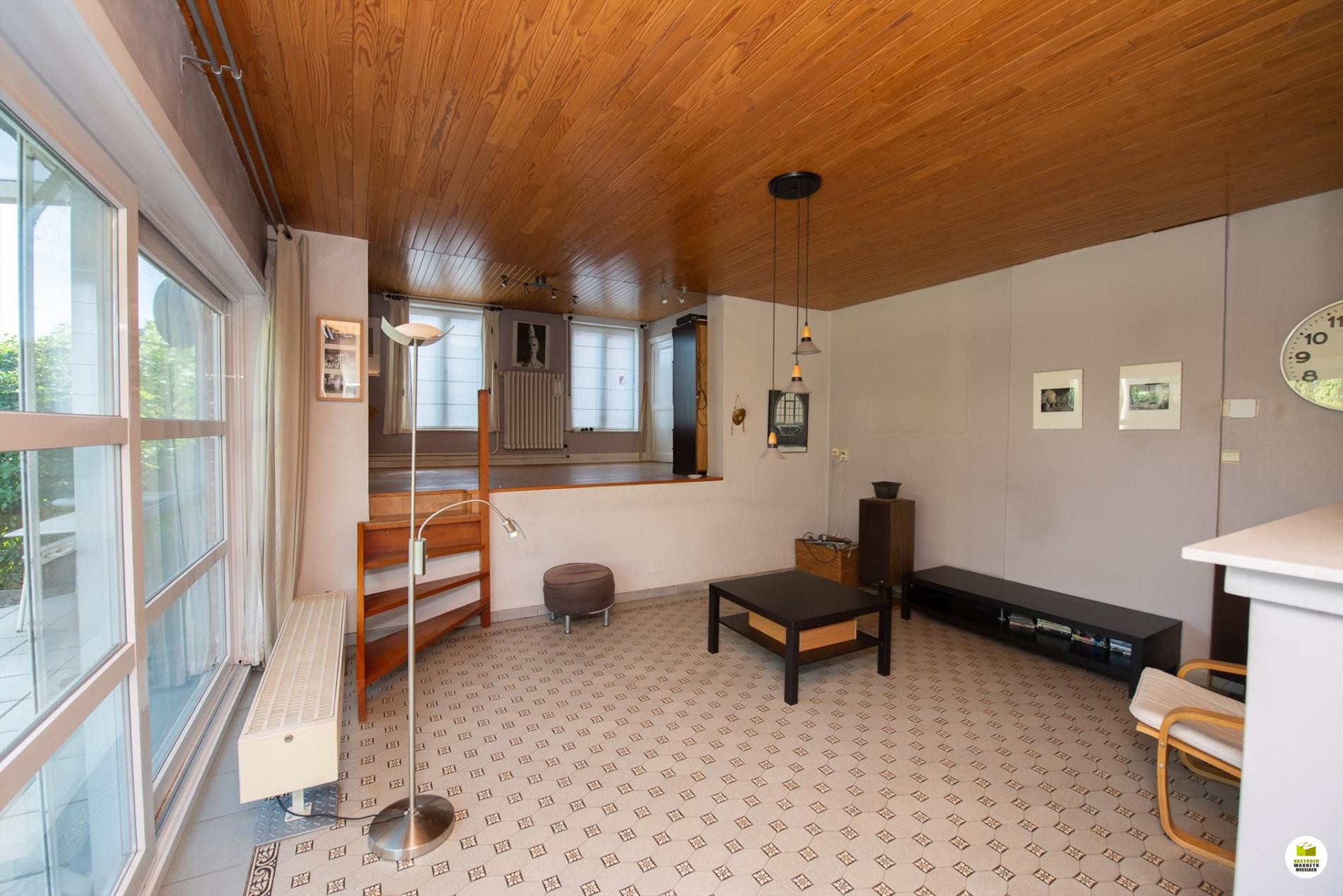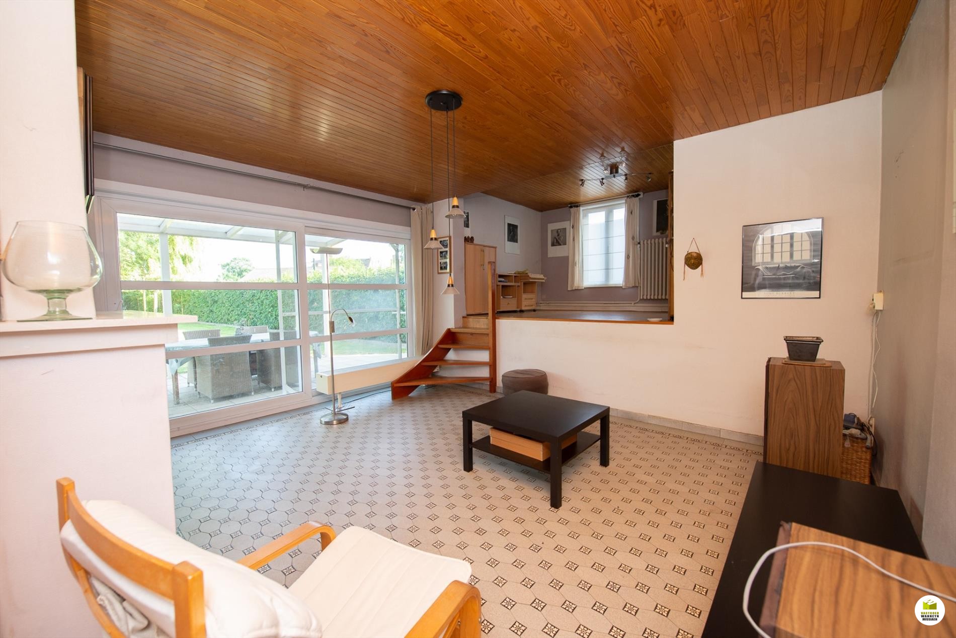 Inkomhal met toilet, meteen rechts de wasplaats en de ... kelder. Links is er een voorplaats, ideaal voor iemand die een praktijkruimte zoekt, de hal is ruim genoeg om een wachtplaats te maken. De voorplaats wordt nu gebruikt als eethoek. De woonkamer is gericht naar de tuin en voorzien van een schouwkanaal. (open haard mogelijk). Met een schuifraam bereiken we de tuin en het overdekt terras. Optimaal lichtinval door goede oriëntatie van het huis/tuin (zuid). De keuken (voorzien van Miele toestellen en inductiekookplaat, nieuwe frigo) kijkt ook uit op de tuin.